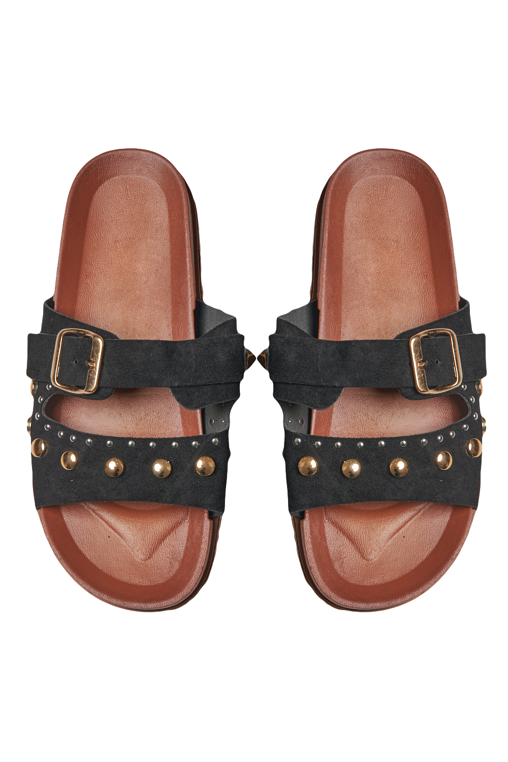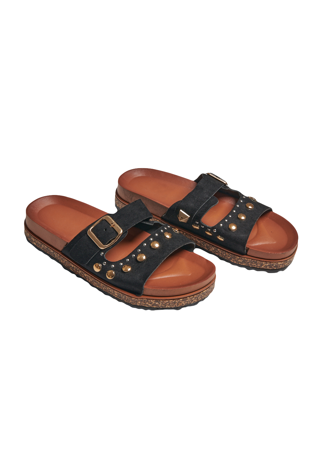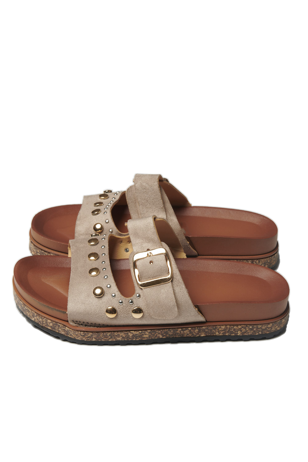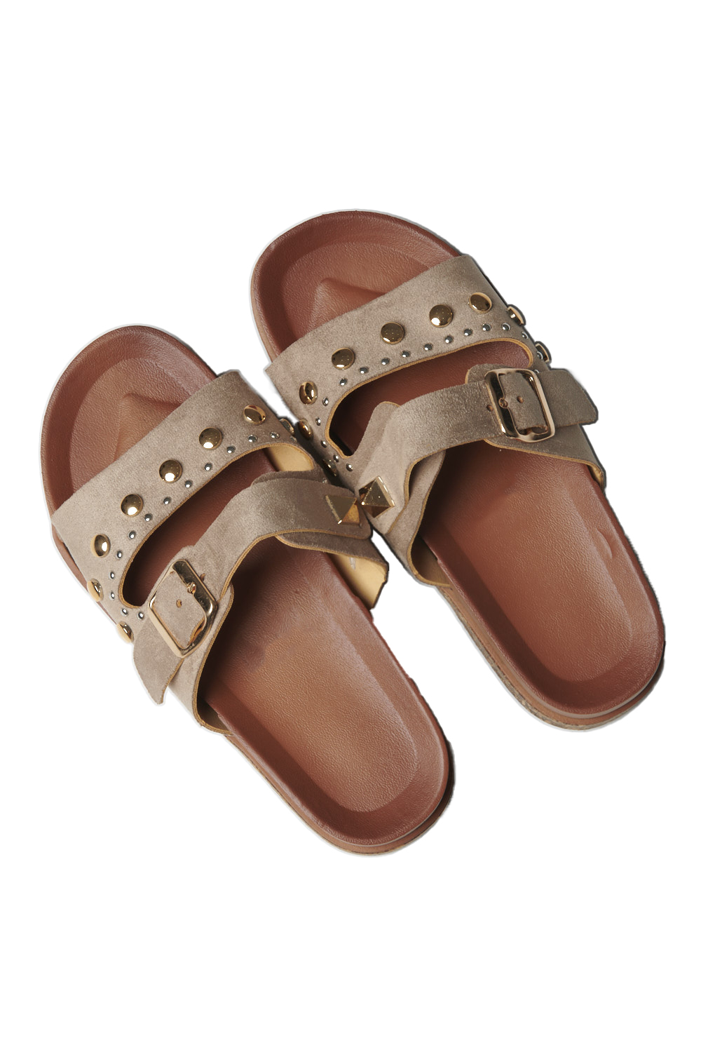 Sandalia de piso con tira frontal amplia y detalle de estoperoles, correa superior con hebilla ajustable, plantilla cómoda con acabado suave, suela ligera y resistente