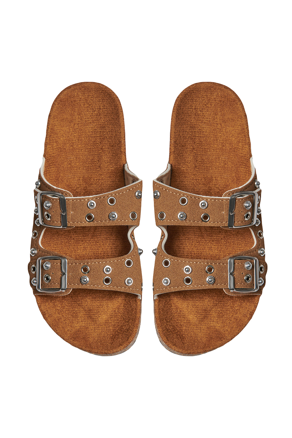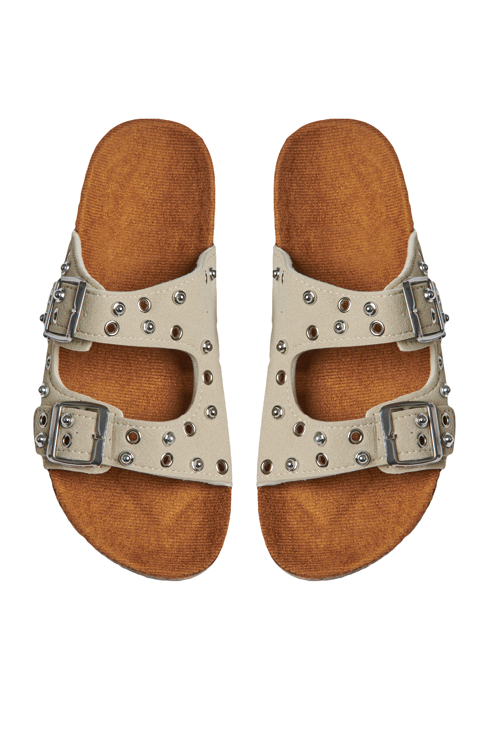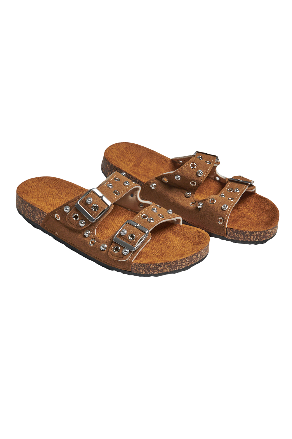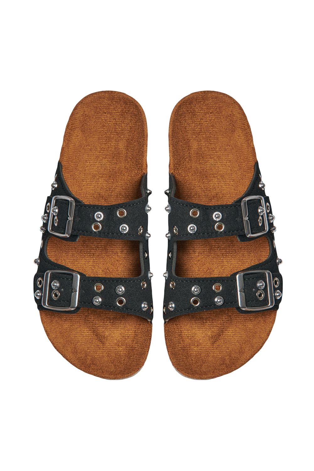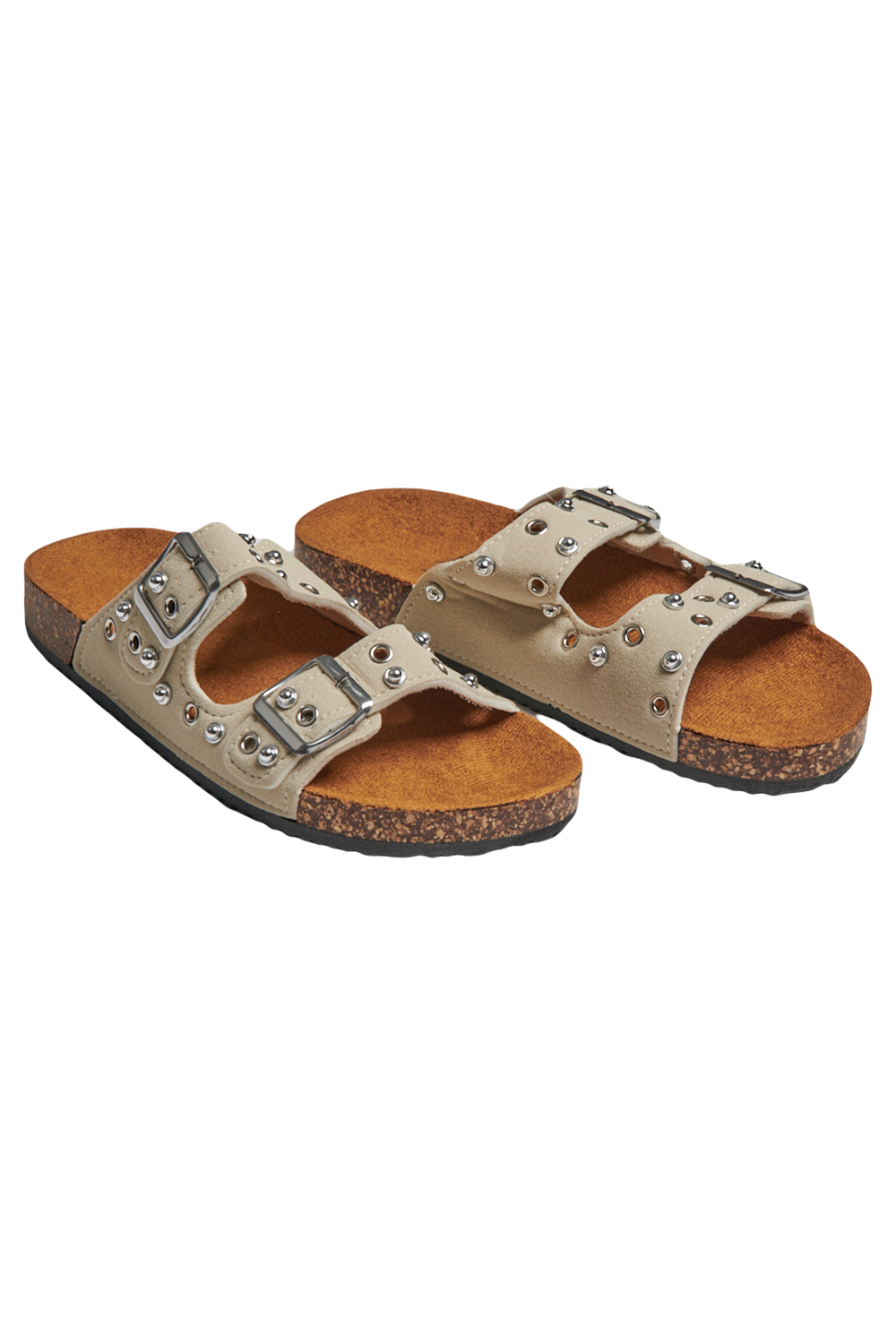 Sandalia de piso con tira frontal amplia y detalle de estoperoles, correa superior con hebilla ajustable, plantilla cómoda con acabado suave, suela ligera y resistente