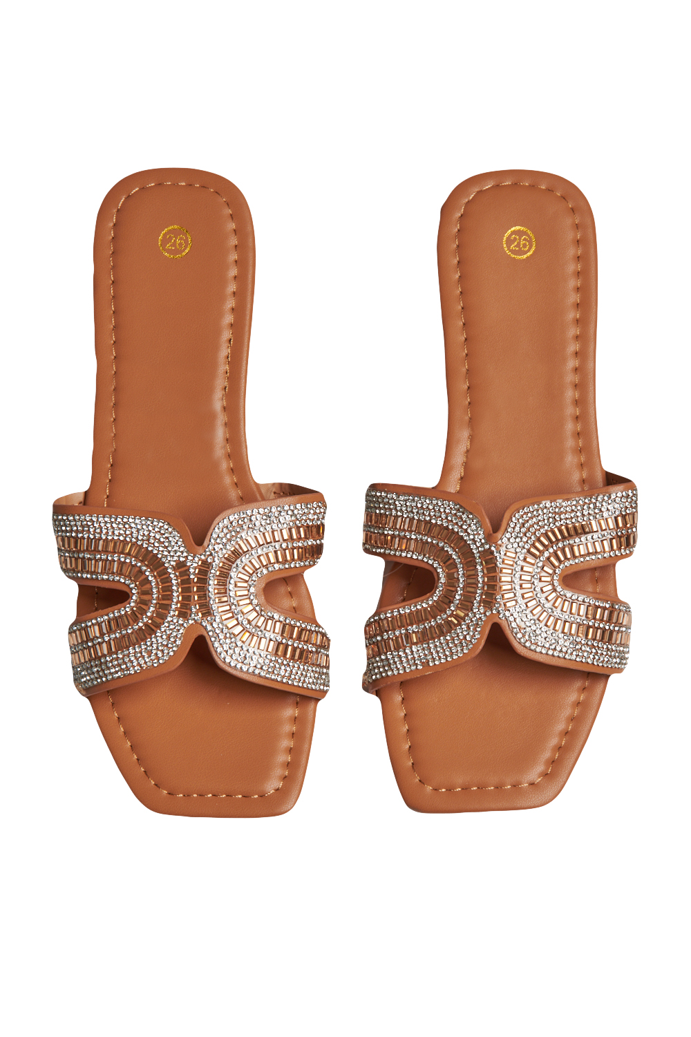 Sandalia de piso con tiras decoradas, aplicaciones brillantes, plantilla acolchada, suela flexible, acabado detallado