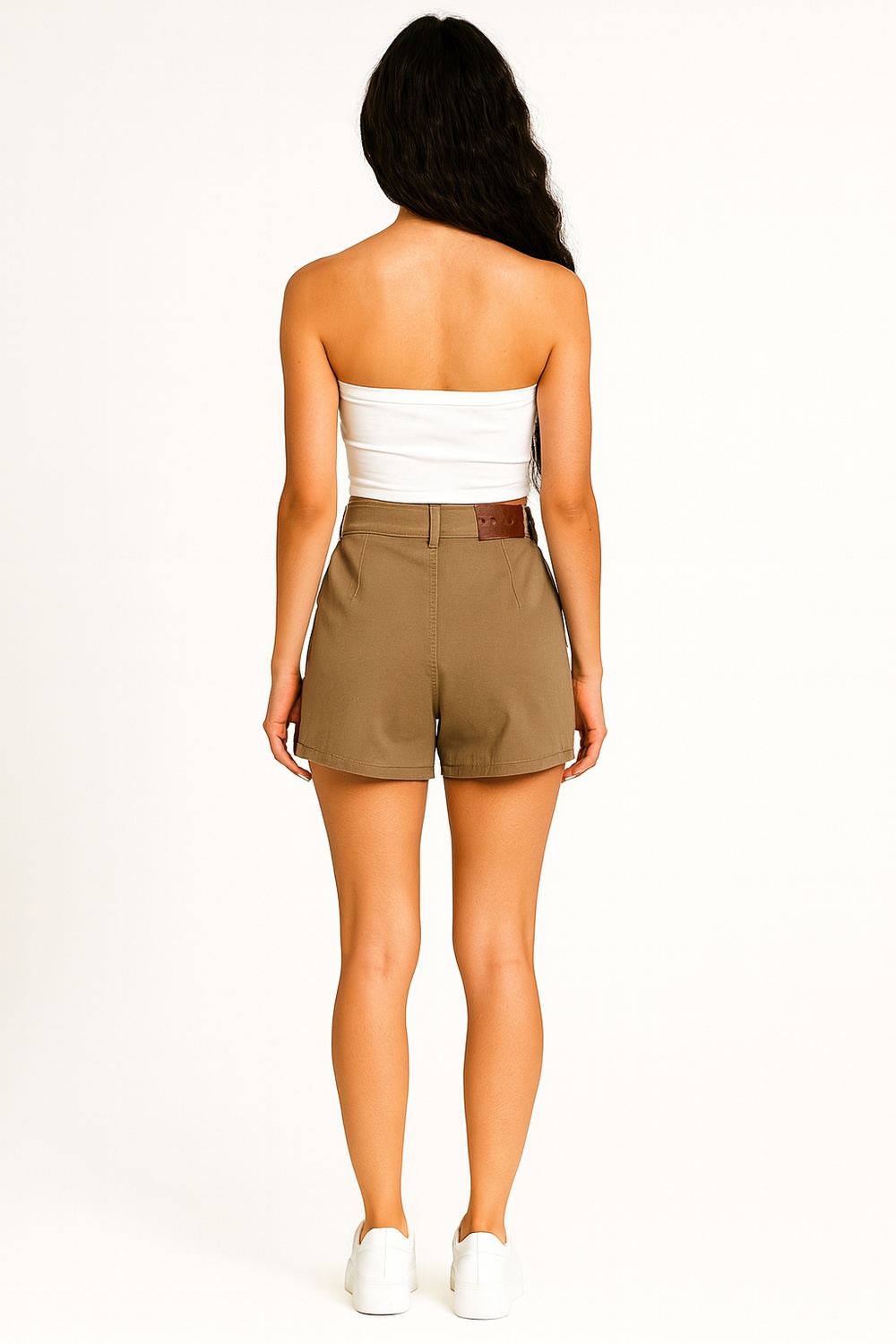 Short de mezclilla tiro medio, pretina delgada con trabas, botón, zipper, bolsas laterales más bolsas cargo y pespunte contraste