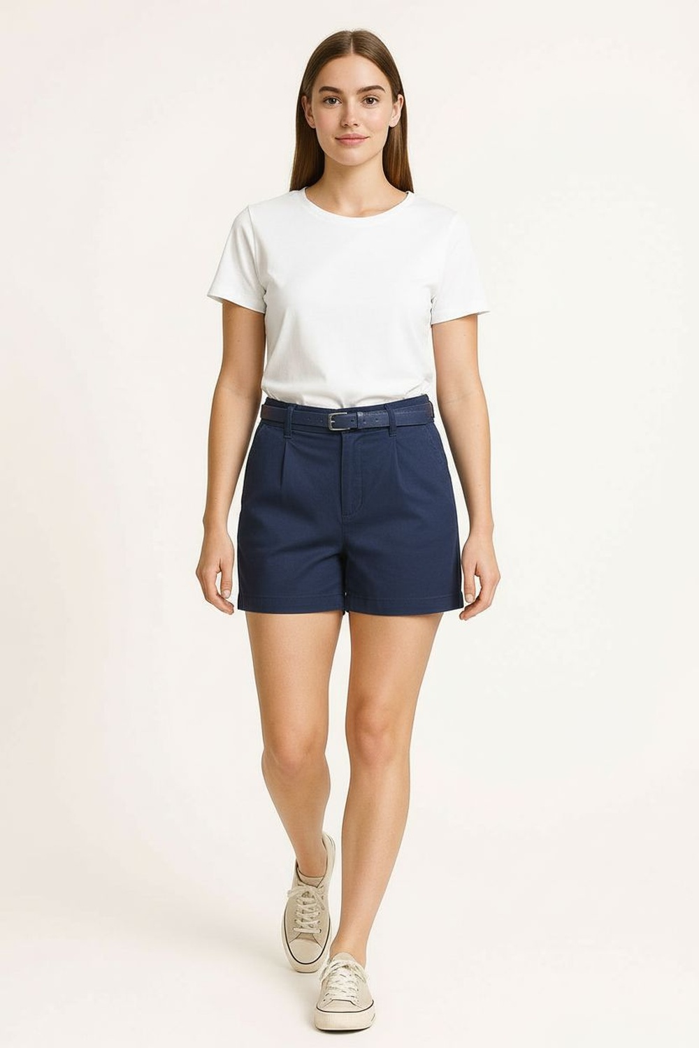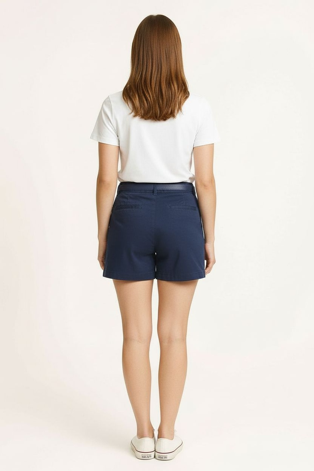 Short de tiro medio con estructura firme que mantiene el ajuste, pretina con presillas y cinturón integrado para mejor sujeción, bolsillos laterales y posteriores funcionales, cierre frontal con botón y cremallera, largo arriba de la rodilla que aporta practicidad diaria