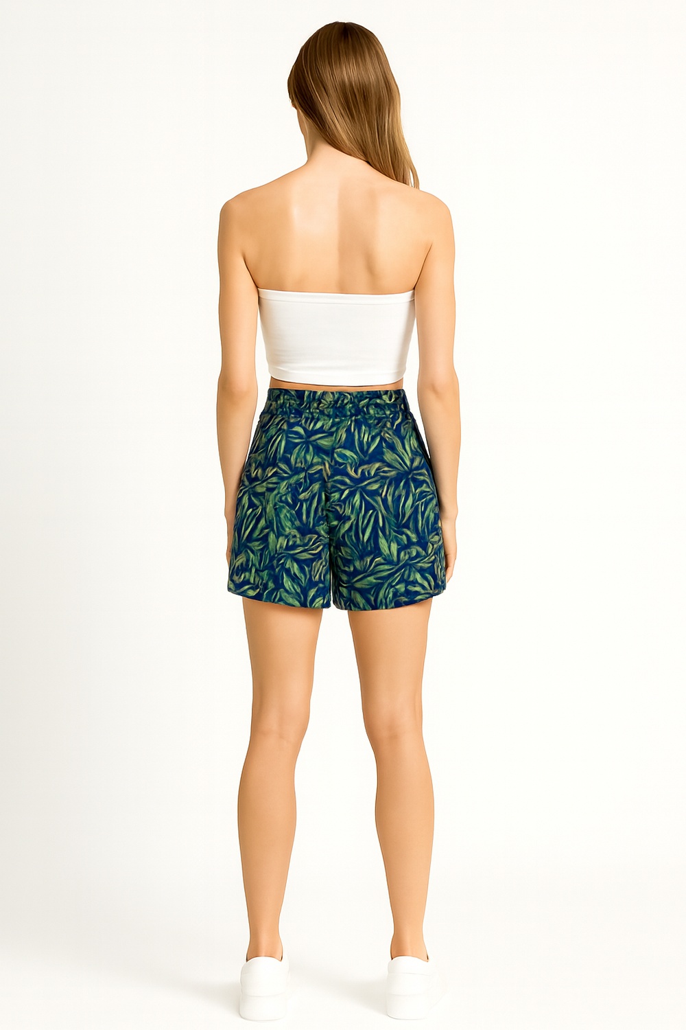 Short tipo valenciana con bolsas laterales y cinturilla con cinta anudada al frente que define la silueta con un toque femenino ideal para lograr looks relajados y pulidos
