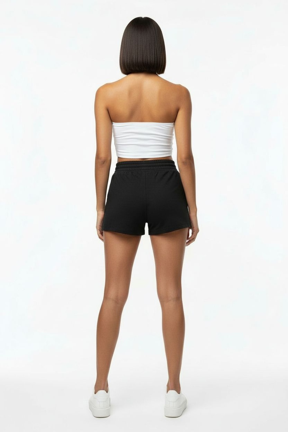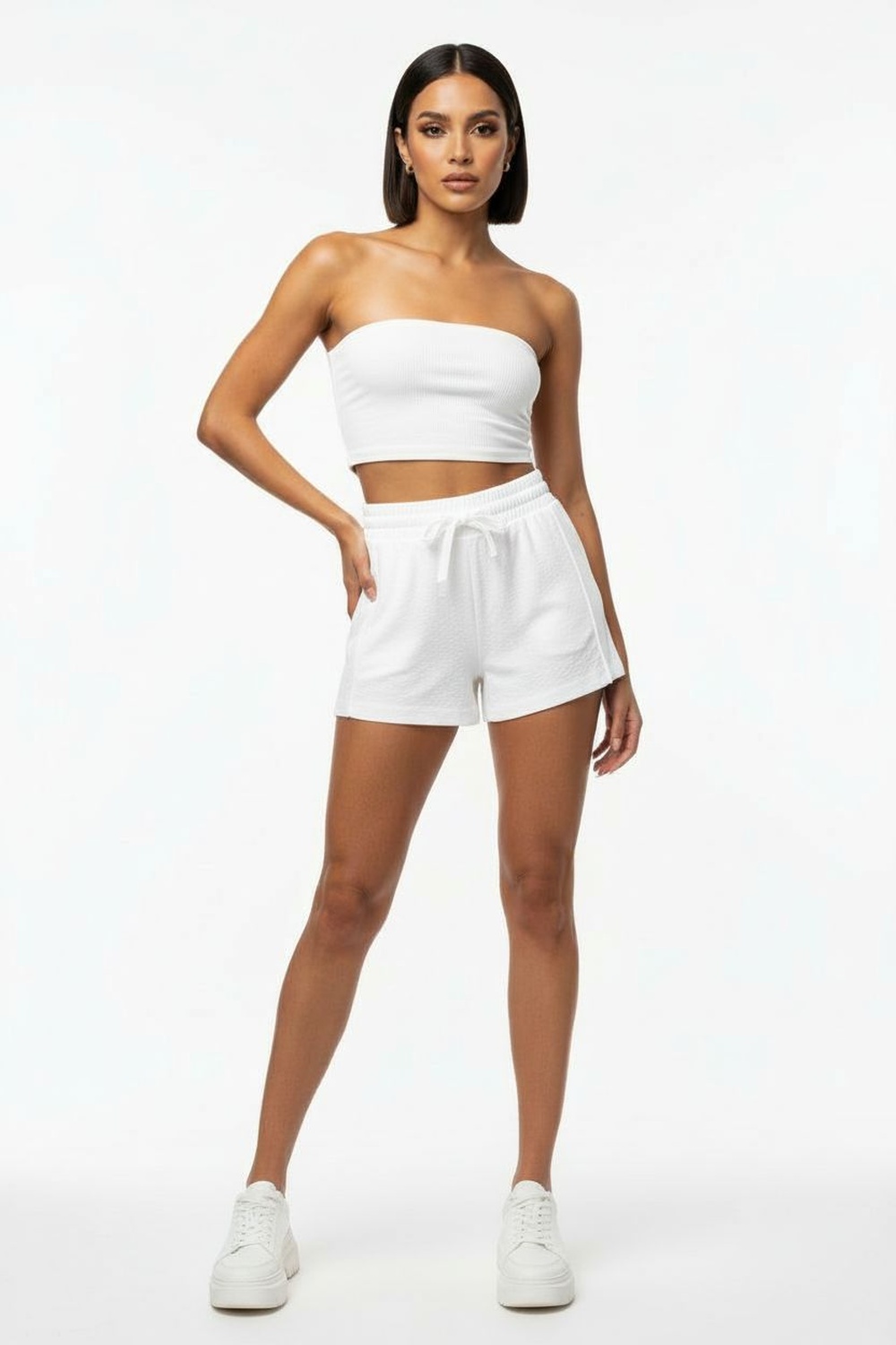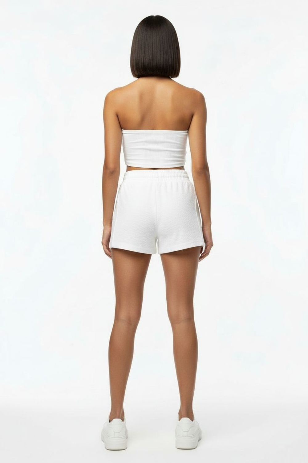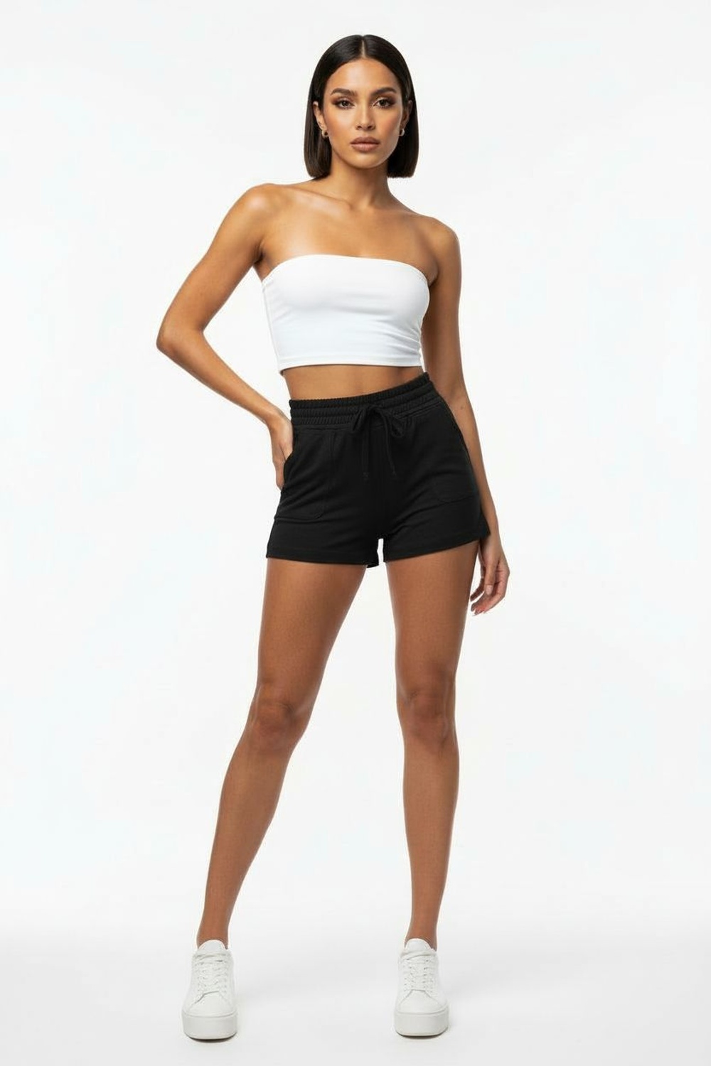 Short con cintura elástica tipo smock, jareta ajustable al frente, bolsas laterales, corte amplio, tiro medio, acabado ligero