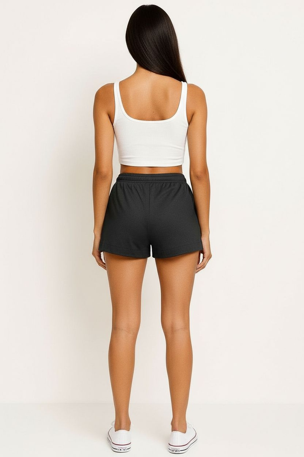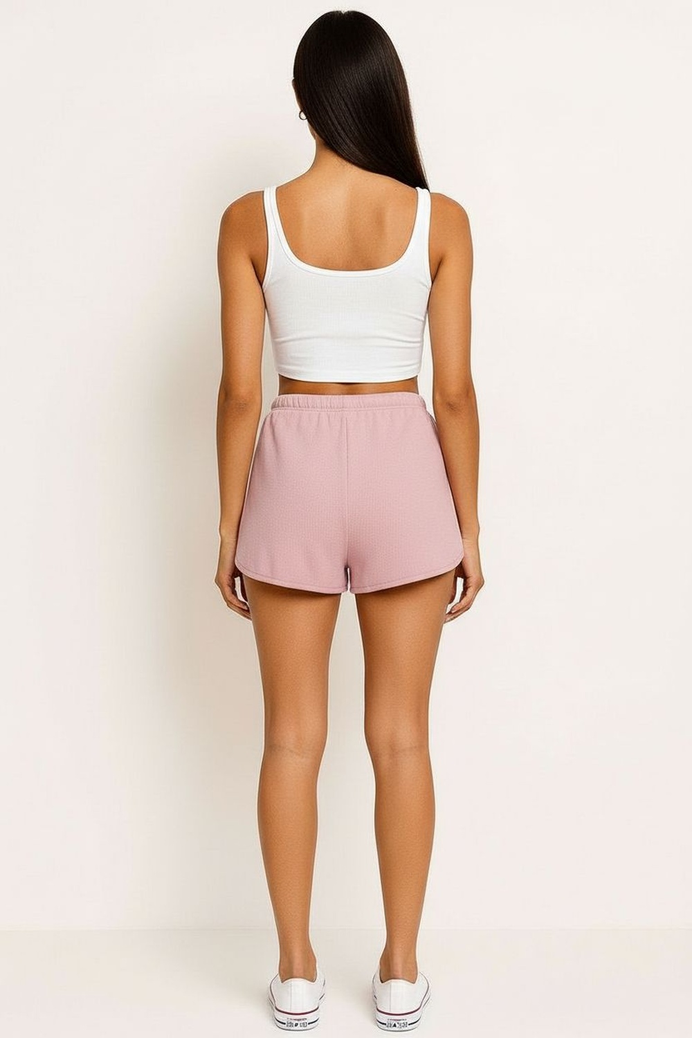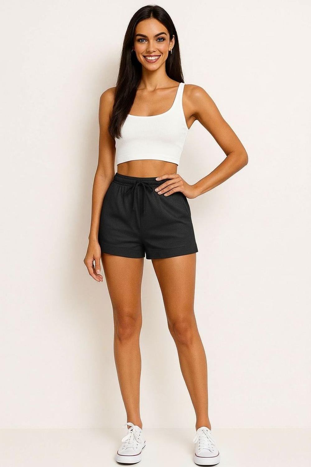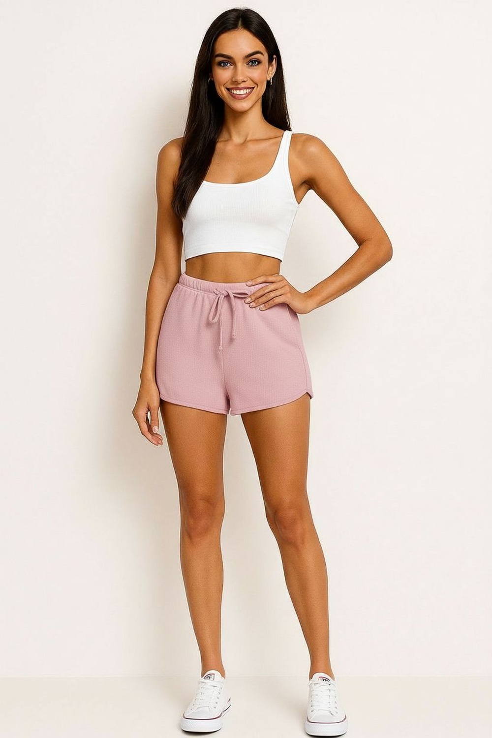 Short de tiro alto con pretina ancha y lazo integrado para ajuste frontal, bolsillos laterales funcionales de corte limpio, silueta recta que brinda comodidad, largo medio que favorece movilidad, confección ligera con caída suave