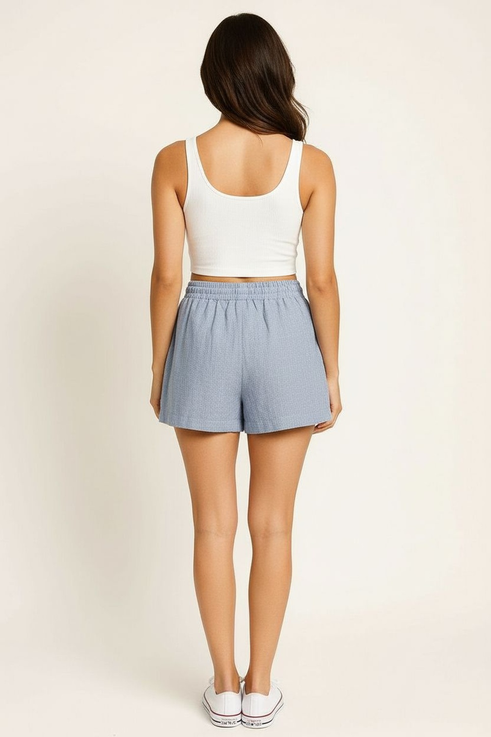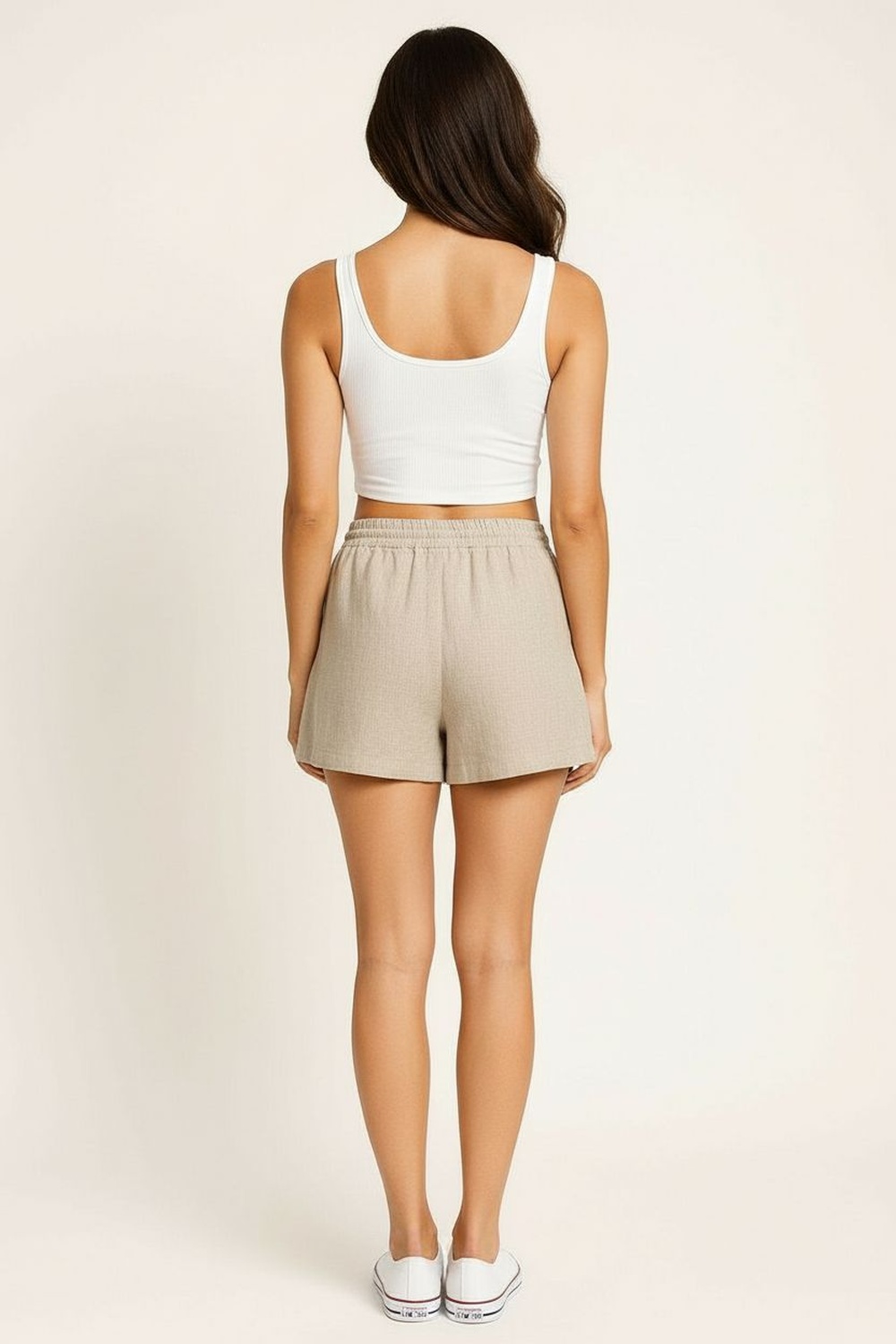 Short de tiro alto con pretina amplia y cinturón decorativo integrado, corte recto con bolsillos frontales funcionales que aportan practicidad, largo arriba de la rodilla que brinda frescura y libertad de movimiento, confección ligera con estructura firme que mantiene la forma durante su uso