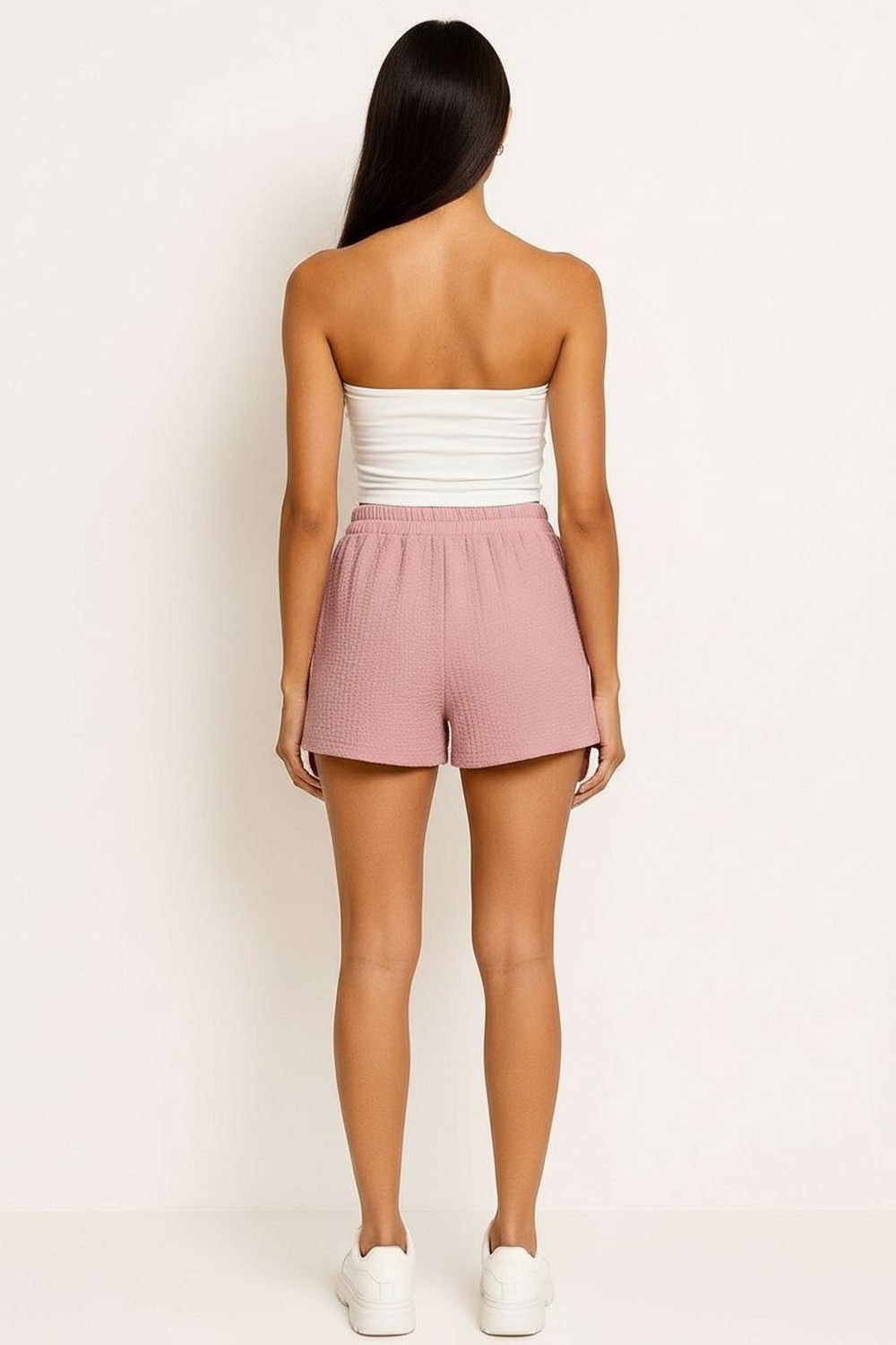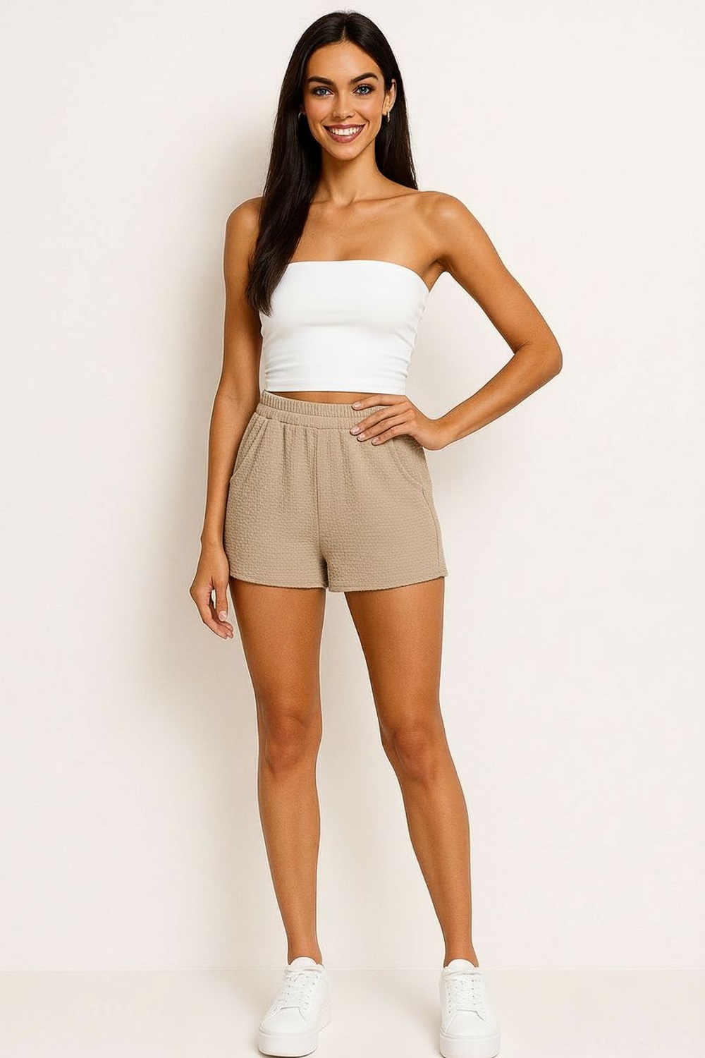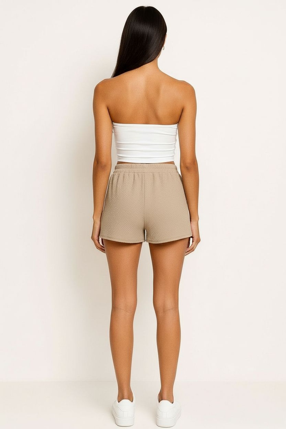 Short de tiro alto con pretina ancha y lazo integrado para ajuste frontal, bolsillos laterales funcionales de corte limpio, silueta recta que brinda comodidad, largo medio que favorece movilidad, confección ligera con caída suave
