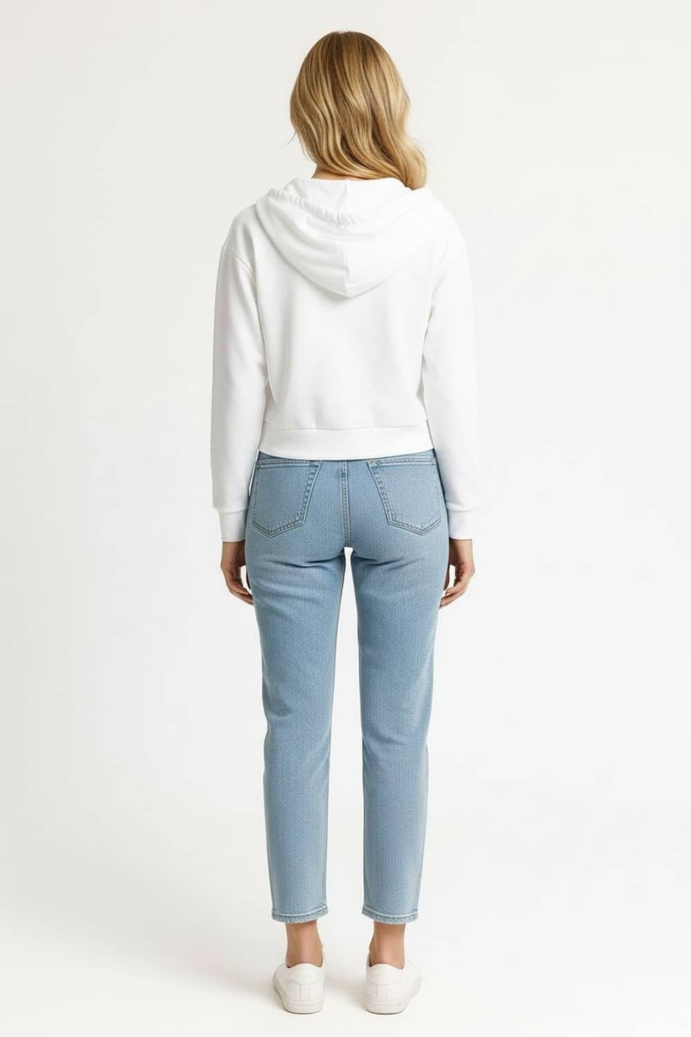 Sudadera de corte recto con capucha integrada que aporta funcionalidad, cierre frontal metálico que facilita la colocación, manga larga con puño ajustado que mantiene la forma, largo regular que equilibra la prenda, confección en tejido suave de grosor medio que brinda confort