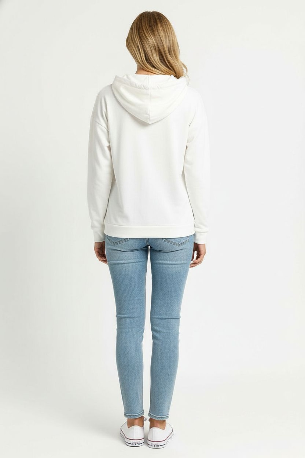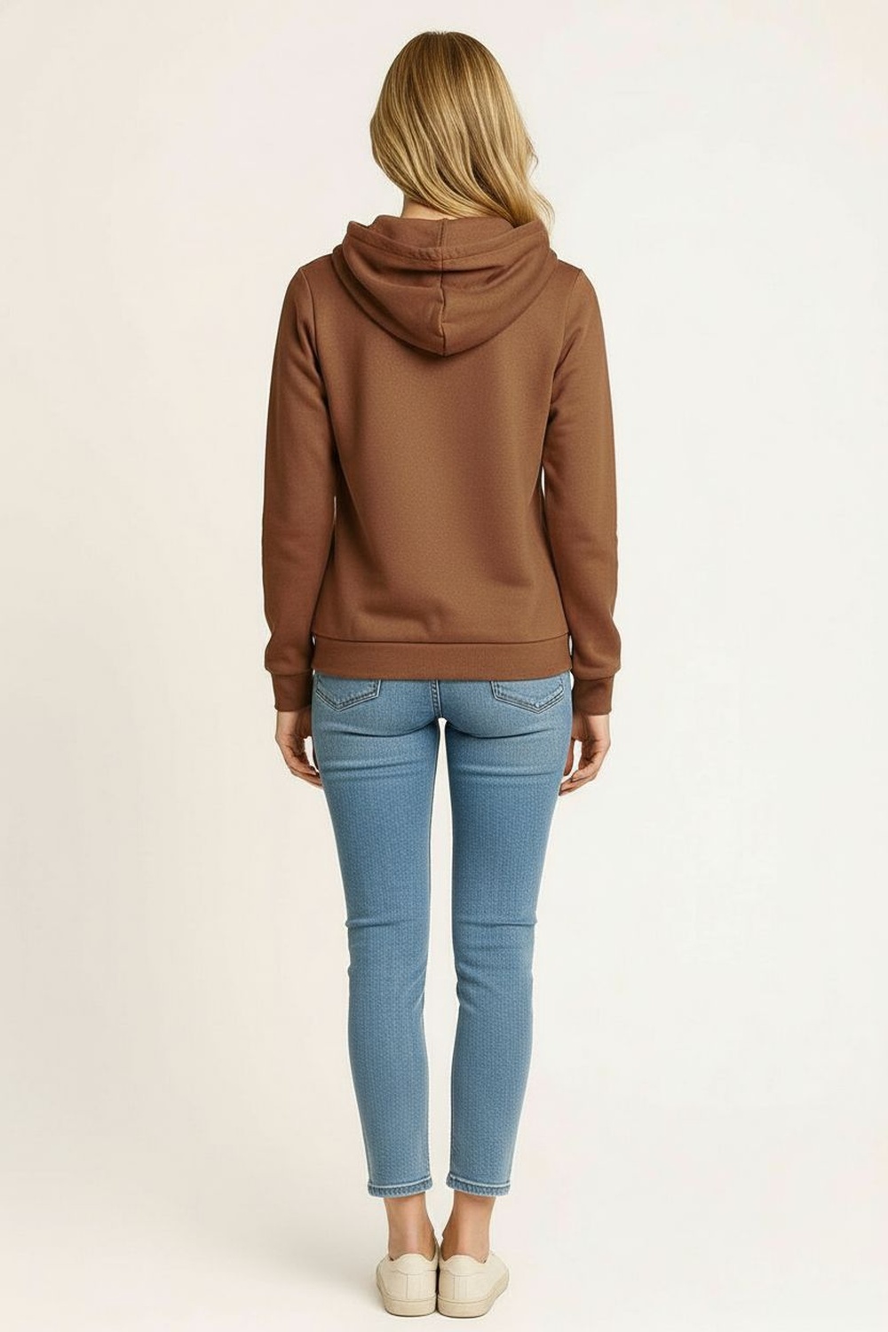Sudadera con capucha de corte relajado y cierre frontal medio, jareta ajustable en bastilla que define la silueta con un toque sporty, manga larga con puños cómodos que brindan abrigo, bolsa tipo canguro funcional, estilo urbano y práctico, prenda esencial para outfits casuales con aire deportivo