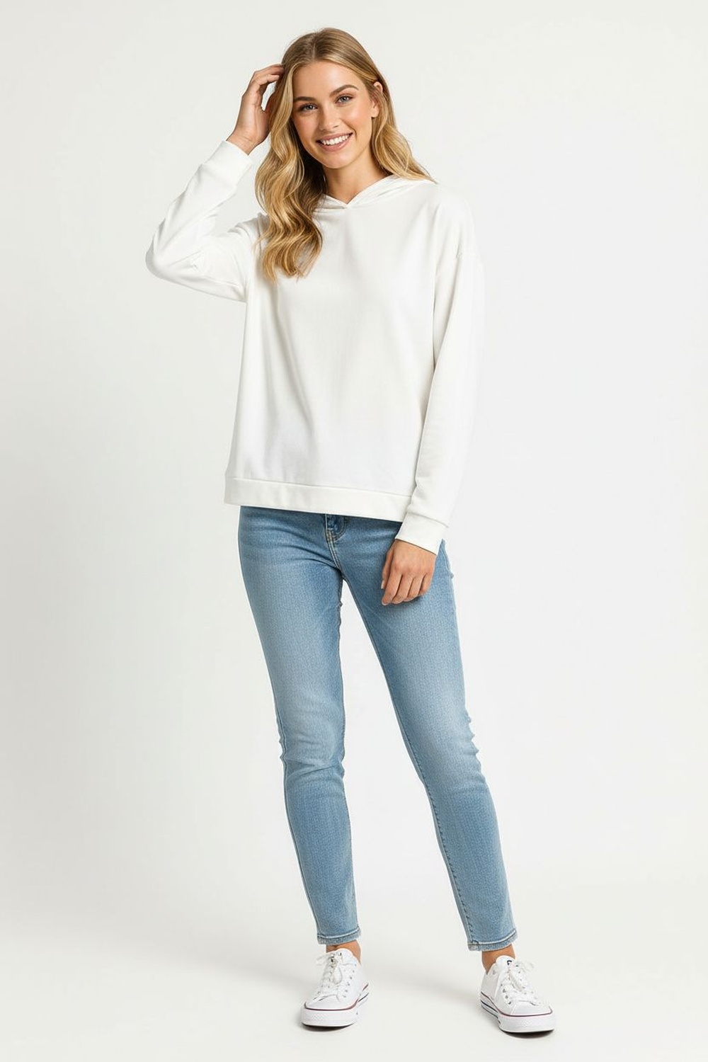 Sudadera de corte clásico con capucha amplia, confeccionada en tejido tipo suede de textura aterciopelada, interior suave que ofrece confort térmico, dobladillo recto y puños anchos que aportan estructura, ideal para looks relajados de temporada