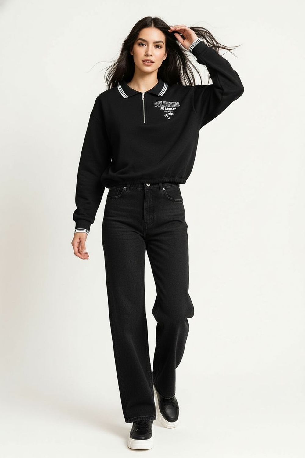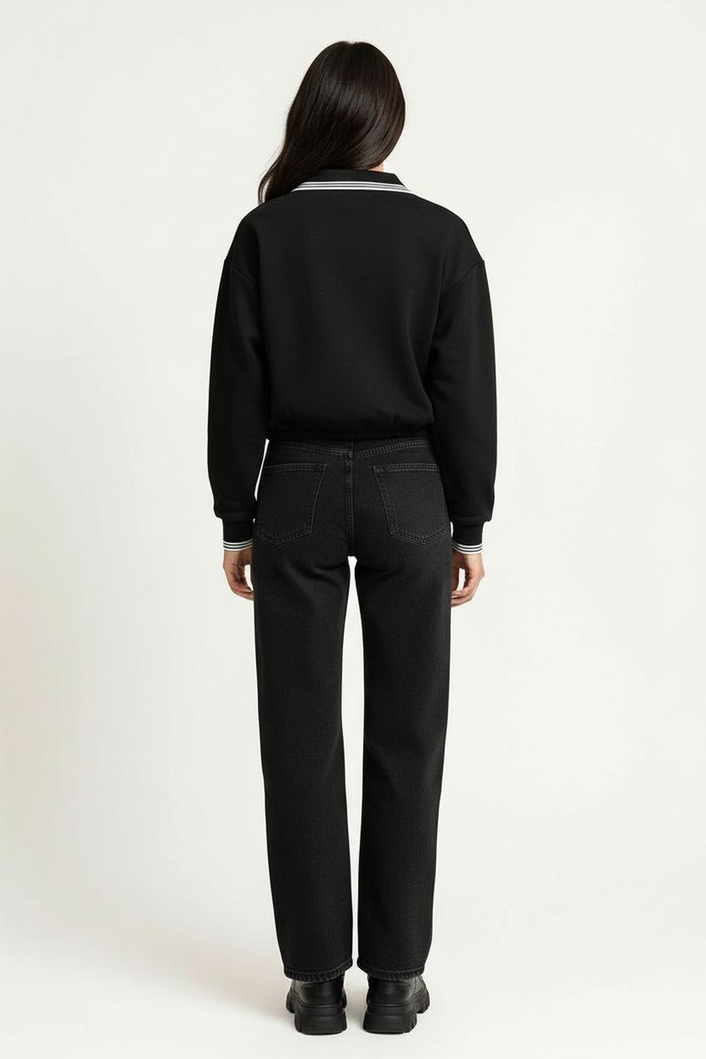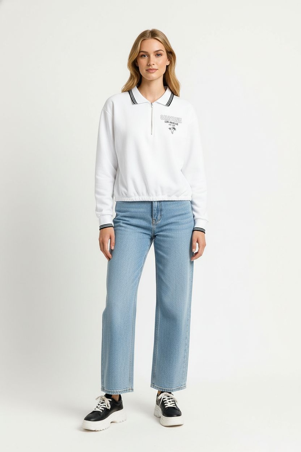 Sudadera de manga larga con cuello alto que brinda abrigo y estilo, medio cierre frontal que permite un ajuste práctico y versátil, silueta recta de caída ligera que ofrece comodidad, confección en tela suave que aporta calidez y libertad de movimiento para el uso diario