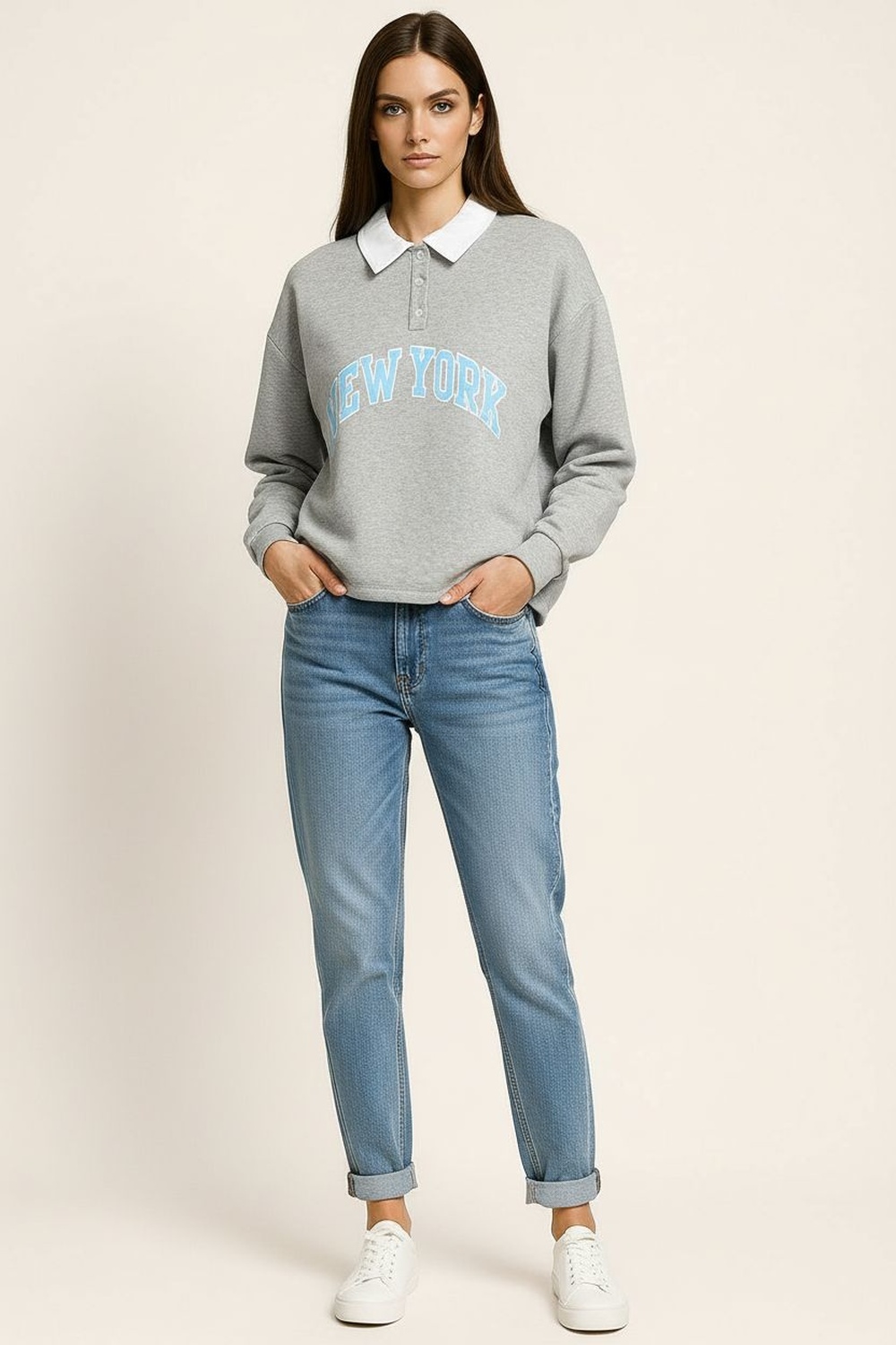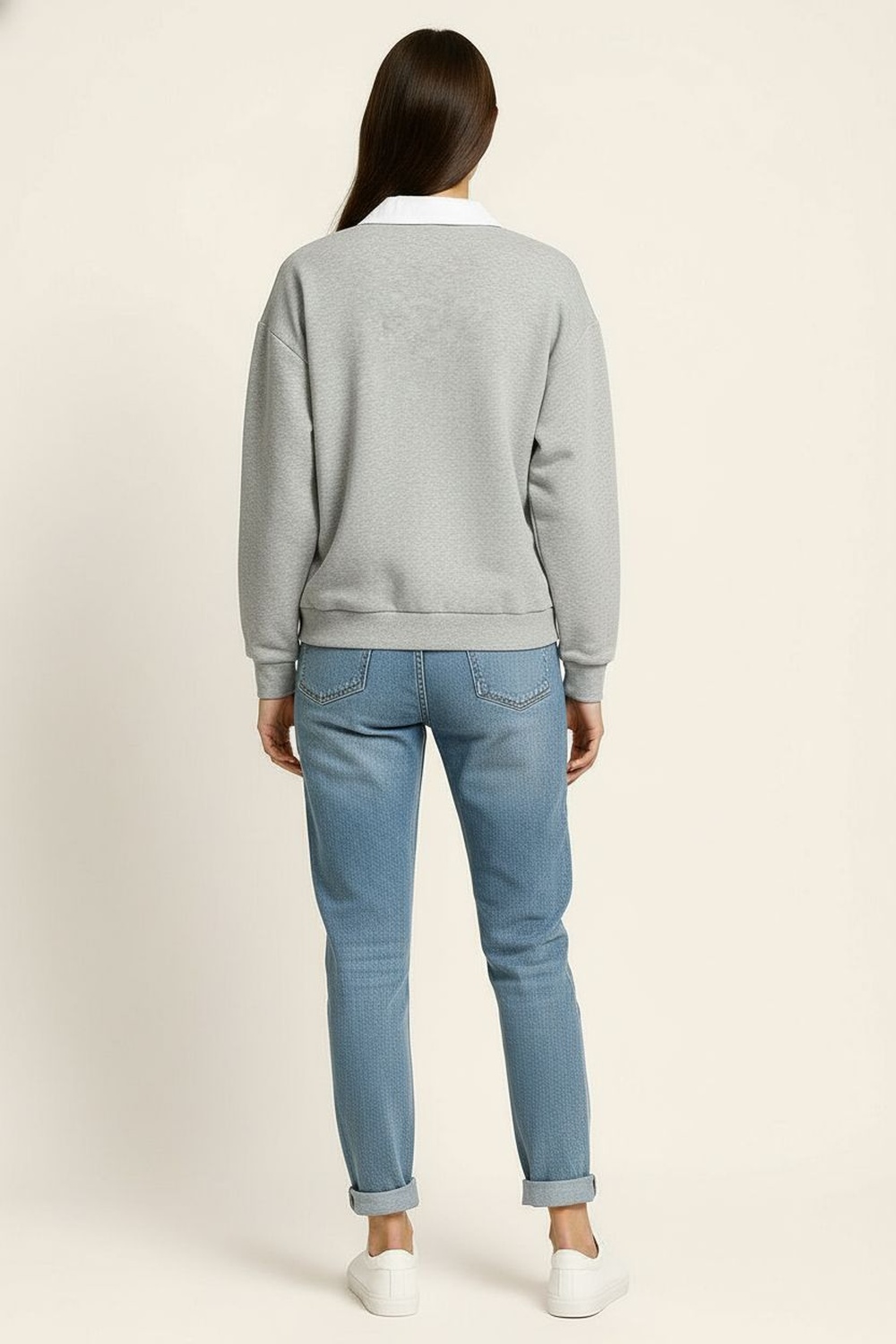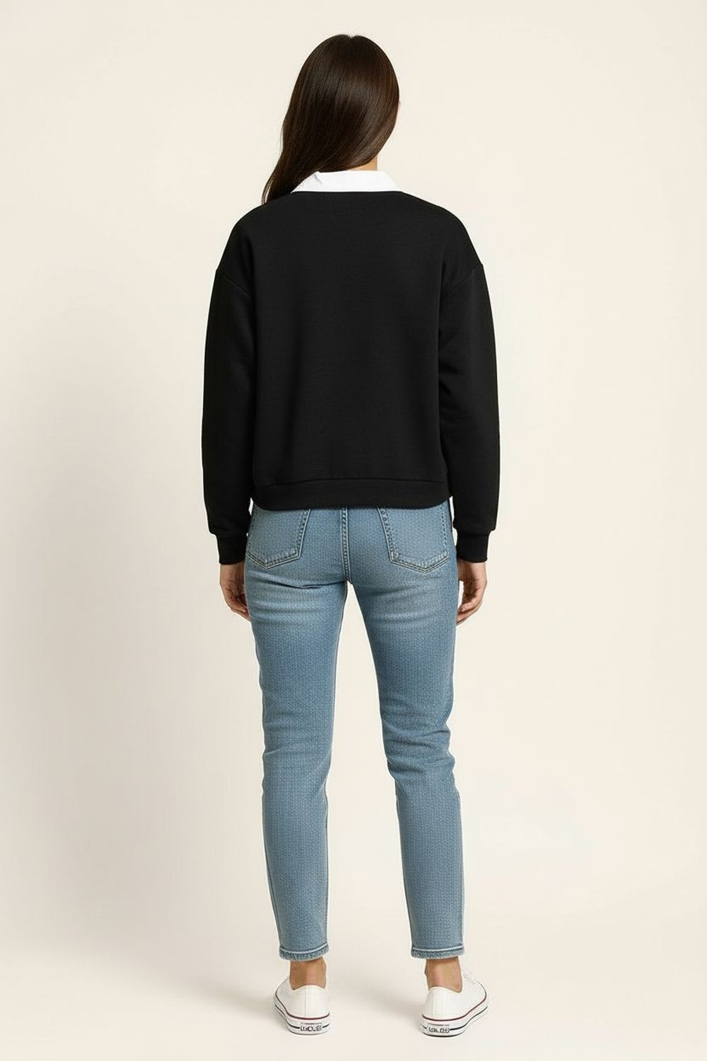 Sudadera con cuello tipo camisero en tono contraste y cierre parcial de botones, silueta relajada con caída recta que ofrece comodidad, puños y dobladillo en terminado elástico que mantiene la forma, confección en tejido suave al tacto ideal para uso diario