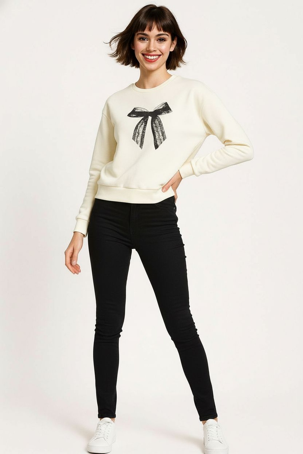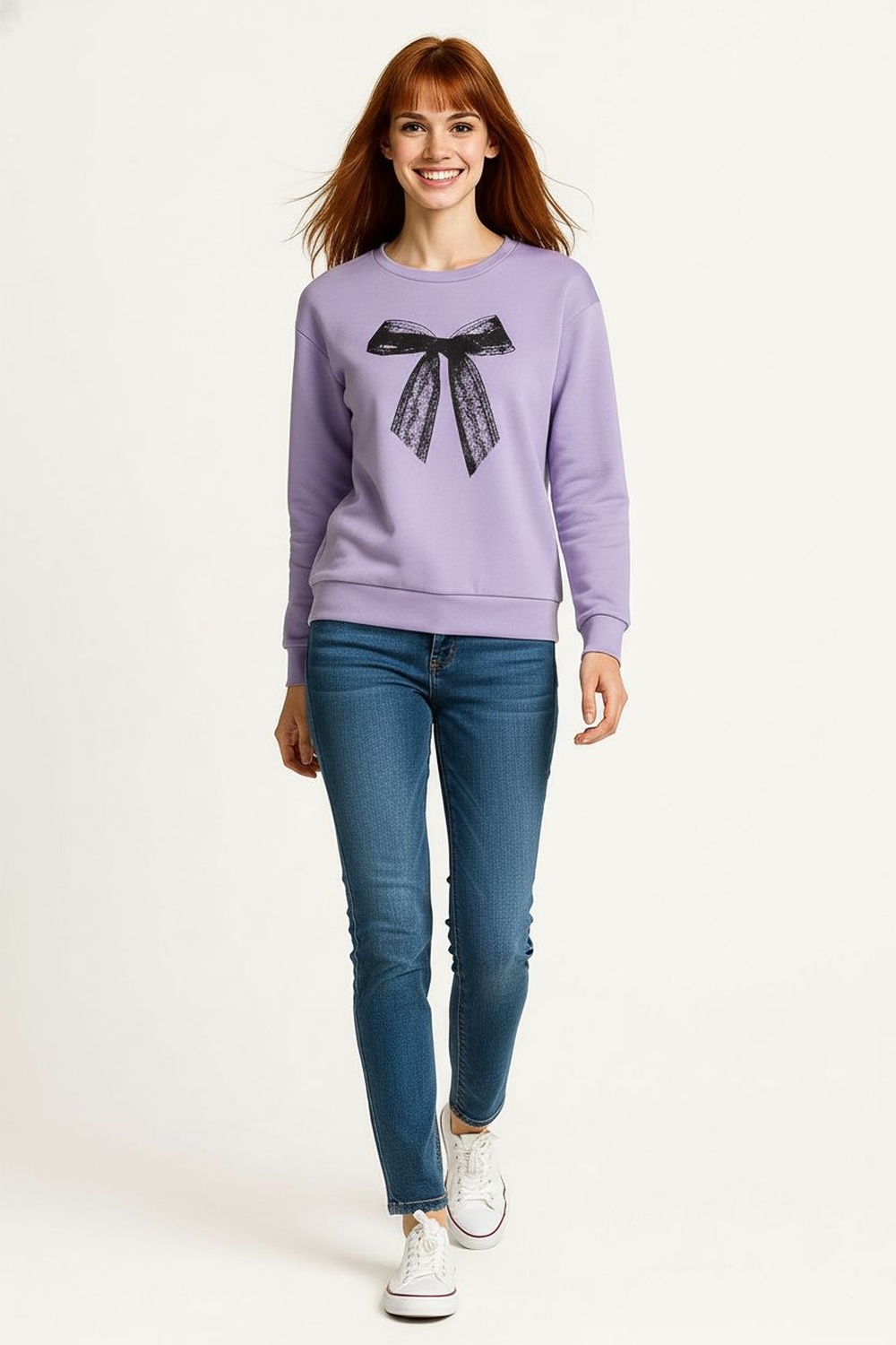 Sudadera de cuello redondo con aplicación frontal de moño, diseño de manga larga con puños ajustados que aportan comodidad, confección en tejido suave con acabado afelpado al interior, corte relajado que facilita el movimiento y brinda sensación térmica agradable