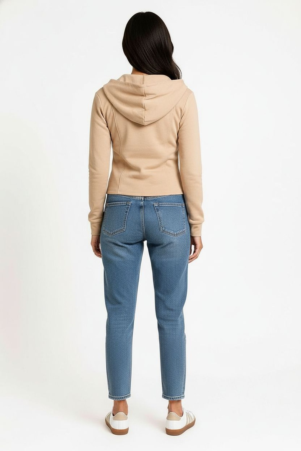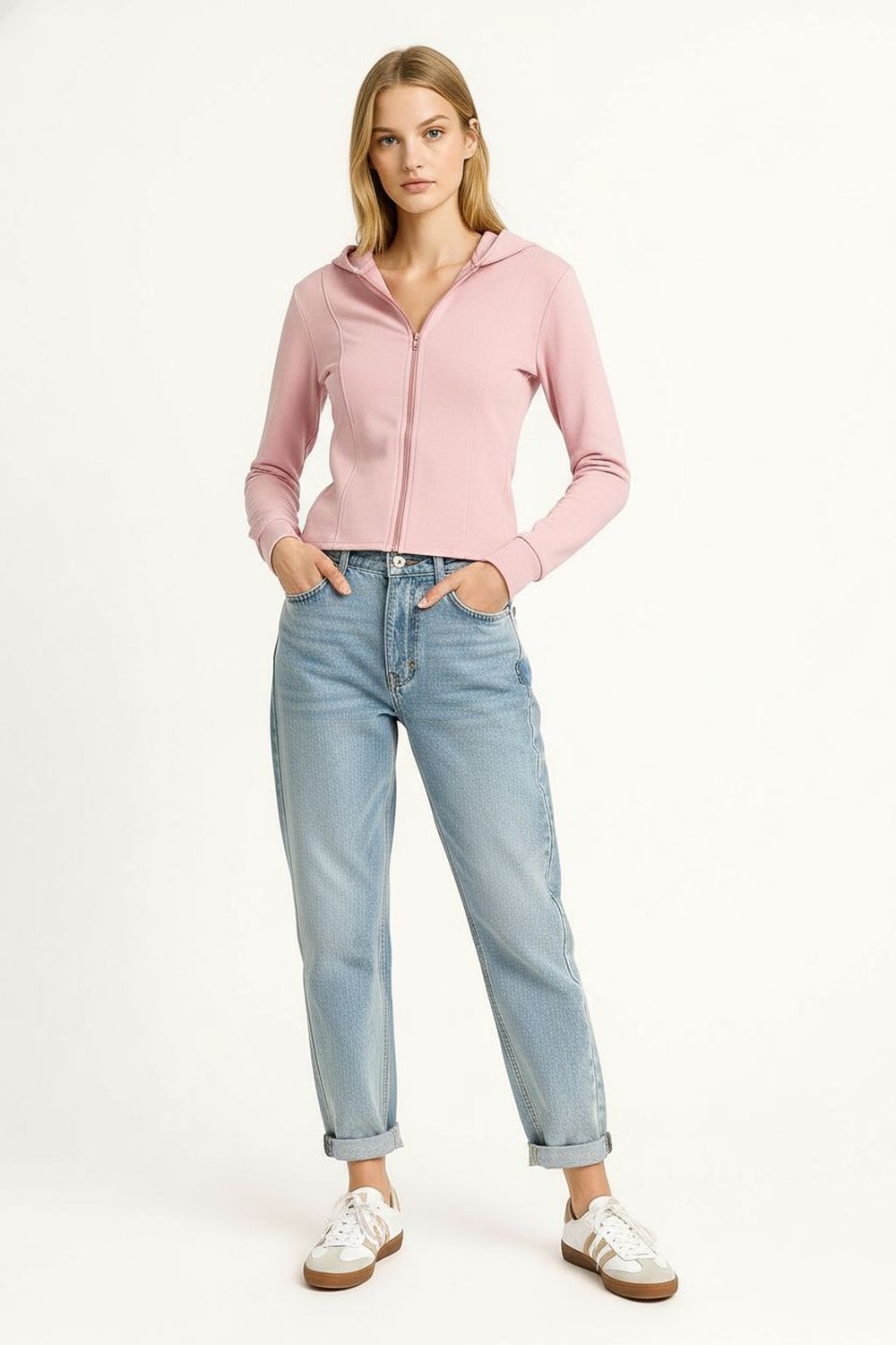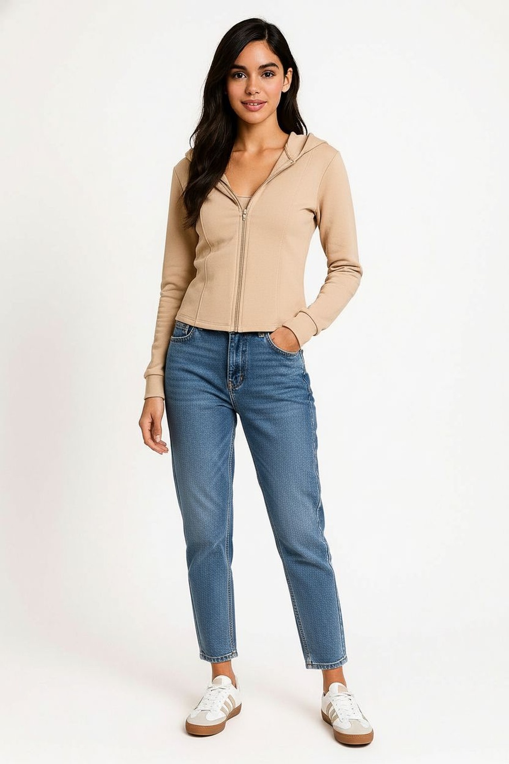 Sudadera corta con capucha ajustable y cierre frontal completo, mangas largas con puños elásticos, pretina ancha que define la silueta, confeccionada en tejido suave con elasticidad para mayor comodidad, ideal para un estilo casual y relajado de temporada FIT REGULAR