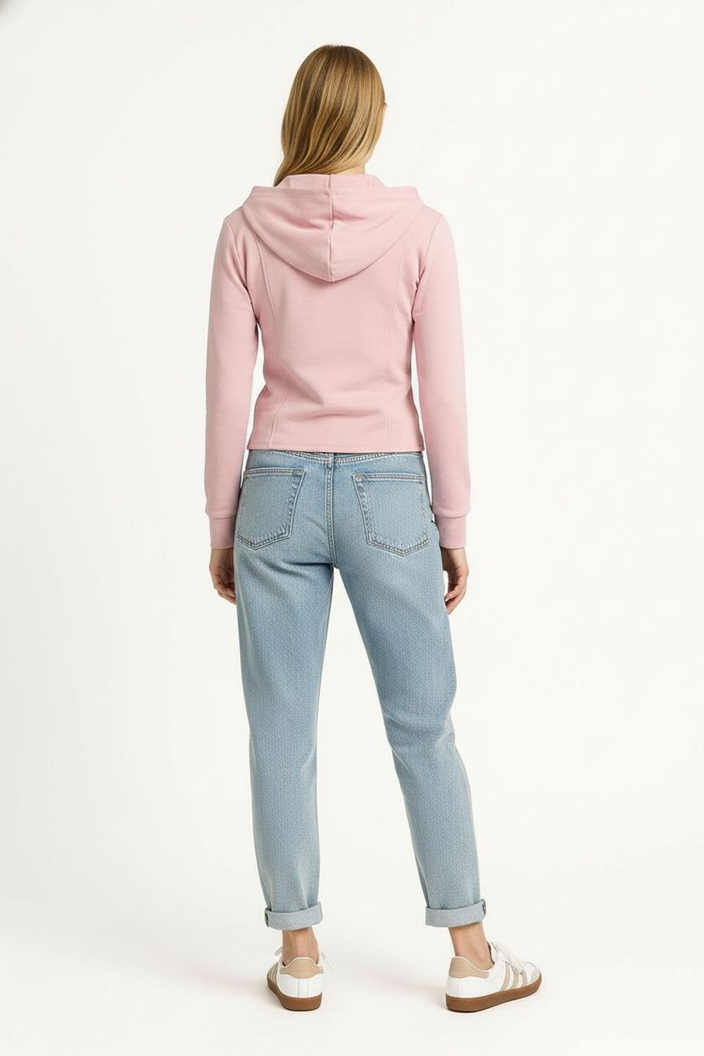 Sudadera corta confeccionada en tejido tipo micro fleece de textura suave, cierre frontal de cremallera, capucha integrada con jareta ajustable, manga larga con puños ajustados, estructura ligera que brinda confort y abrigo en uso diario