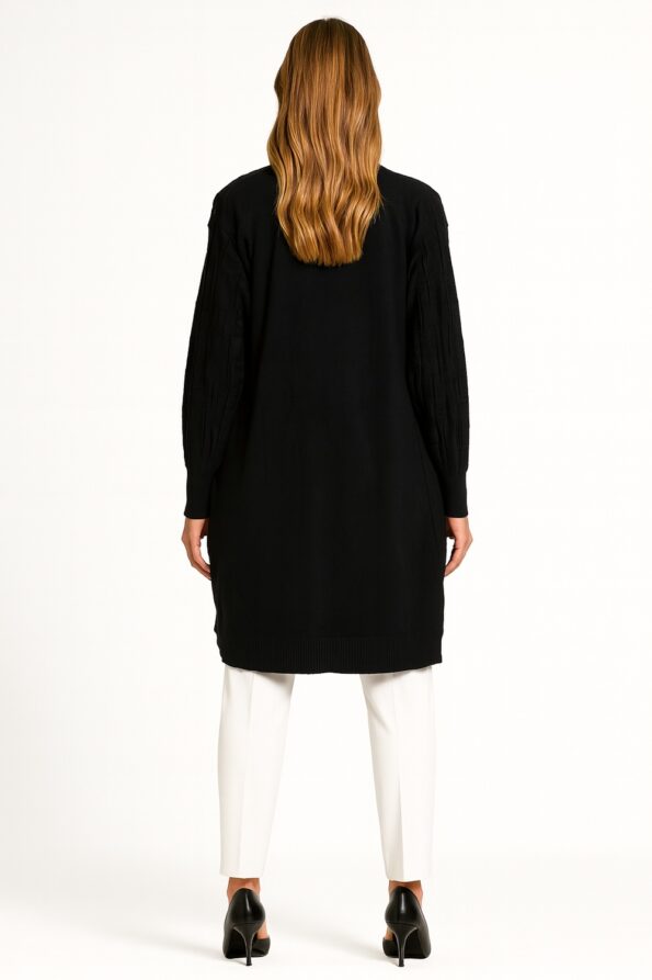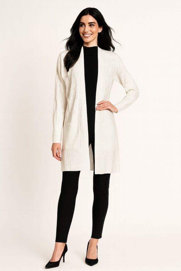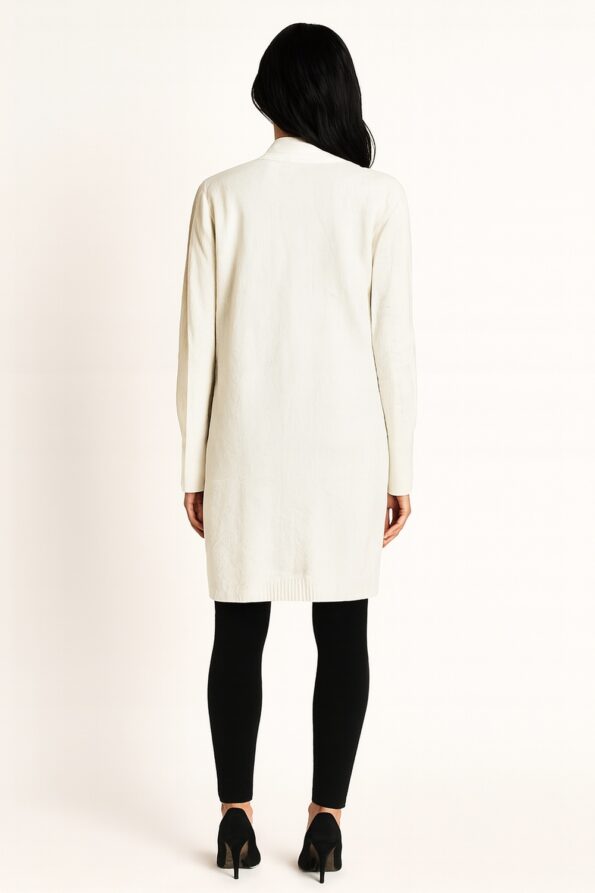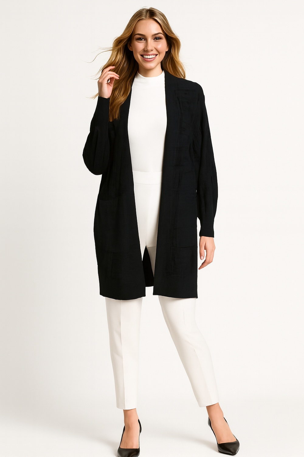 Suéter largo abierto de manga larga con bolsillos delanteros funcionales, corte recto que favorece la caída natural de la prenda, diseño versátil sin cierre que aporta comodidad, confeccionado en tejido suave con textura ligera, costuras reforzadas que aseguran resistencia y durabilidad