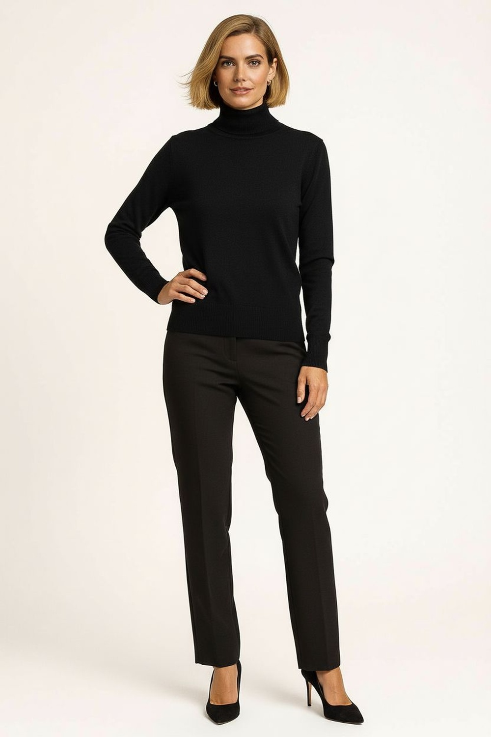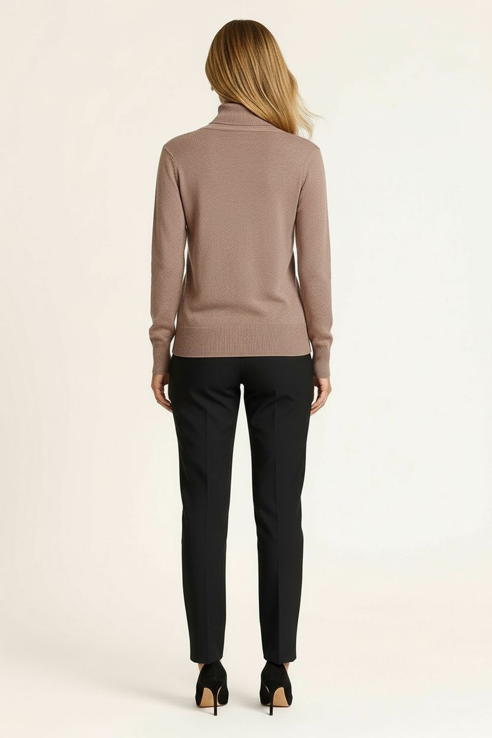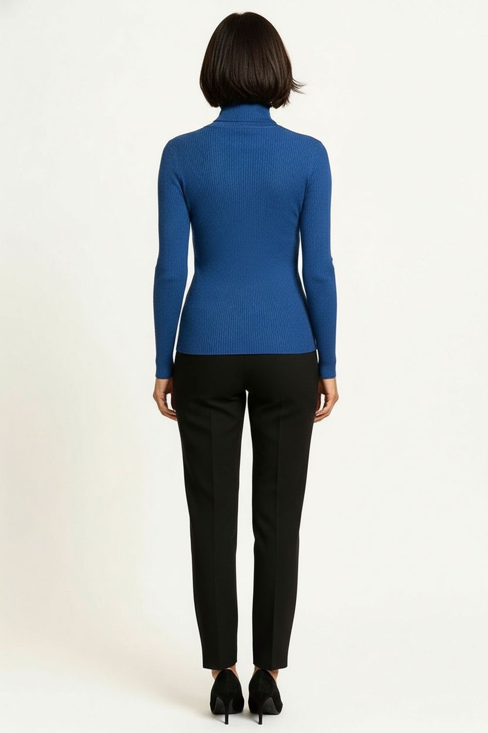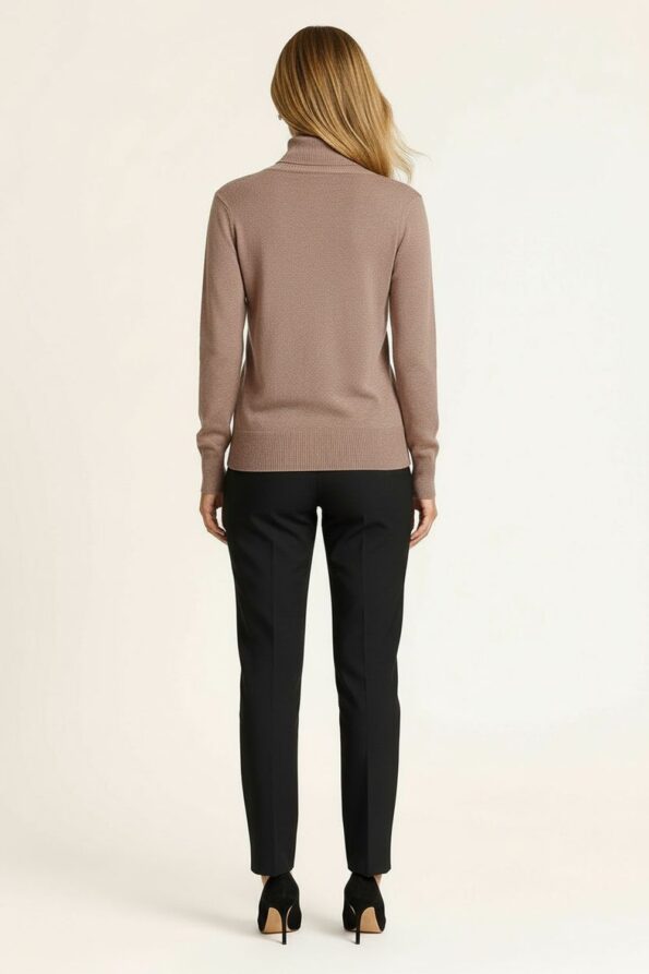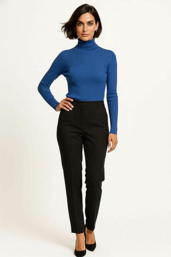 Suéter de manga larga con cuello alto ajustado, confeccionado en tejido de punto elástico que brinda suavidad y confort, diseño básico con acabado fino que permite crear múltiples combinaciones, corte entallado que favorece la figura y resalta la silueta, terminaciones reforzadas para mayor durabilidad y ajuste perfecto