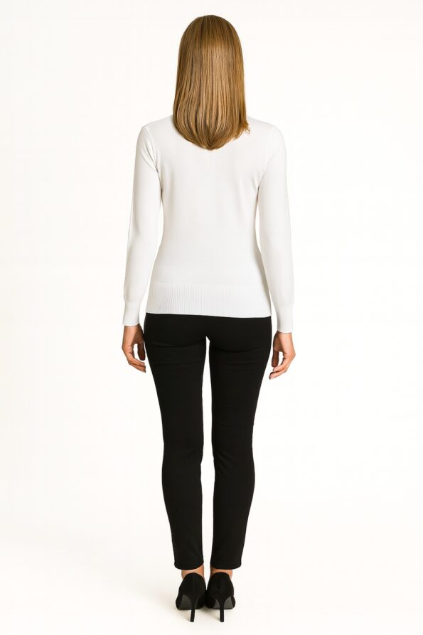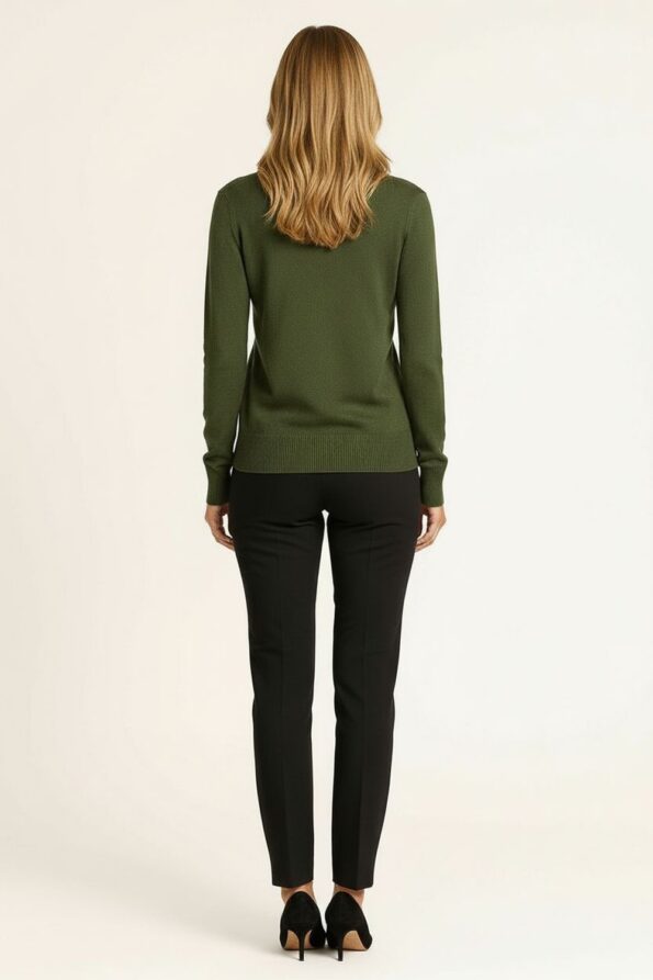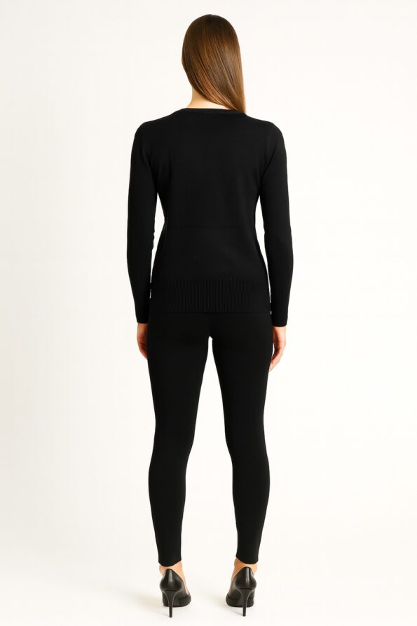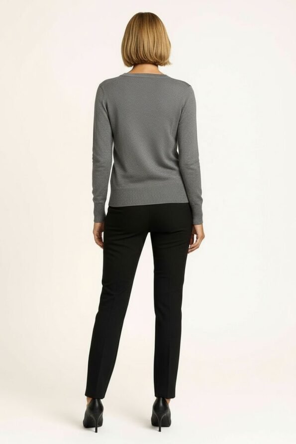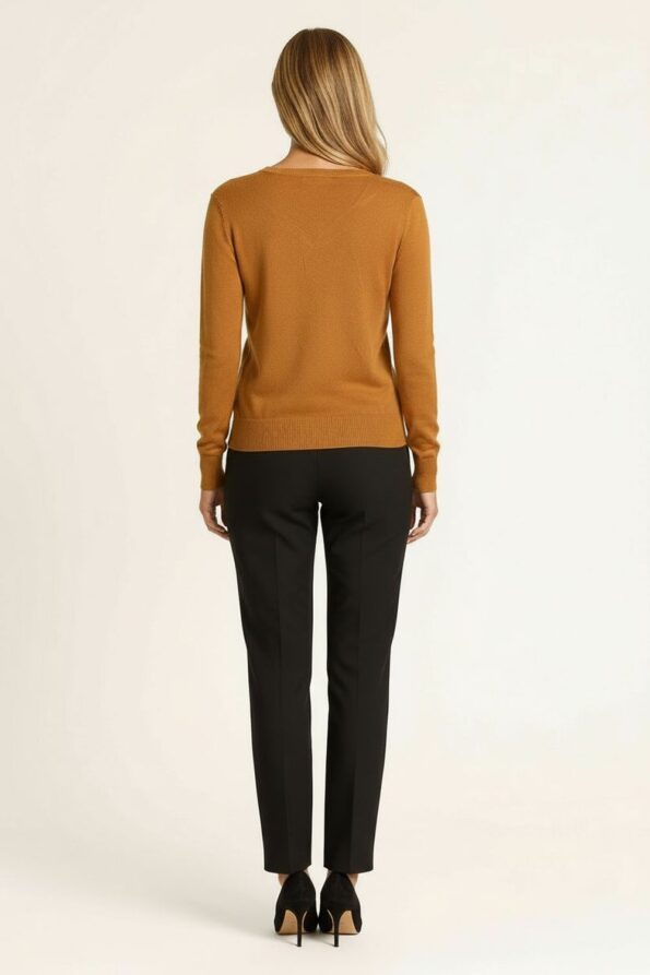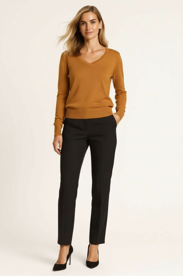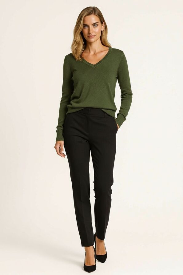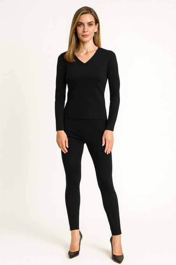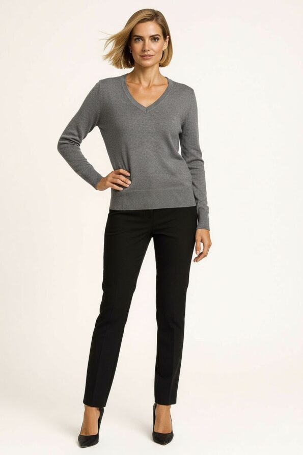 Suéter de manga larga con escote en V, confeccionado en tejido de punto fino que ofrece suavidad y ligereza, diseño clásico con corte ajustado que realza la silueta, terminaciones acanaladas en cuello, puños y dobladillo que aportan un acabado limpio y resistente, ideal para crear looks versátiles de temporada