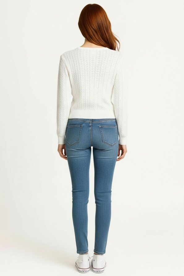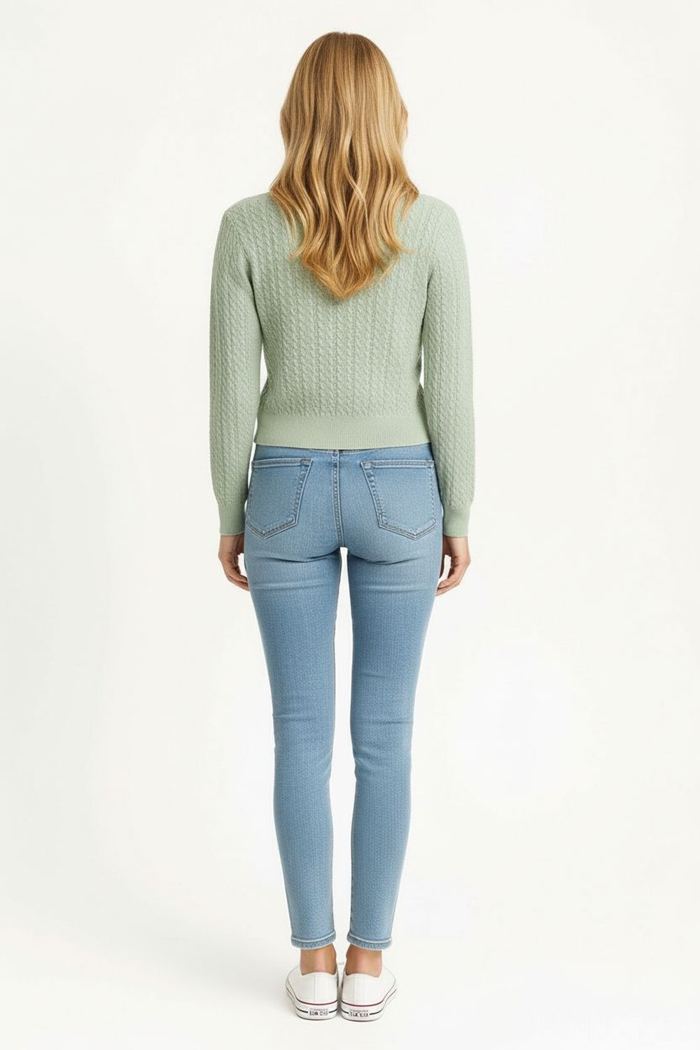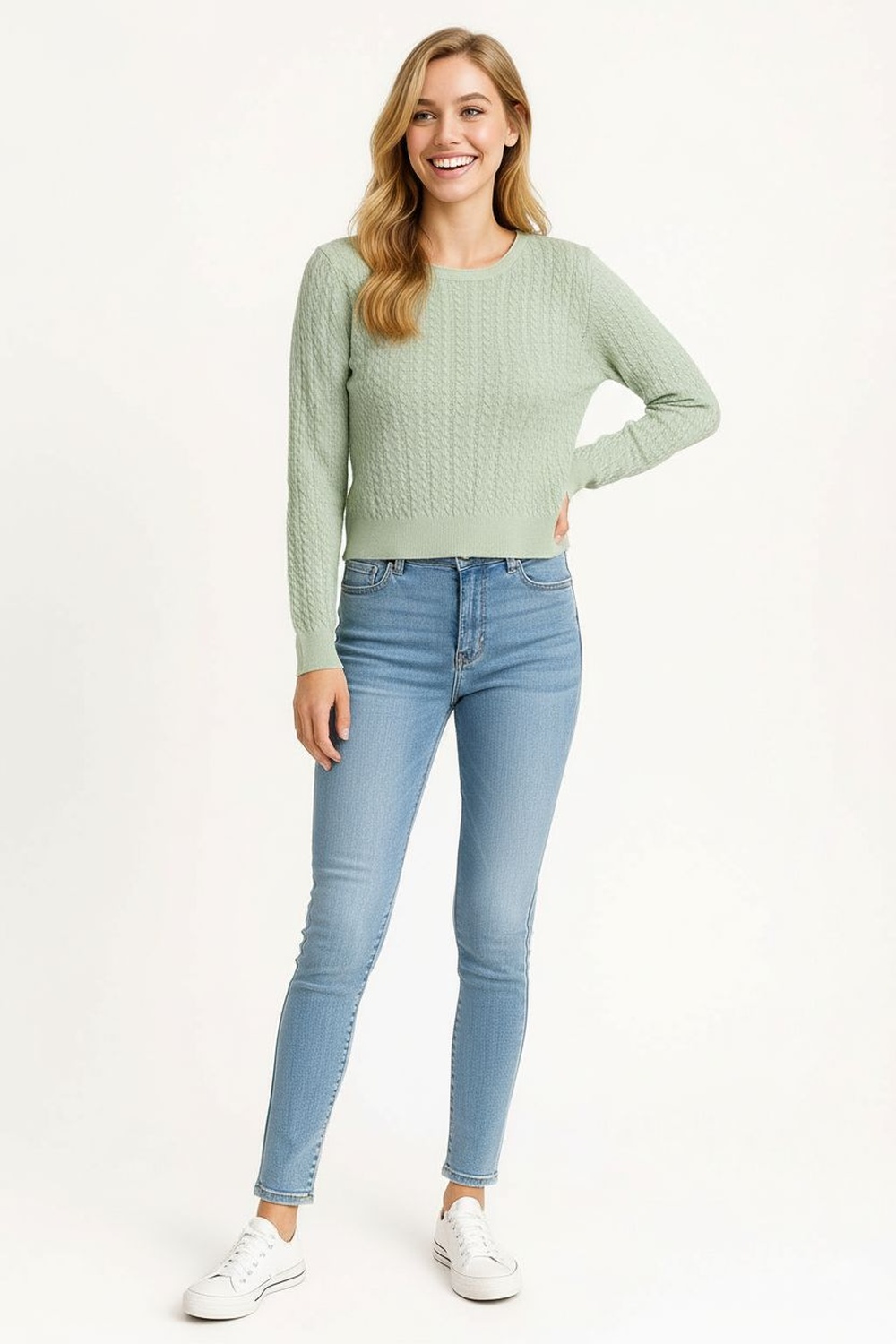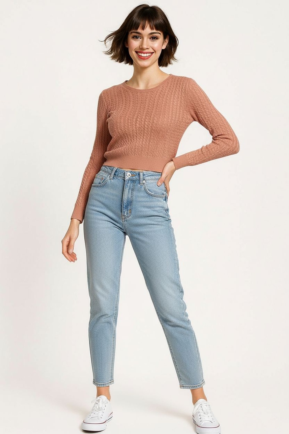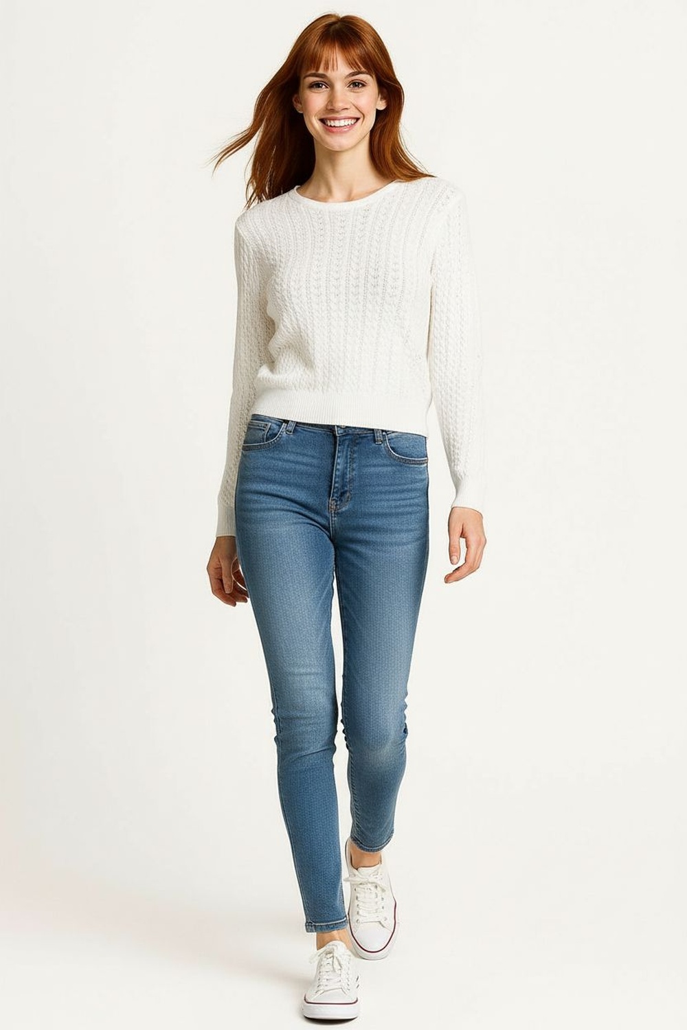 Suéter de manga larga confeccionado en tejido calado de viscosa con textura ligera, cuello redondo con acabado fino que aporta un toque clásico, pretina y puños acanalados que brindan ajuste cómodo, diseño entallado que realza la silueta manteniendo suavidad y flexibilidad en cada movimiento