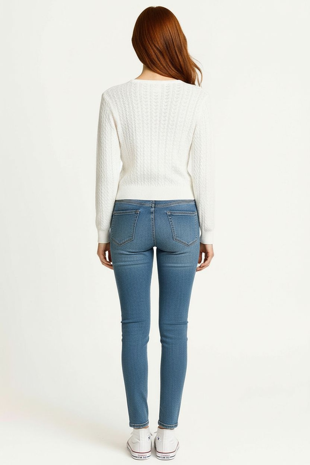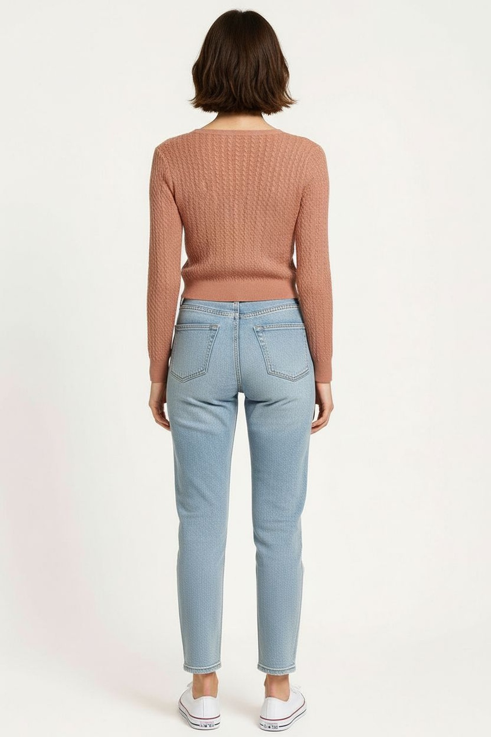 Suéter de manga larga con tejido calado que aporta textura ligera y transpirabilidad, escote en V que realza el cuello y añade un toque femenino, diseño corto con acabado ondulado en el dobladillo que proporciona movimiento y estilo, confección en punto elástico que ofrece comodidad y se adapta a la figura, costuras reforzadas que garantizan durabilidad y una apariencia pulida