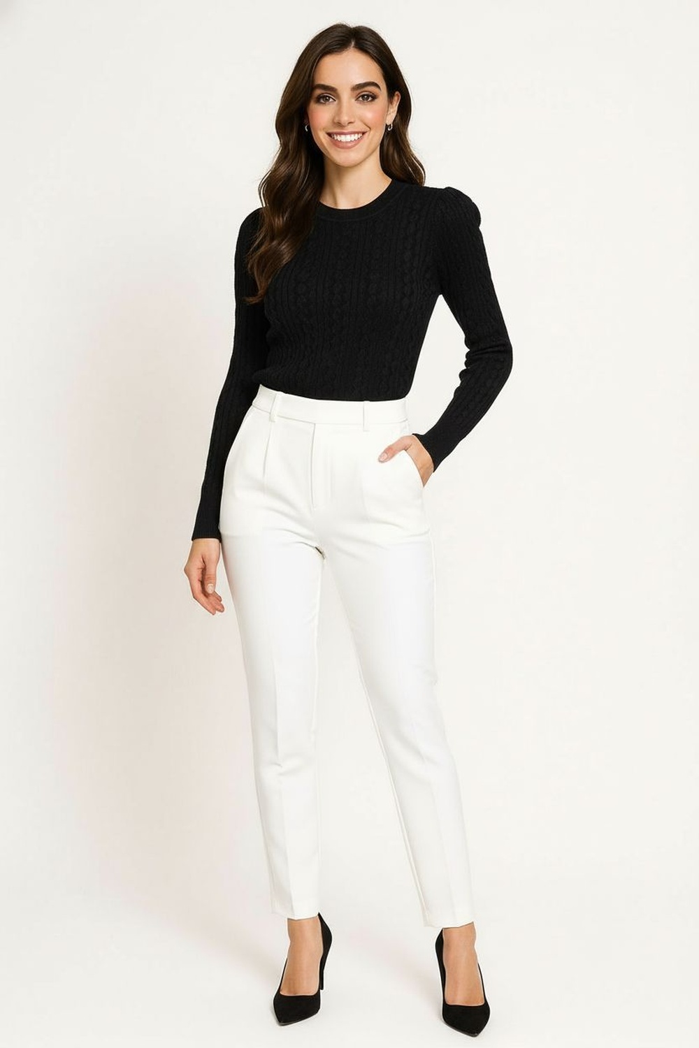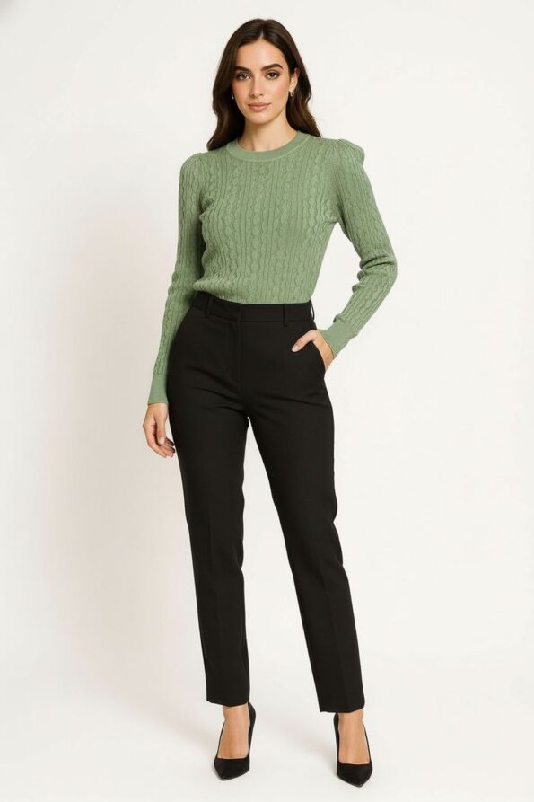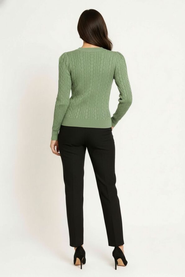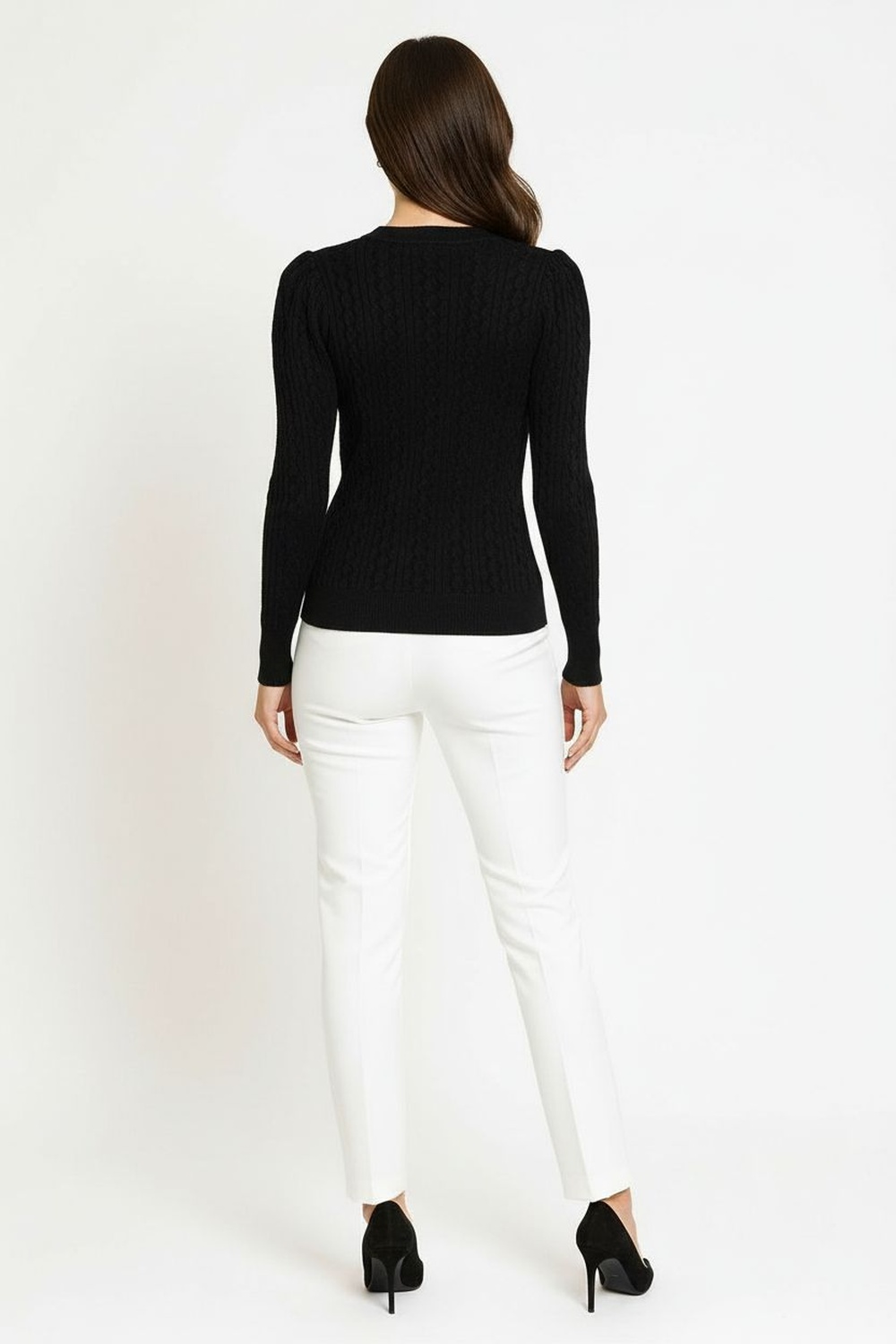 Suéter de manga larga con diseño calado en forma de hojas que aporta textura y detalle artesanal, escote redondo con acabado fino que realza el cuello, confección en tejido suave y elástico que garantiza confort, corte ajustado que moldea la figura y terminaciones en rib que brindan estructura al diseño