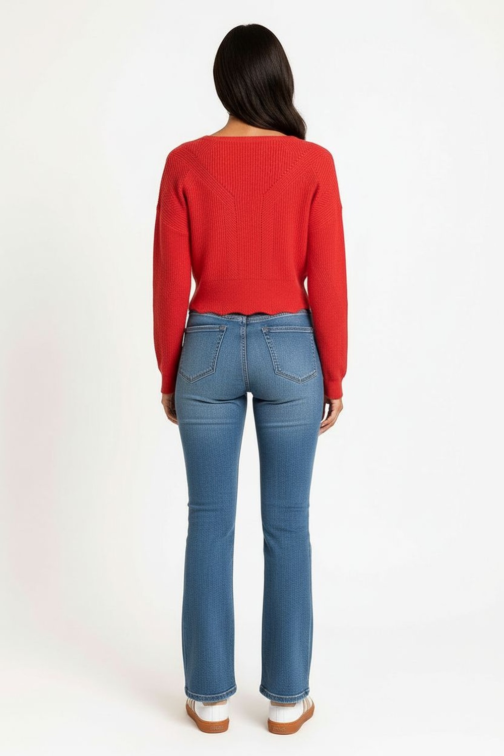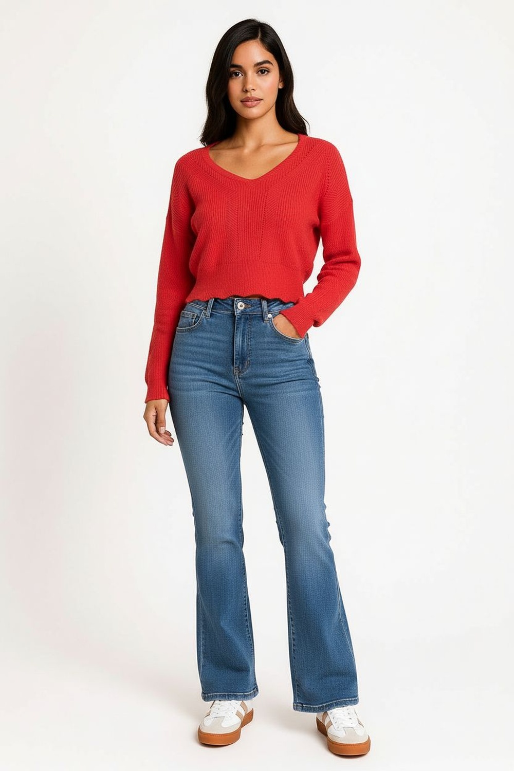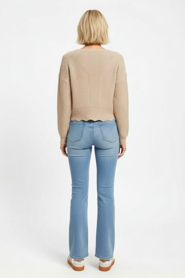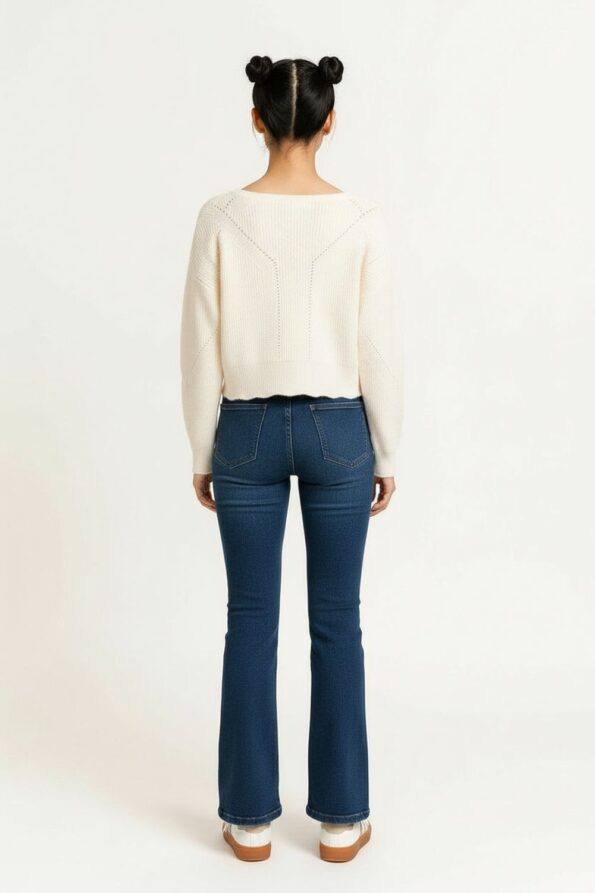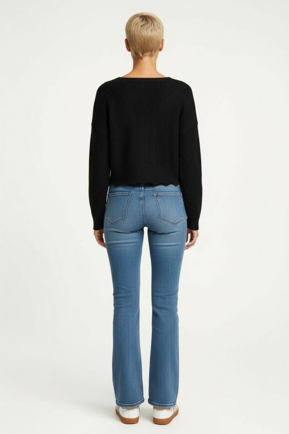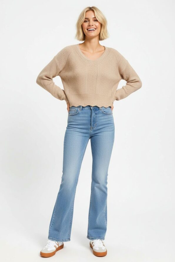 Suéter de manga larga con tejido calado que aporta textura ligera y transpirabilidad, escote en V que realza el cuello y añade un toque femenino, diseño corto con acabado ondulado en el dobladillo que proporciona movimiento y estilo, confección en punto elástico que ofrece comodidad y se adapta a la figura, costuras reforzadas que garantizan durabilidad y una apariencia pulida