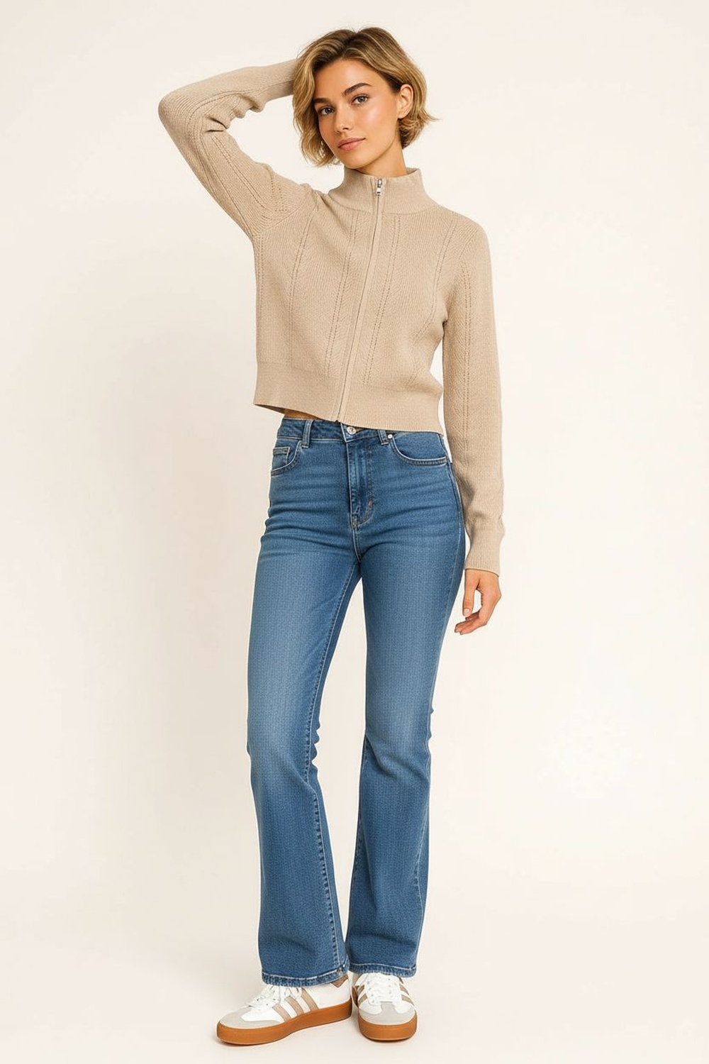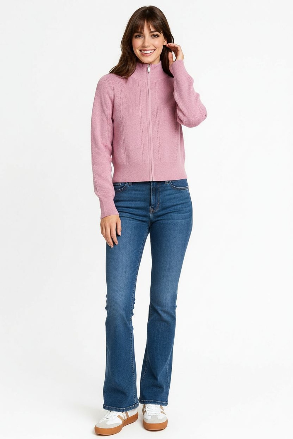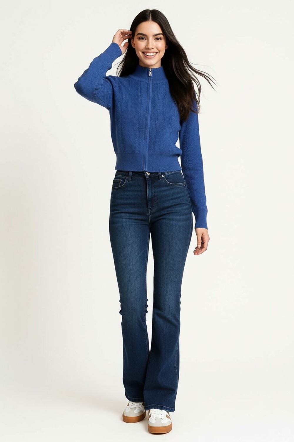 Suéter de punto medio con cierre frontal que permite ajuste personalizable, cuello alto estructurado que brinda soporte, manga larga con caída natural, pretina firme que da mejor silueta, confección en tejido flexible que aporta comodidad