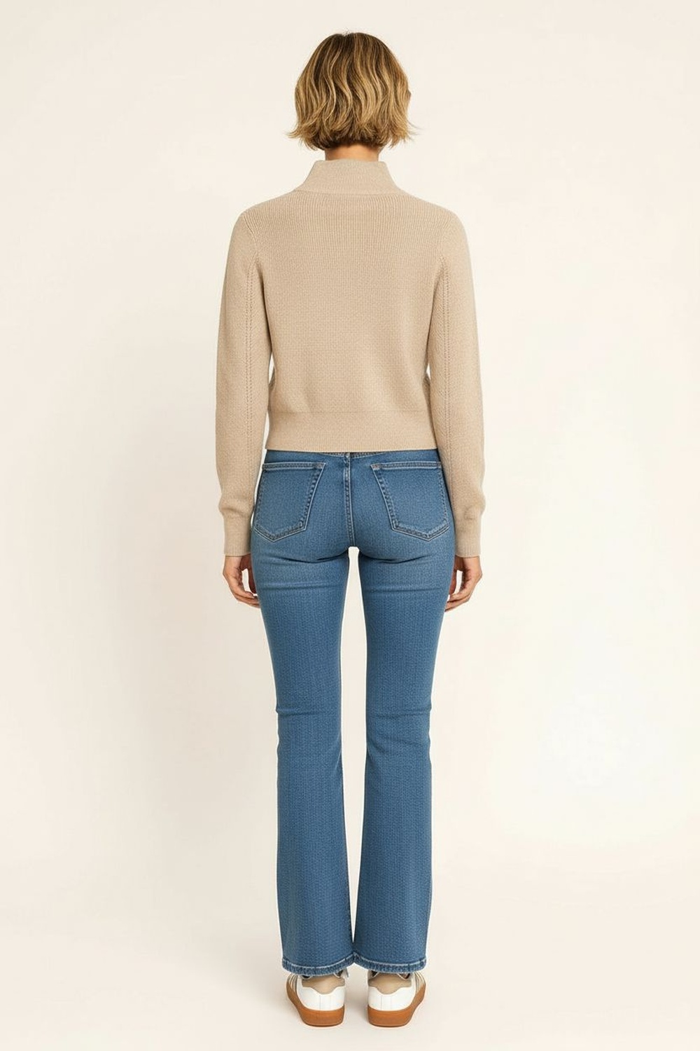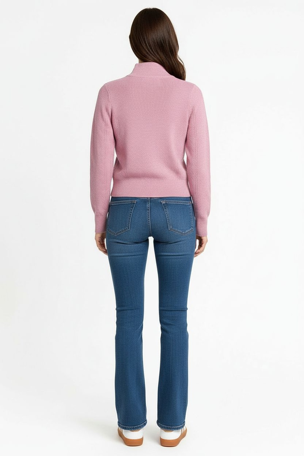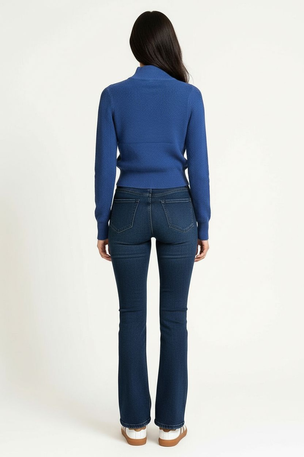 Suéter de punto medio con cierre frontal que permite ajuste personalizable, cuello alto estructurado que brinda soporte, manga larga con caída natural, pretina firme que da mejor silueta, confección en tejido flexible que aporta comodidad