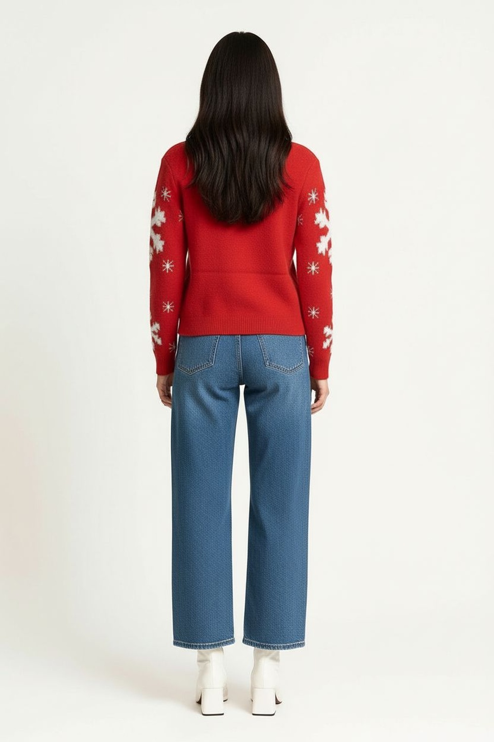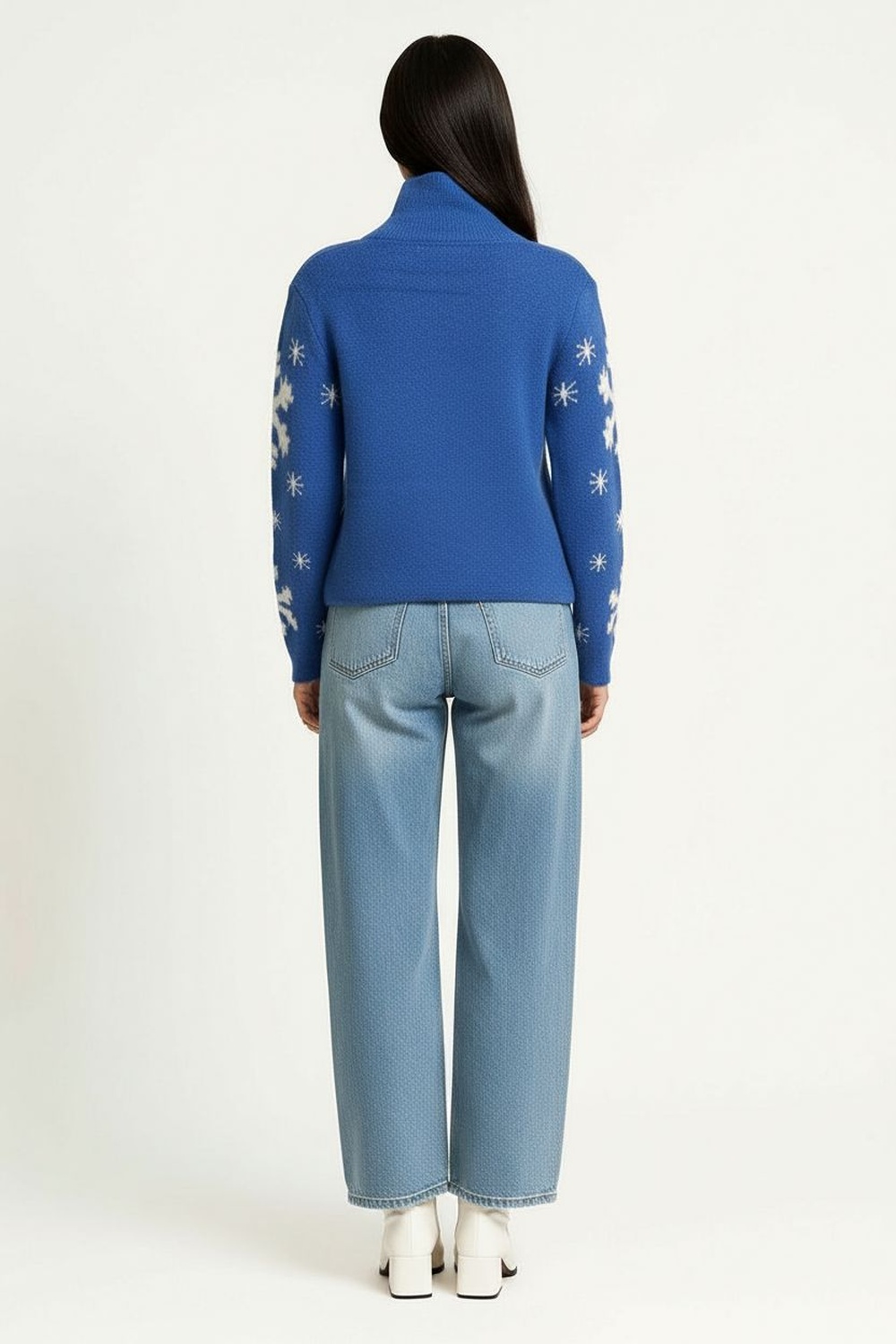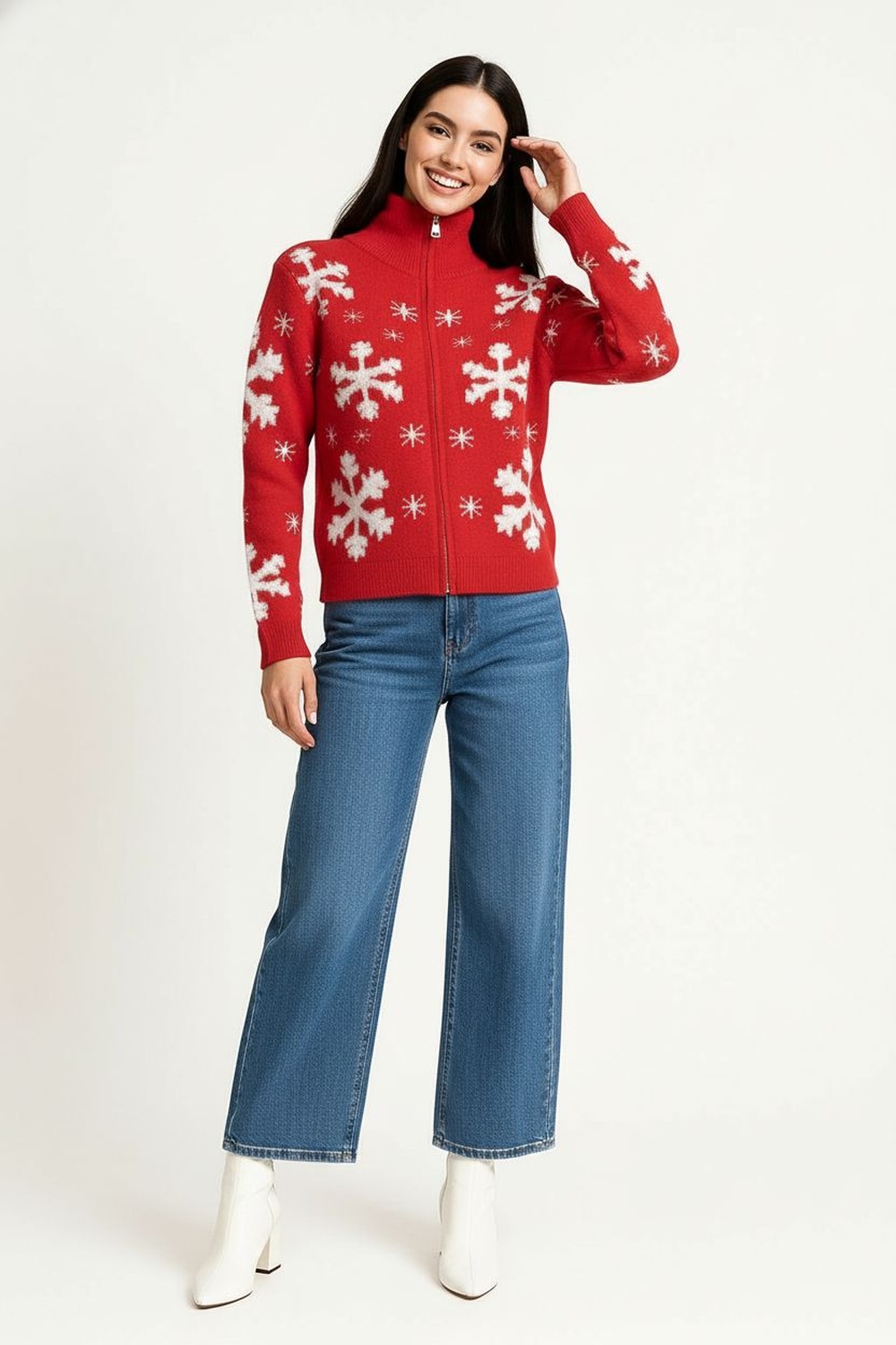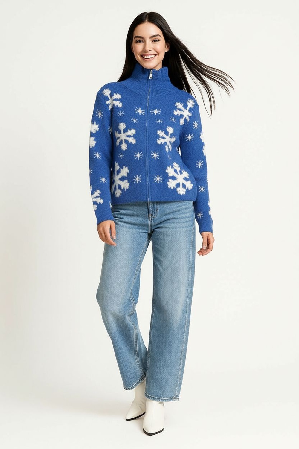 Suéter con cuello alto estructurado que brinda soporte, cierre frontal completo que facilita uso práctico, mangas largas con tejido uniforme, cuerpo de ajuste controlado que mantiene calidez, confección en punto suave que aporta comodidad continua