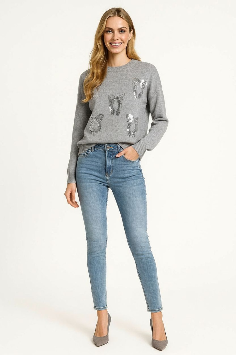 Suéter de manga larga con cuello redondo clásico que aporta comodidad, aplicación de lentejuelas en forma de moños que añade un detalle llamativo y moderno, puños y basta con acabado acanalado que aseguran mejor ajuste, confección en tejido suave que brinda calidez y confort para la temporada