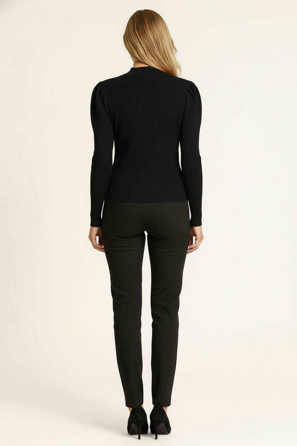 Suéter top de silueta ajustada redefine el minimalismo contemporáneo con una sofisticación atemporal confeccionada en un tejido de punto acanalado que se adapta al cuerpo, se distingue por su escote amplio en forma de U que enmarca el cuello, el bordado central en forma de flor negra con detalles geométricos añade un toque de sofisticación artesanal actuando como punto focal sutil y chic los bordes ribeteados generan un contraste visual sutil y moderno que recuerda el estilo parisian edge