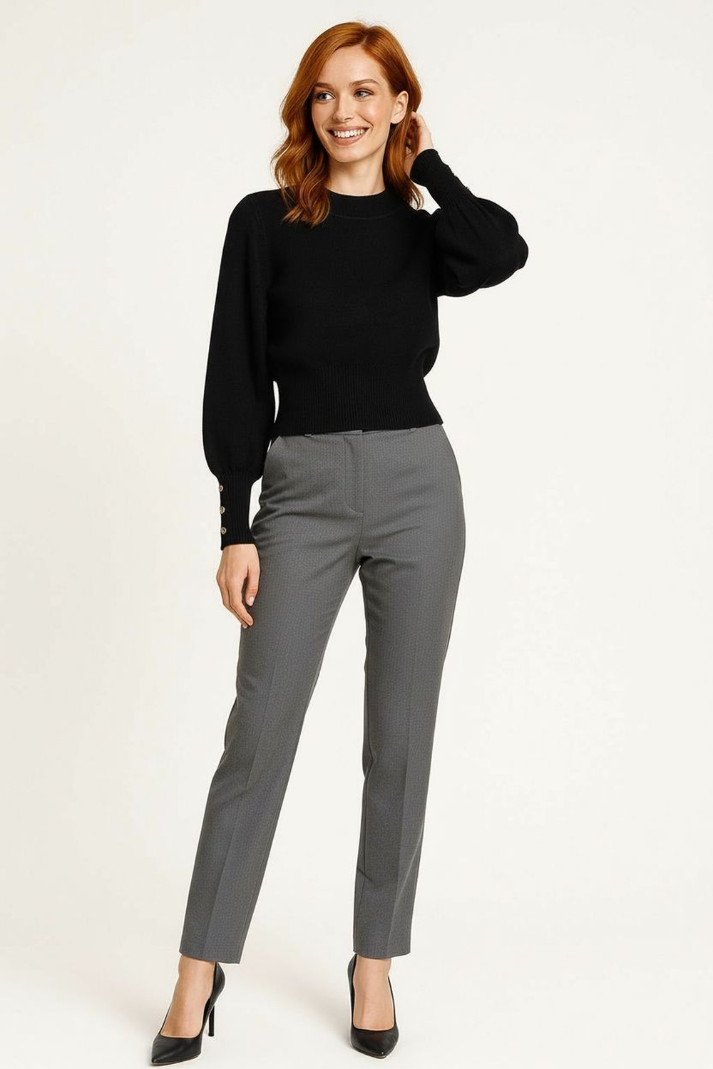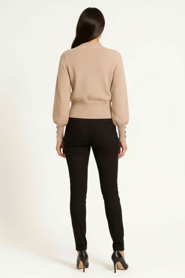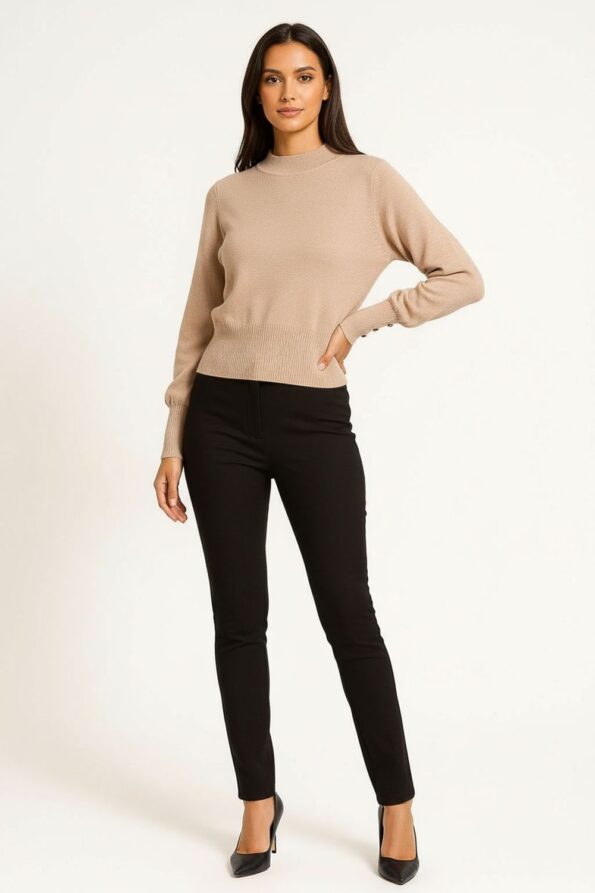 Suéter de manga larga con cuello redondo semi alto que aporta un diseño moderno y cómodo, detalle de botones decorativos en los puños que realzan el estilo, tejido acanalado en cintura y mangas que asegura mejor ajuste, confección en tela suave que brinda calidez y confort para la temporada