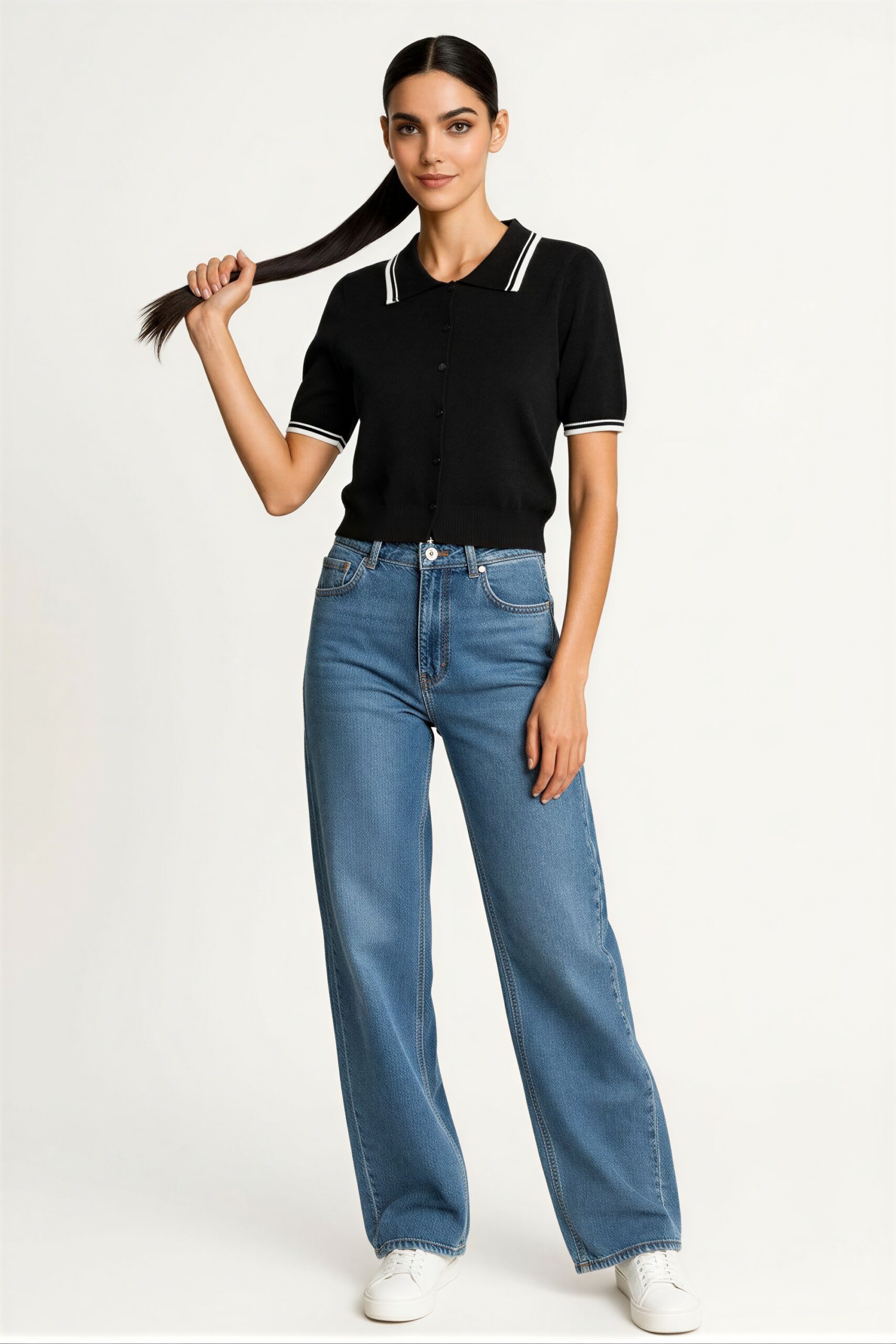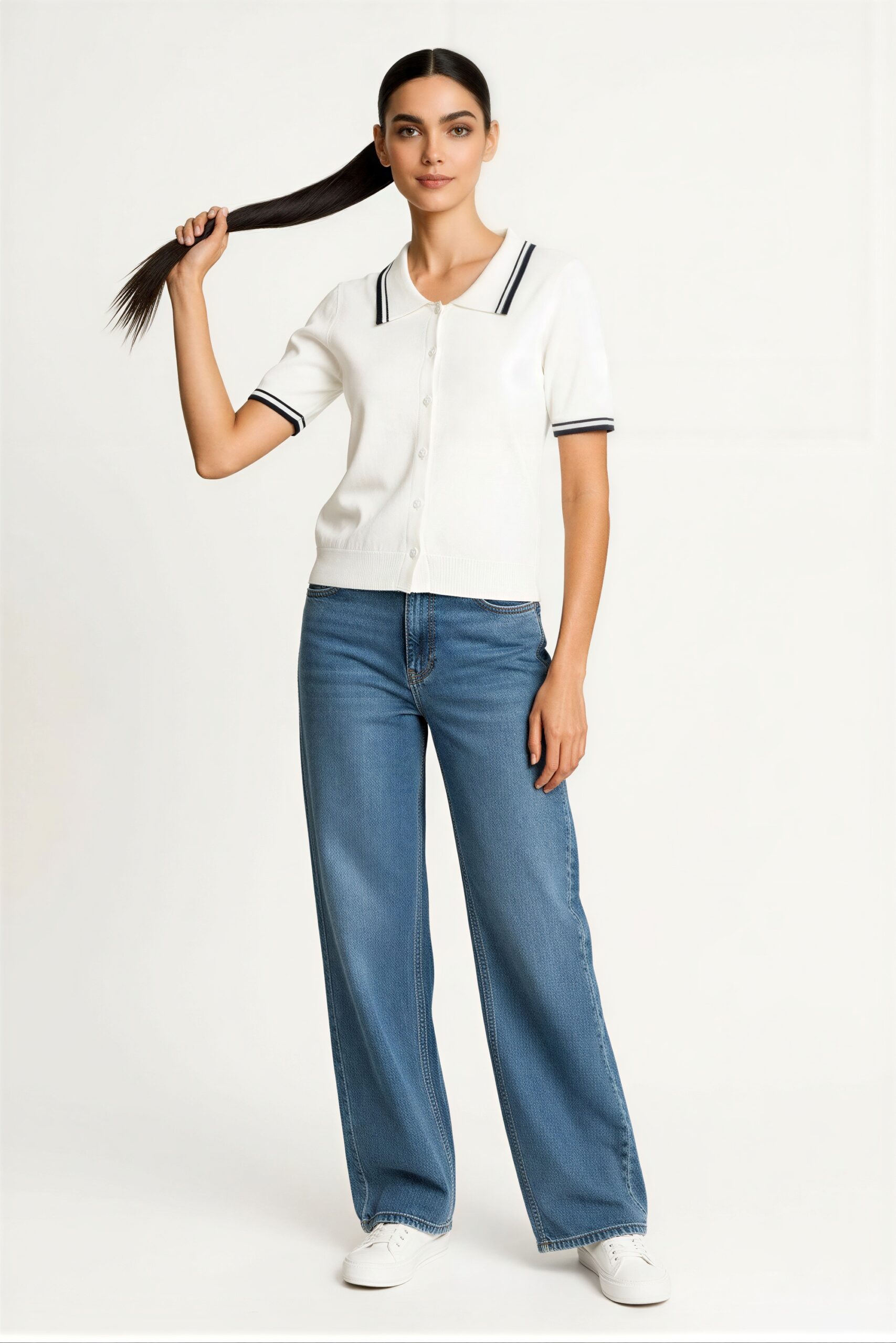 Suéter de manga corta con cuello tipo polo y botonadura frontal, tejido ligero, ajuste cómodo, terminado recto