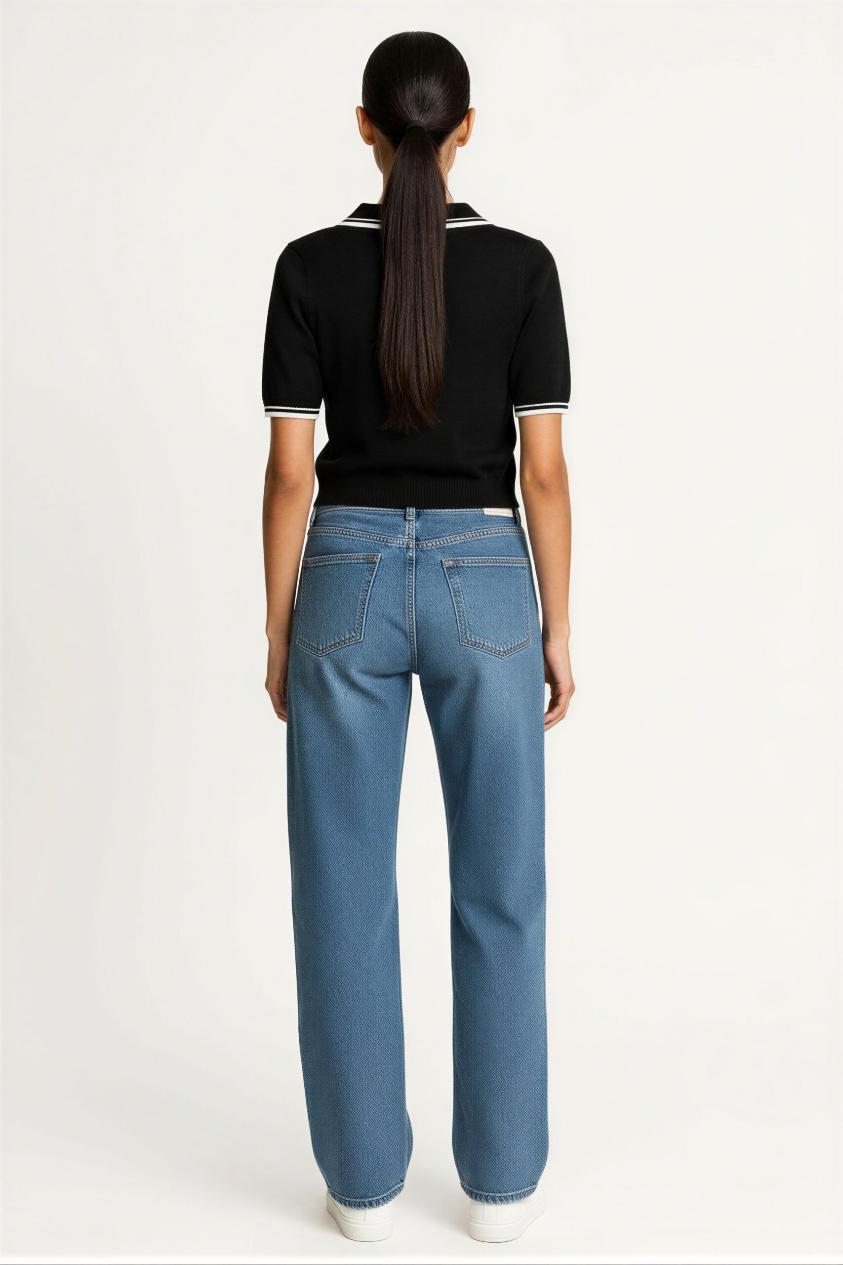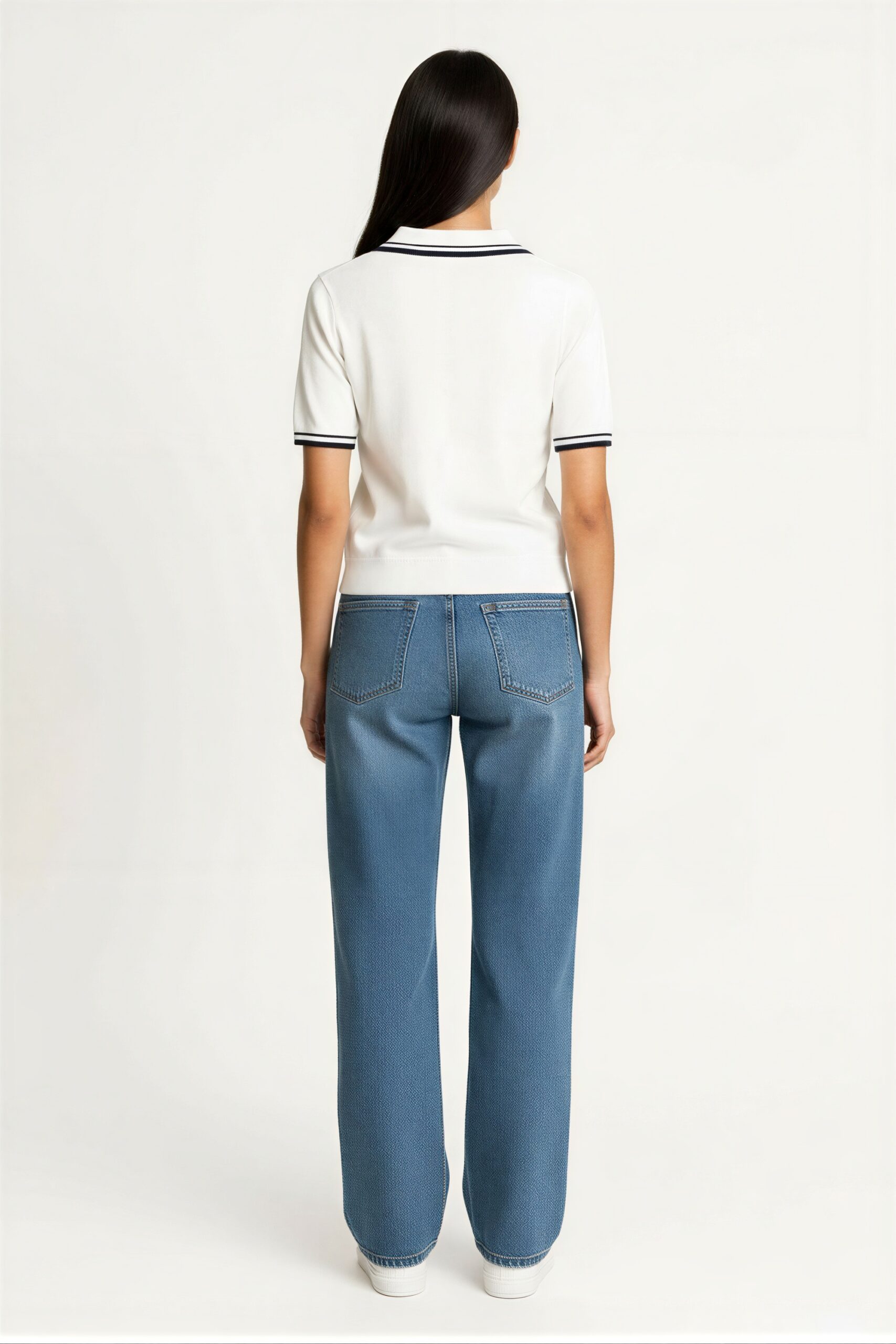Suéter tipo polo tejido de manga corta con estructura entallada, cuello camisero con acabado definido y escote en V que estiliza el torso, detalles en contraste en cuello mangas y bajo que aportan definición visual, tejido ligero de punto fino con textura uniforme y caída suave al cuerpo