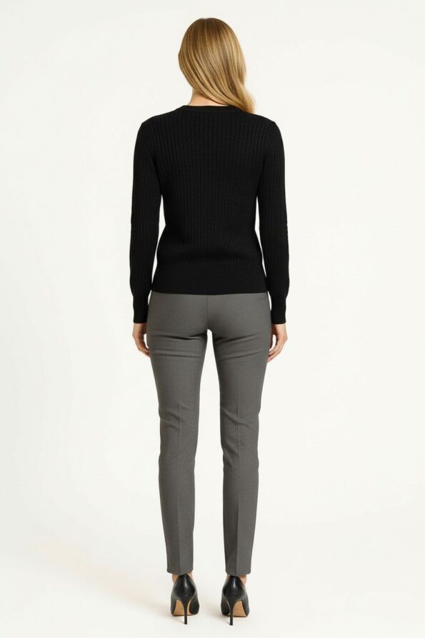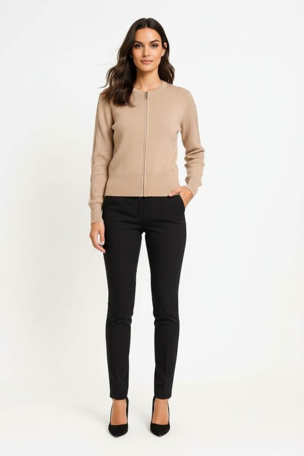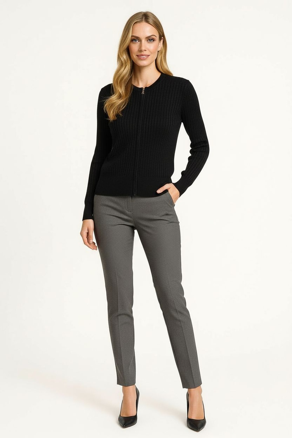 Suéter de manga larga con cierre frontal oculto que aporta un acabado moderno y práctico, cuello redondo clásico que brinda comodidad y versatilidad, confección en tejido acanalado que ofrece elasticidad y ajuste favorecedor, puños y dobladillo reforzados que mantienen la estructura definida de la prenda, diseño ligero y funcional ideal para el uso diario