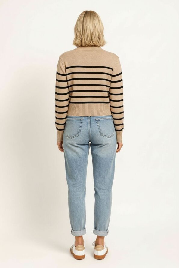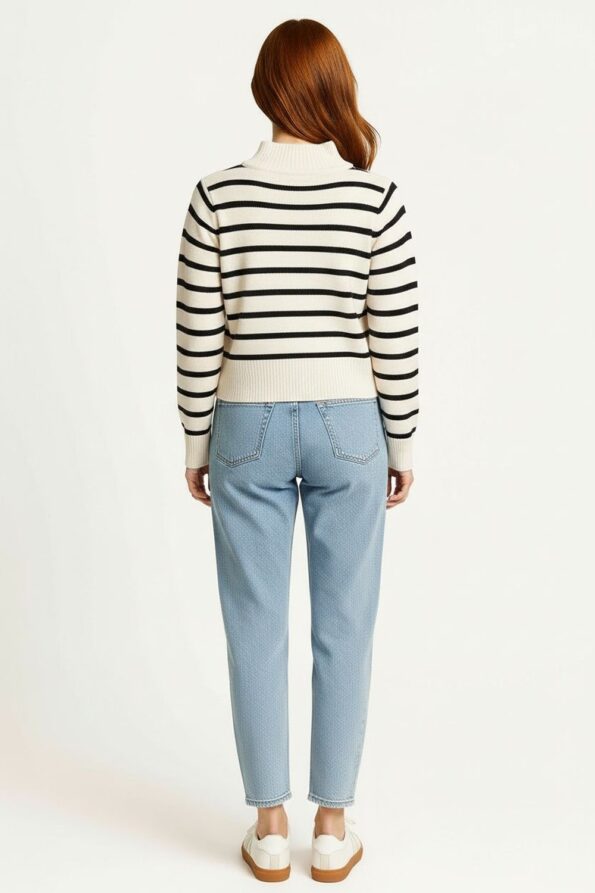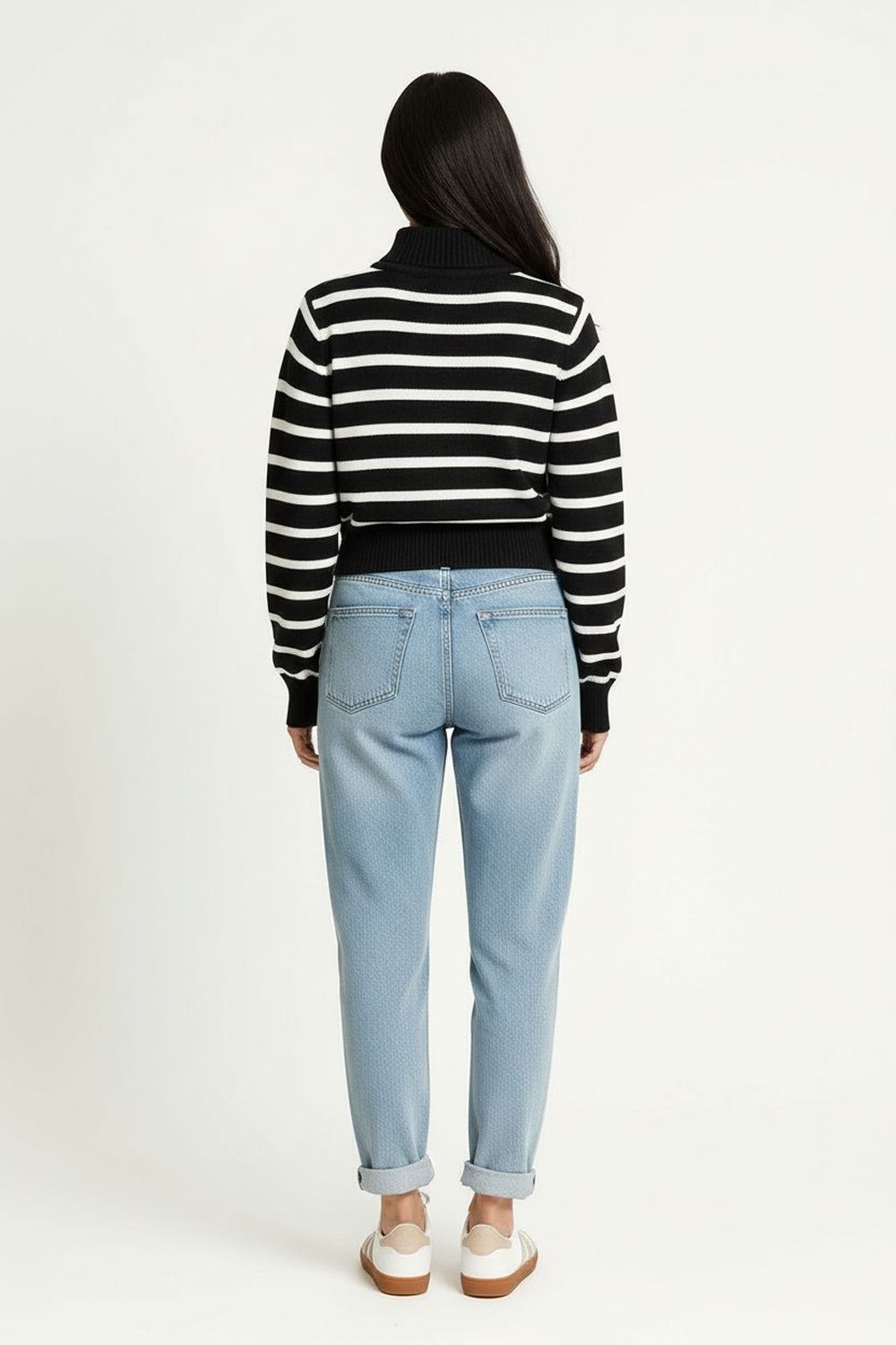 Suéter crop top sin mangas de tejido canalé con diseño de rayas anchas que aporta un estilo moderno y llamativo cuello alto tejido que estiliza la parte superior y agrega un toque sofisticado ajuste entallado que marca la silueta sin perder comodidad ideal para outfits casuales con vibe minimalista, looks streetwear modernos