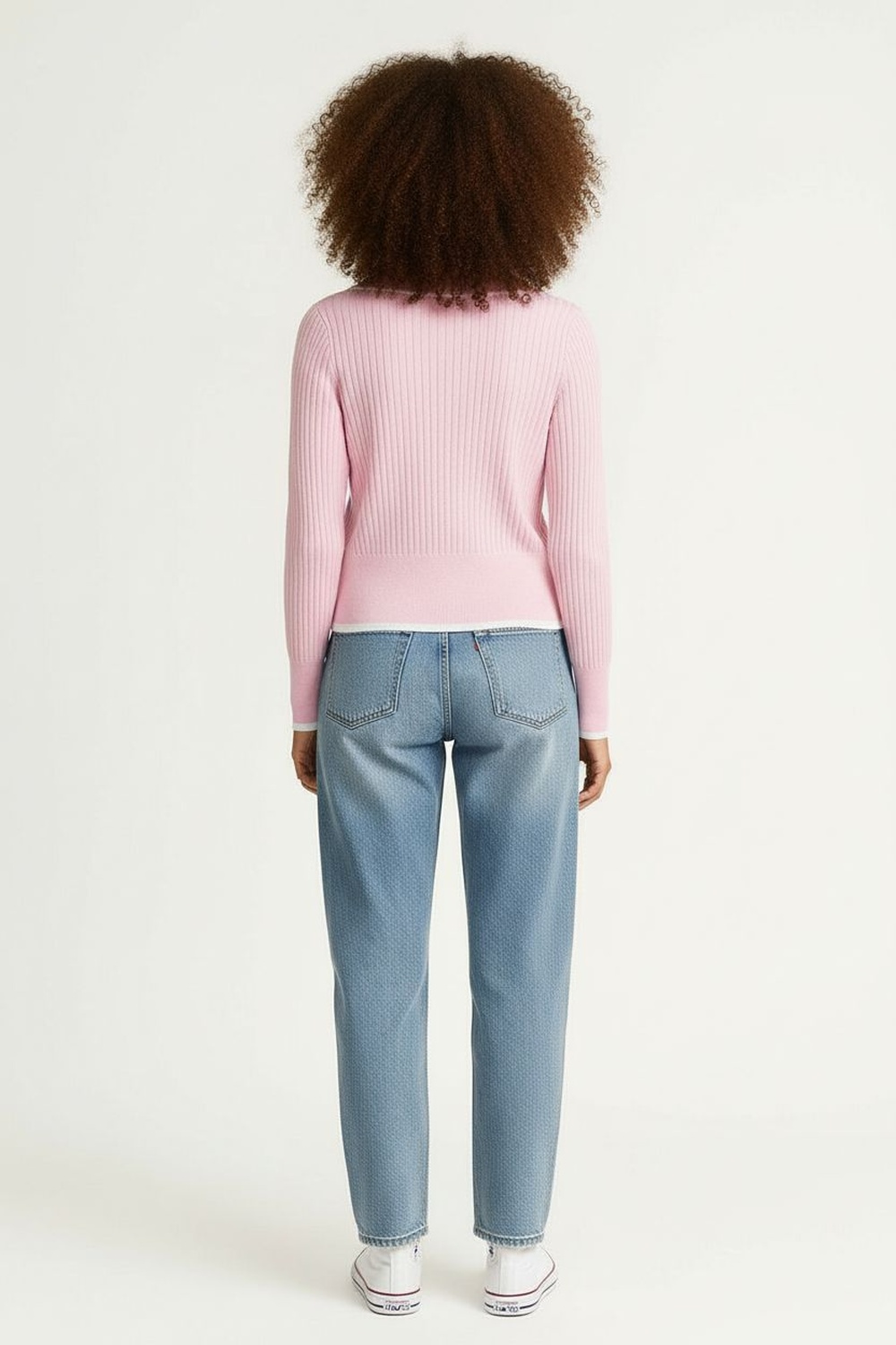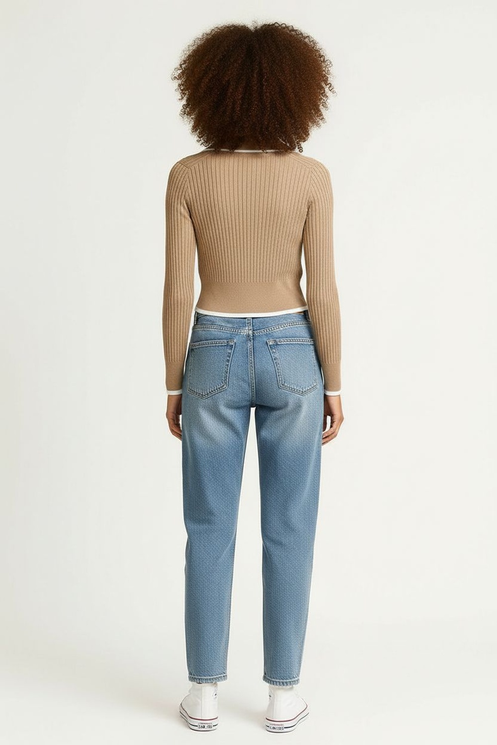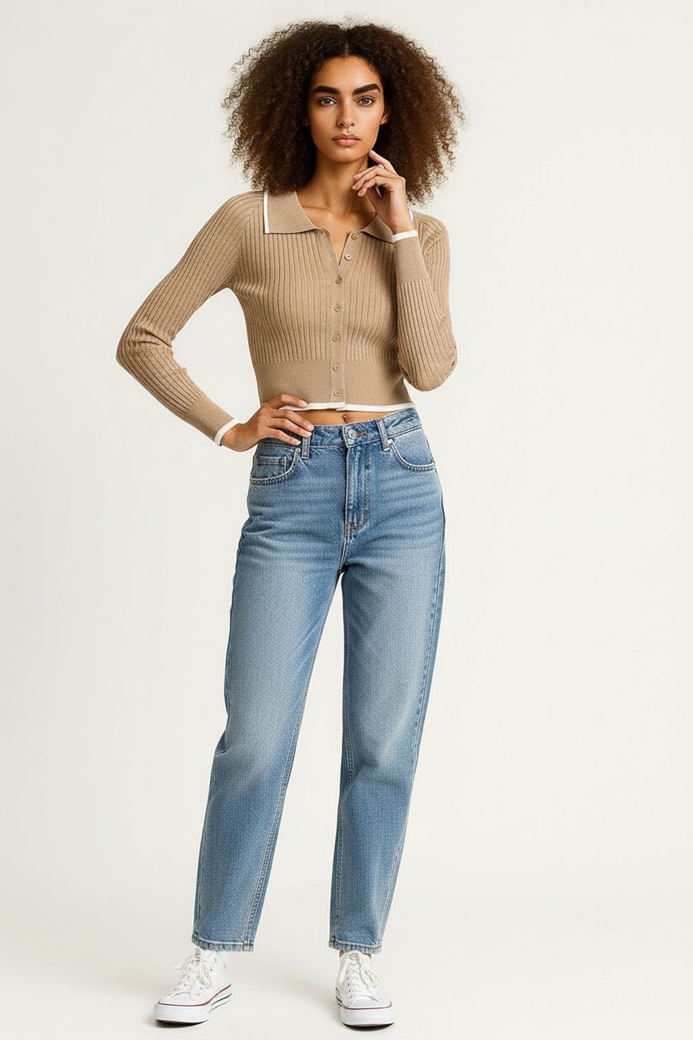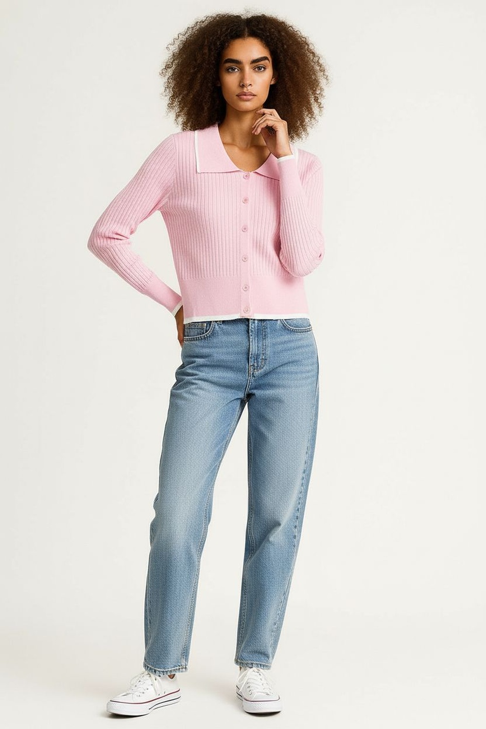 Suéter de manga larga confeccionado en tejido fino con textura acanalada, cuello tipo camisero con contraste que resalta el diseño, botonadura frontal que permite ajuste cómodo y personalizado, silueta corta con estructura ligera que aporta comodidad y estilo casual