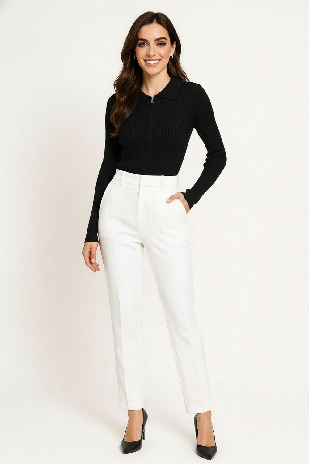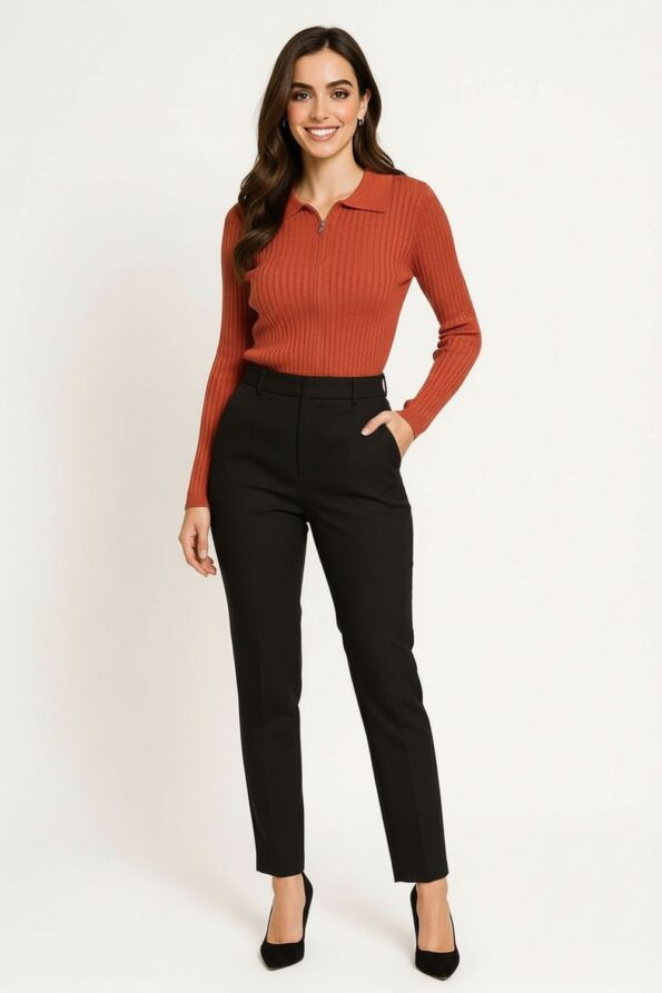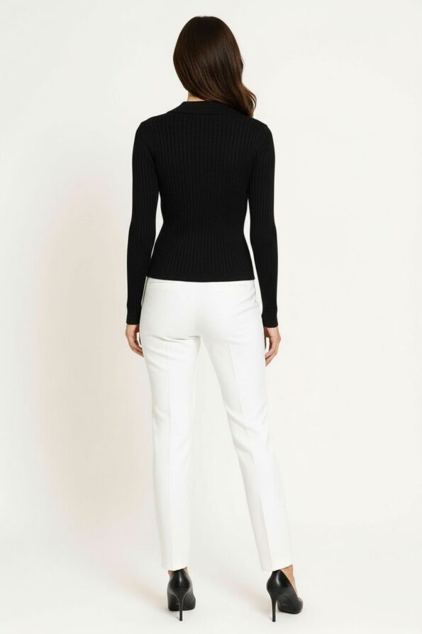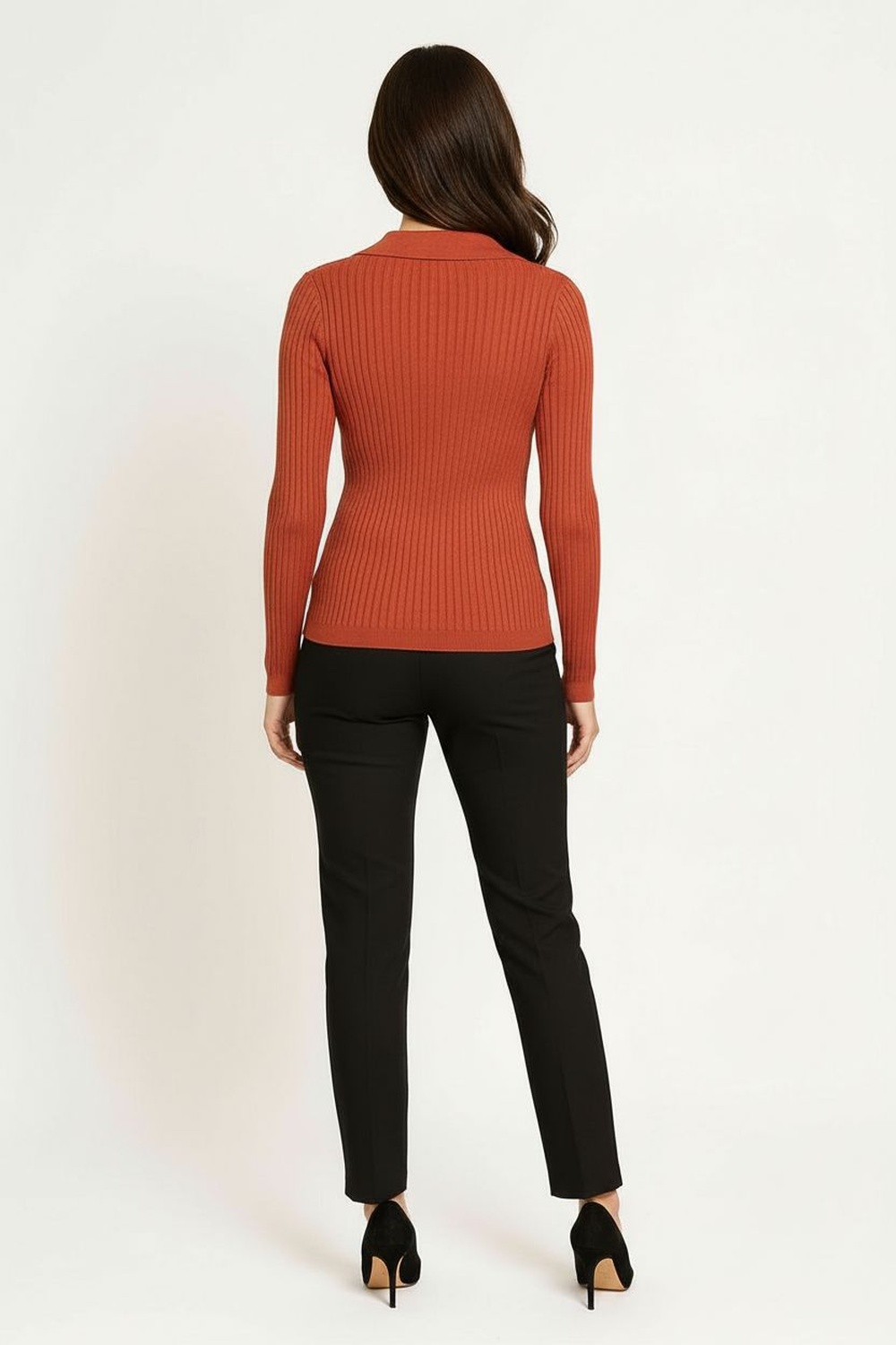 Suéter de manga larga con cuello camisero que aporta un estilo moderno y elegante, cierre frontal con cremallera que permite ajustar el escote, confección en tejido acanalado que ofrece elasticidad y confort, diseño ajustado que realza la silueta y terminaciones en rib que brindan estructura al conjunto