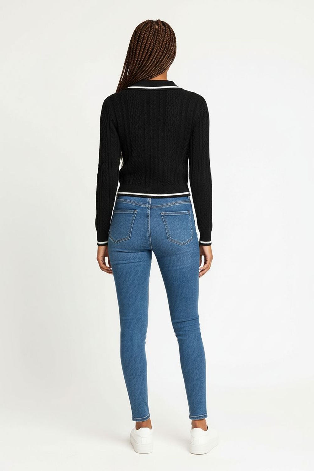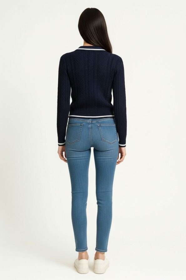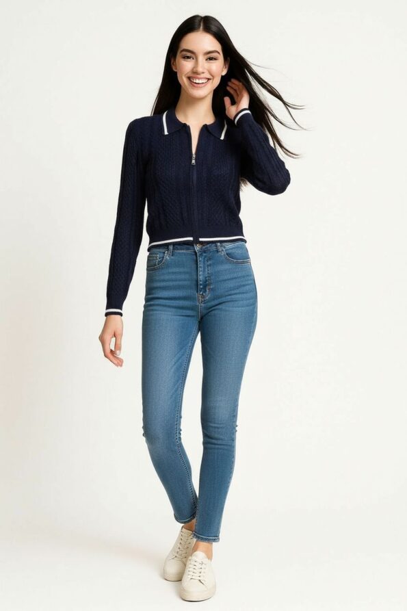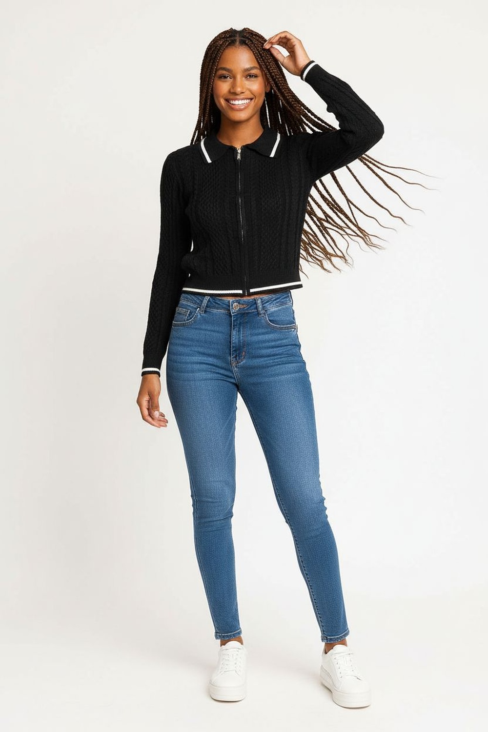 Suéter tejido con cuello camisero que aporta un estilo clásico y moderno, cierre frontal metálico que facilita el ajuste y añade un toque funcional, detalles en contraste tipo bies en cuello, puños y basta que realzan el diseño, confección en tejido de punto suave y elástico que brinda comodidad y ajuste favorecedor al cuerpo
