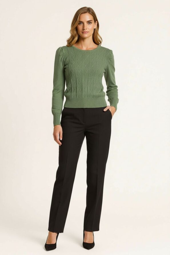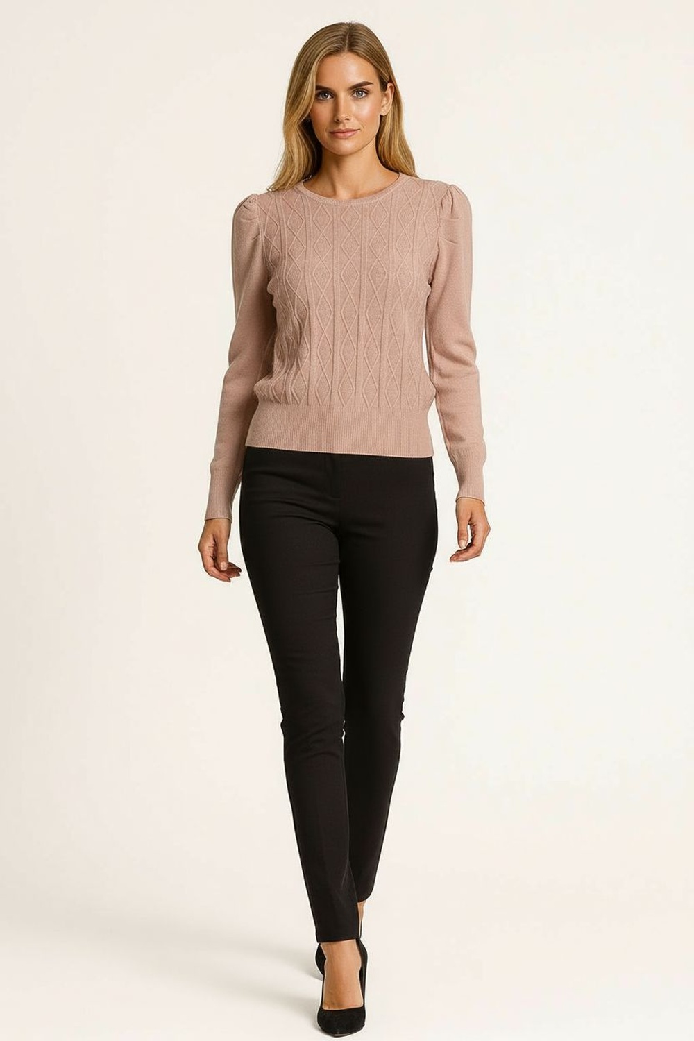Suéter de manga larga con cuello redondo, confeccionado en tejido de punto con patrón de rombos que aporta textura y elegancia, hombros ligeramente fruncidos que añaden volumen y feminidad, ajuste al cuerpo que resalta la silueta, terminaciones finas que ofrecen un acabado prolijo y cómodo