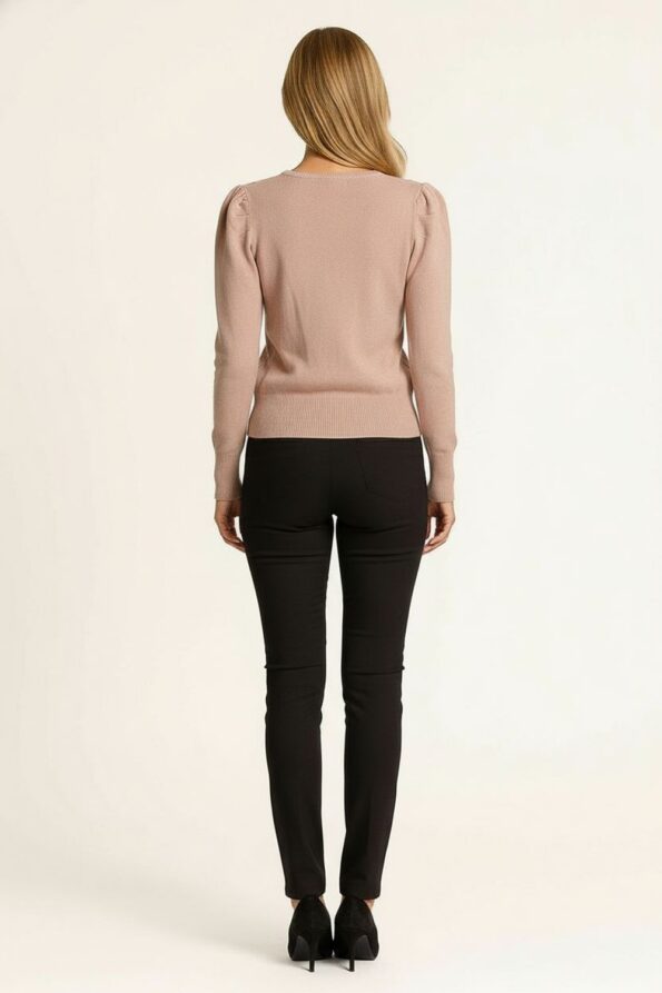 Suéter de punto fino en tono nude con silueta entallada y manga corta que abraza suavemente la figura su diseño destaca por un elegante detalle de pedrería plateada bordada alrededor del escote redondo simulando un collar tipo joya que eleva su estilo con un toque de brillo sutil ideal para ocasiones especiales o para dar un giro sofisticado a looks de oficina puede combinarse con un estilo formal