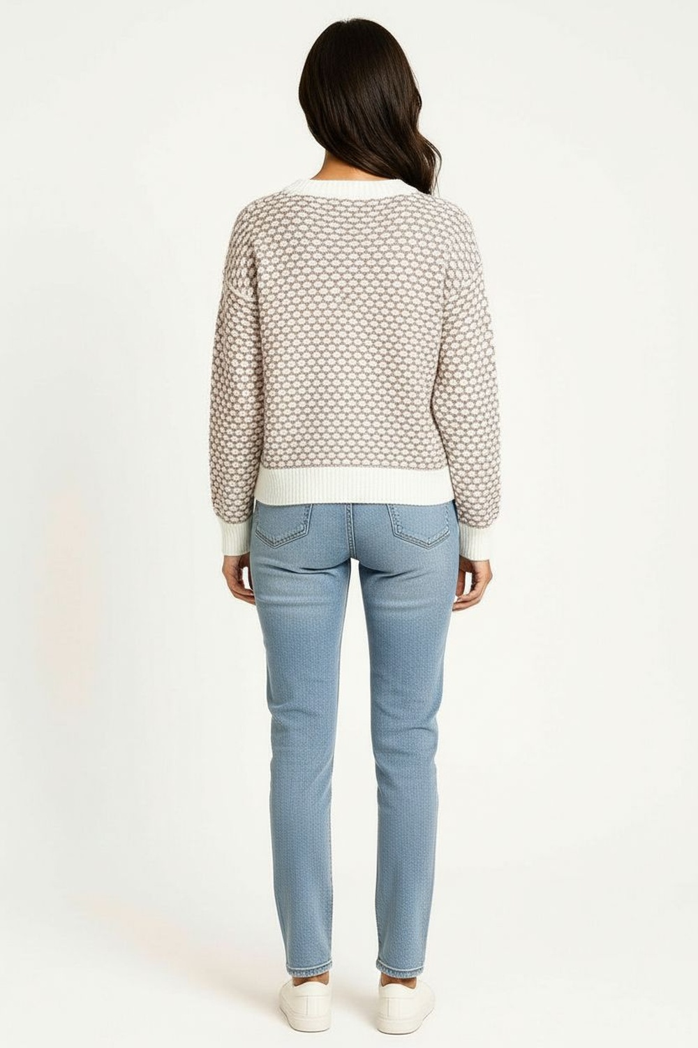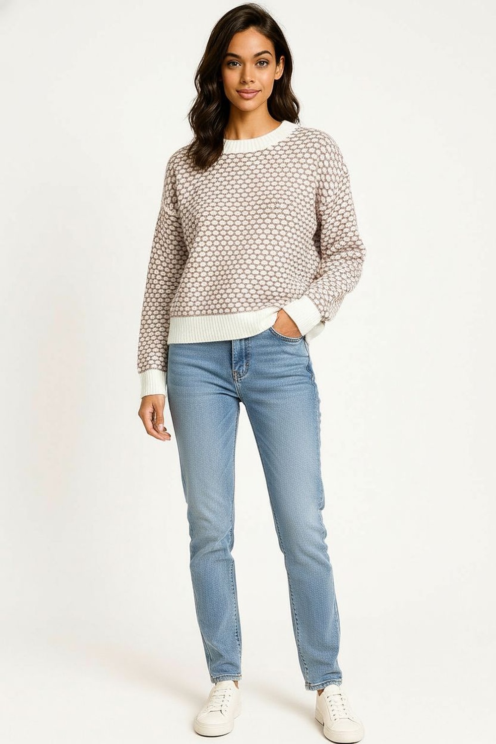 Suéter de cuello redondo con diseño tejido tipo panal que aporta volumen y textura, mangas largas con puños elásticos y dobladillo en cintura para mejor ajuste, confección en punto suave y ligero que ofrece comodidad térmica durante el día