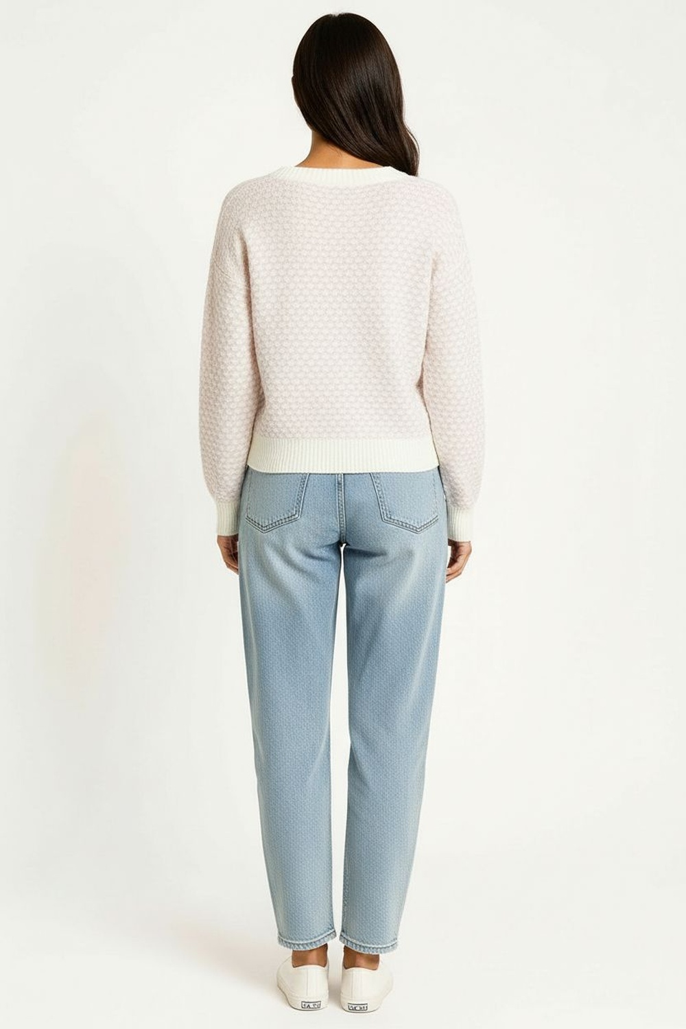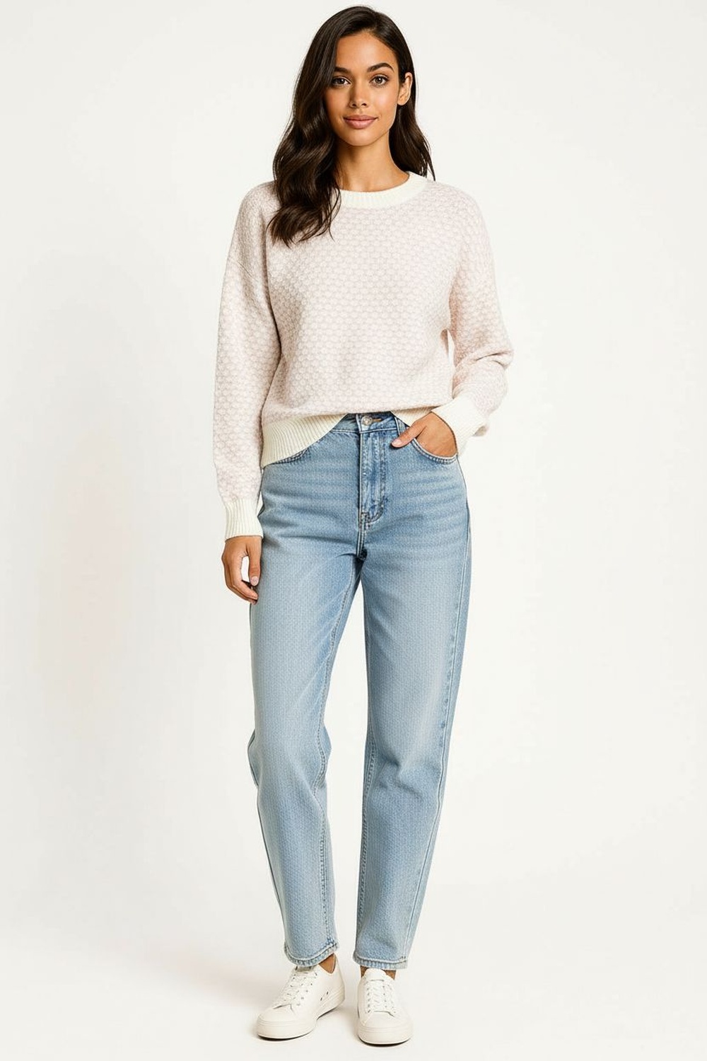 Suéter de cuello redondo con textura tipo canasta que añade relieve al diseño, manga larga con puño elástico que favorece el ajuste, basta con terminación ajustada que define la silueta, confección en tejido suave y resistente que mantiene su forma y tacto confortable