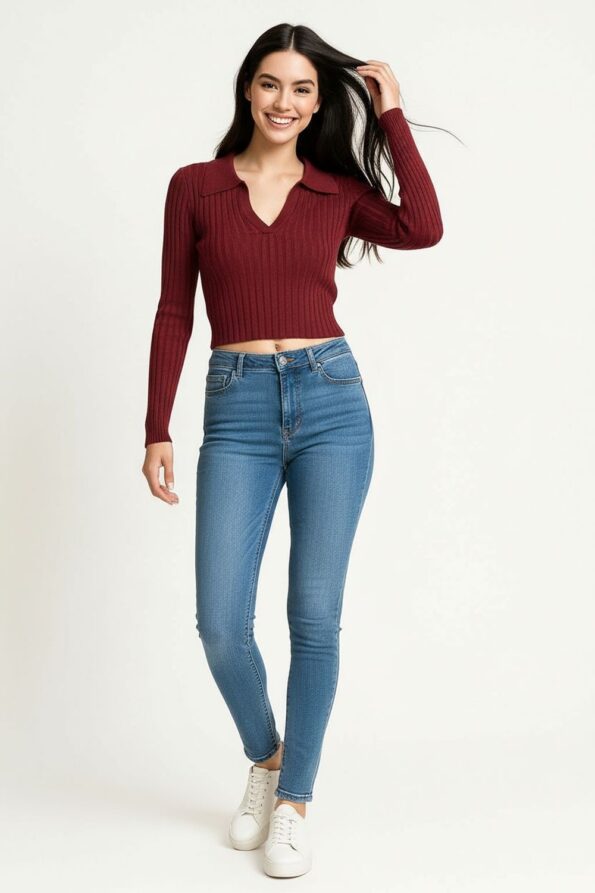 Suéter corto de manga larga con cuello camisero que aporta un estilo moderno, confección en tejido acanalado de viscosa ligera que ofrece suavidad y elasticidad, diseño ajustado que realza la figura, terminaciones en rib que brindan estructura al contorno, ideal para un look contemporáneo y juvenil