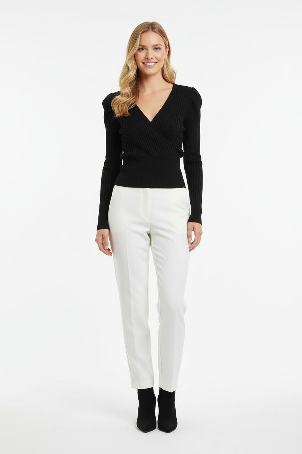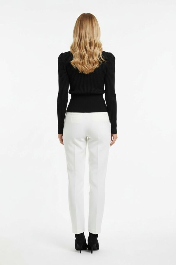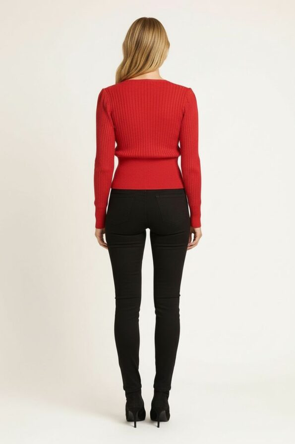 Suéter de manga larga confeccionado en tejido rib con escote en V cruzado que estiliza la figura, pretina ancha en punto elástico que brinda ajuste cómodo y favorecedor, silueta ceñida que realza la forma del cuerpo, costuras reforzadas que aportan resistencia y durabilidad en su uso