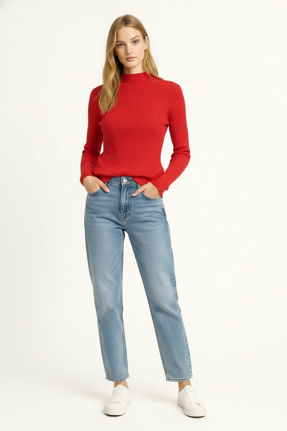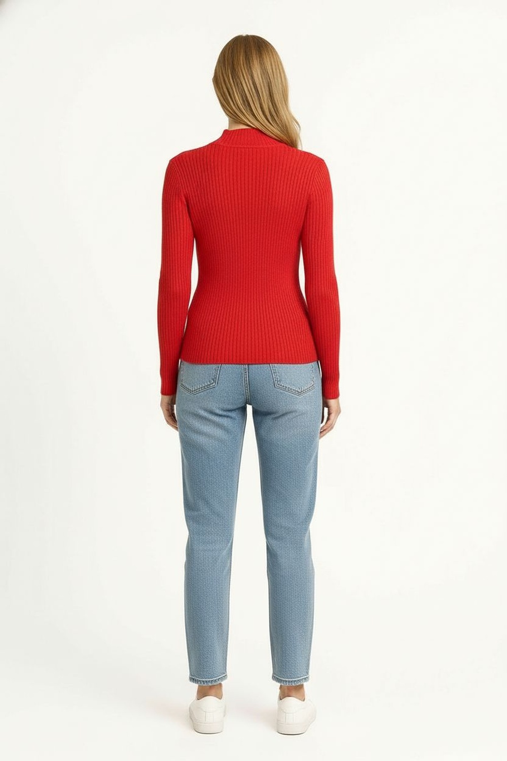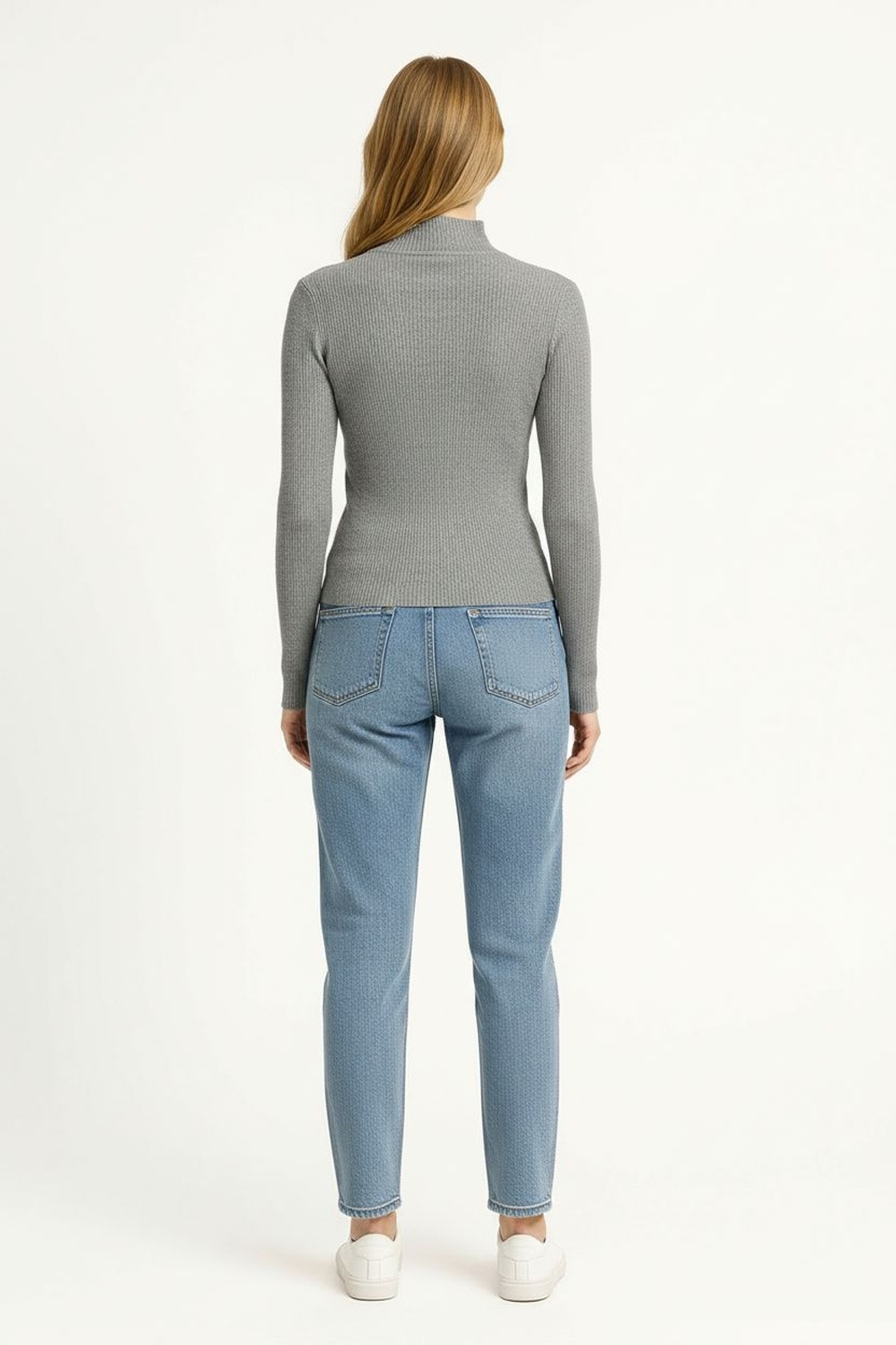 Suéter de manga larga con cuello alto que brinda calidez y estilo, tejido acanalado que se ajusta al cuerpo, diseño clásico con terminados limpios y textura suave que aporta confort, ideal para looks de temporada