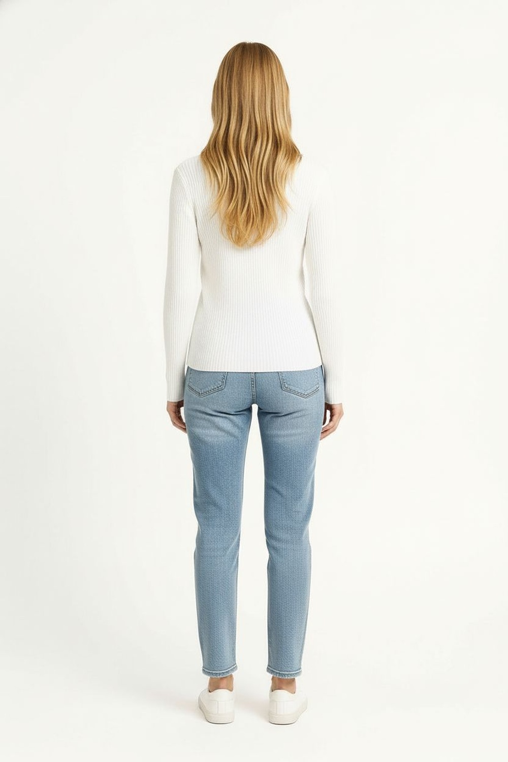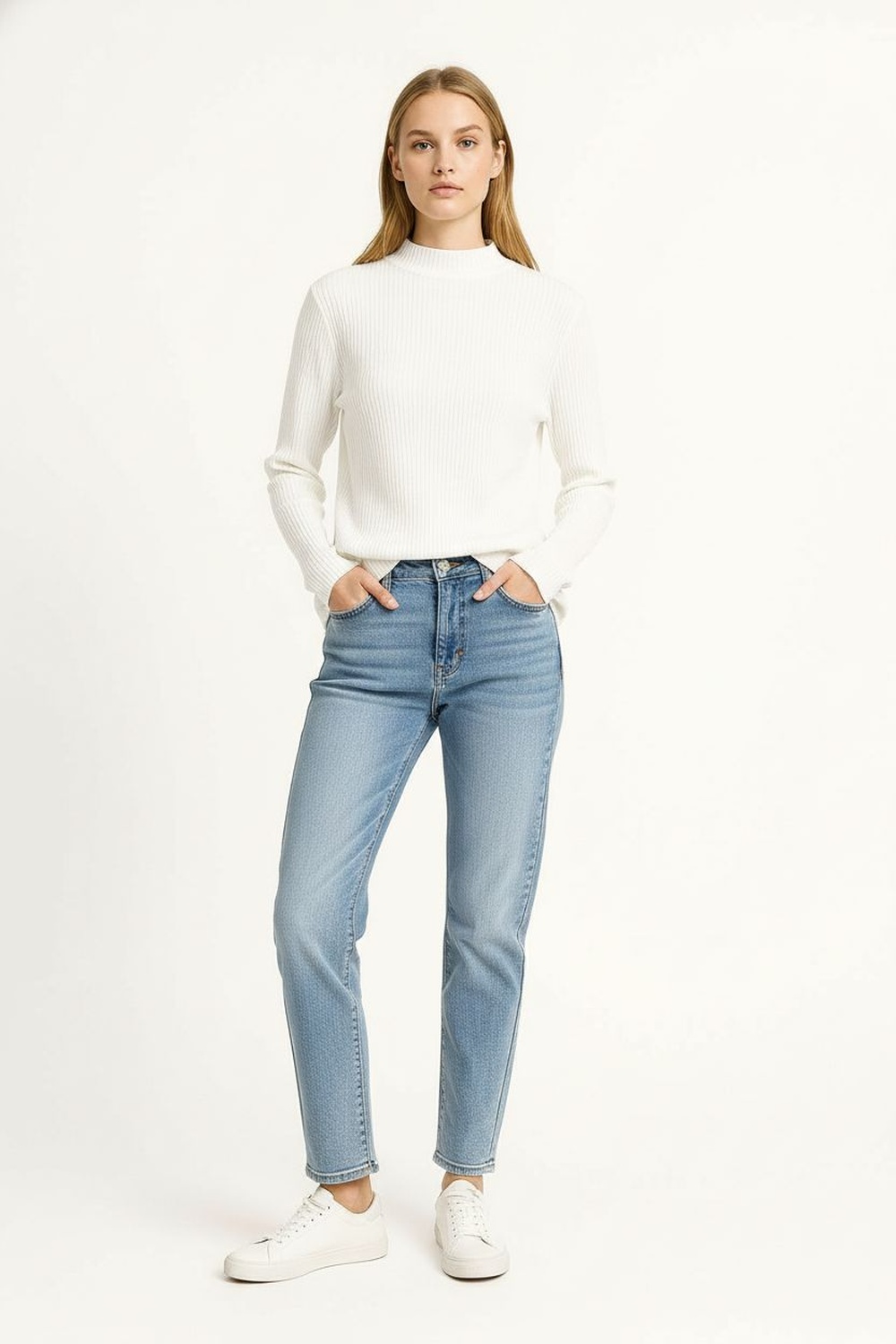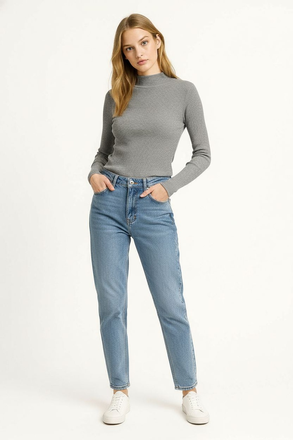 Suéter de manga larga con cuello alto que brinda calidez y estilo, tejido acanalado que se ajusta al cuerpo, diseño clásico con terminados limpios y textura suave que aporta confort, ideal para looks de temporada