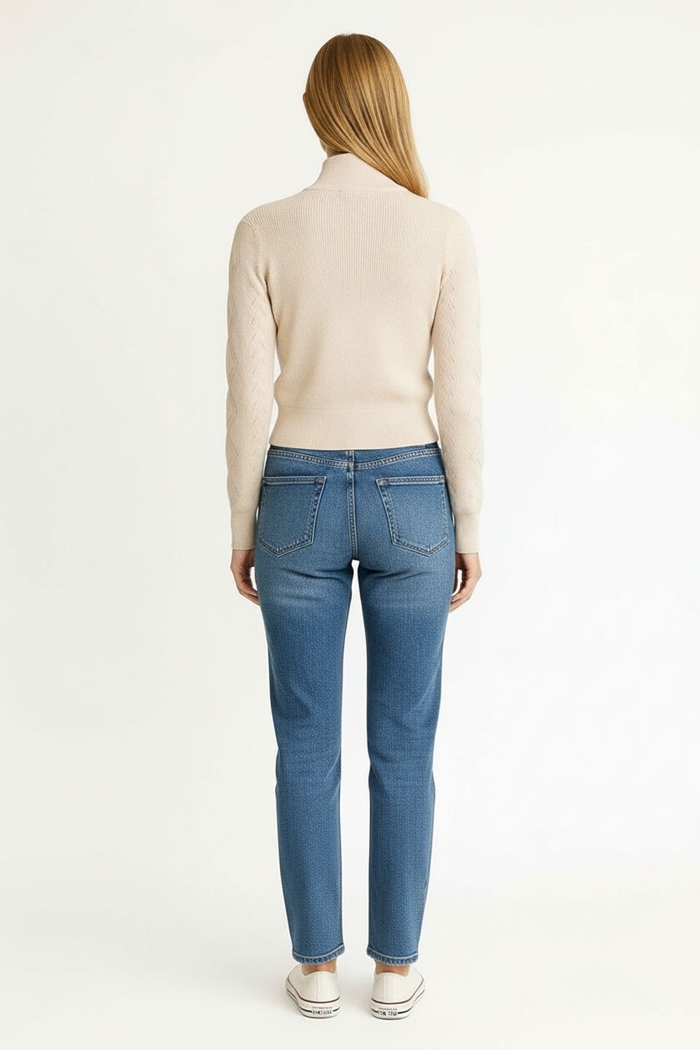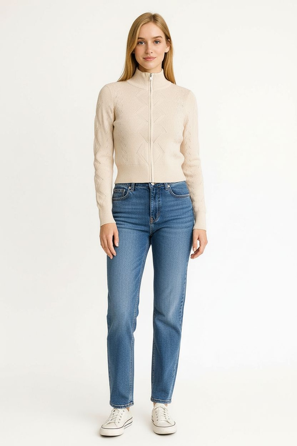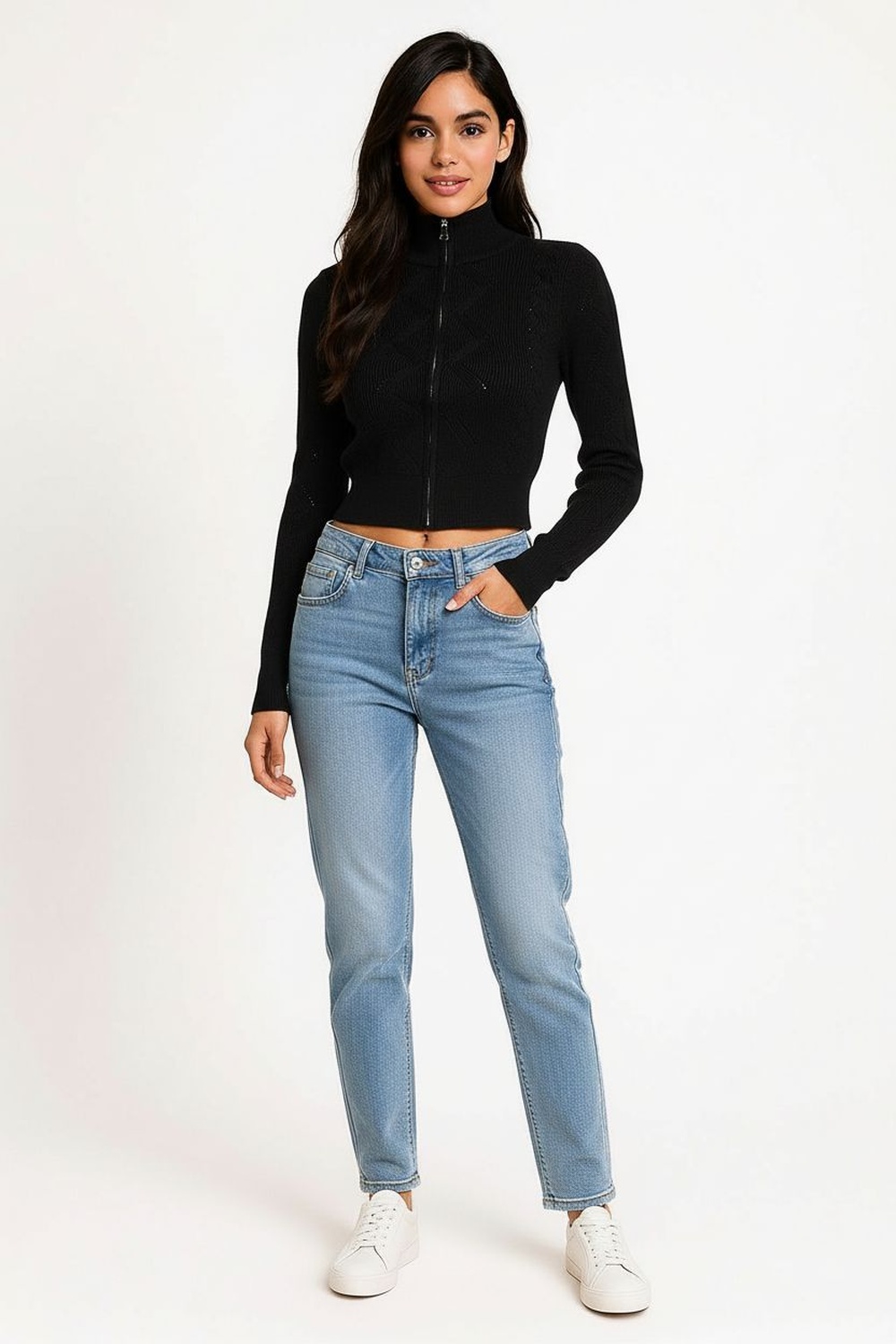 Sueter tejido con cuello alto y cierre frontal, diseño entallado que realza la figura, tejido con relieve fino que aporta textura y elasticidad, terminaciones acanaladas en puños y cintura para un ajuste cómodo y definido