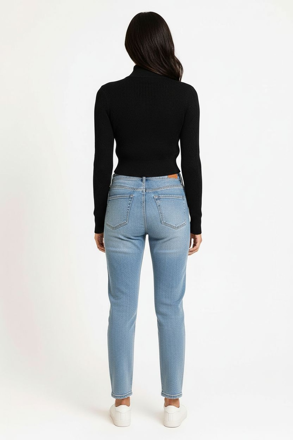 Suéter de manga larga confeccionado en tejido de punto acanalado que aporta textura y elasticidad, cuello alto que brinda un acabado moderno y elegante, diseño ajustado al cuerpo que realza la silueta, largo a la cintura que favorece un estilo actual y versátil, acabado en puños y basta que asegura durabilidad y un mejor ajuste