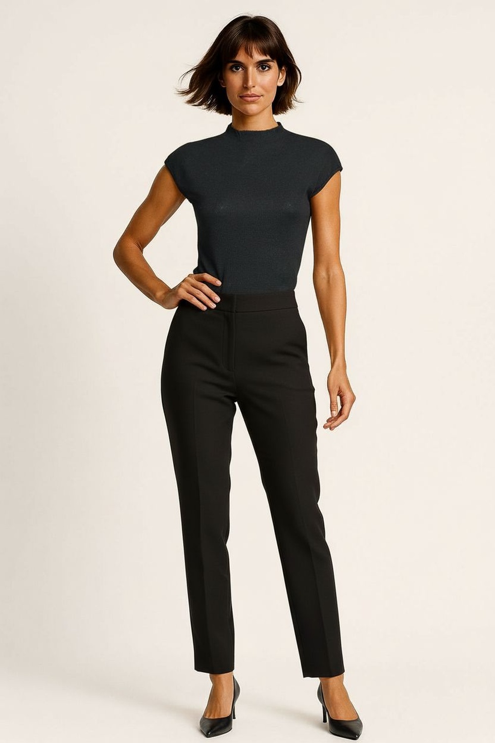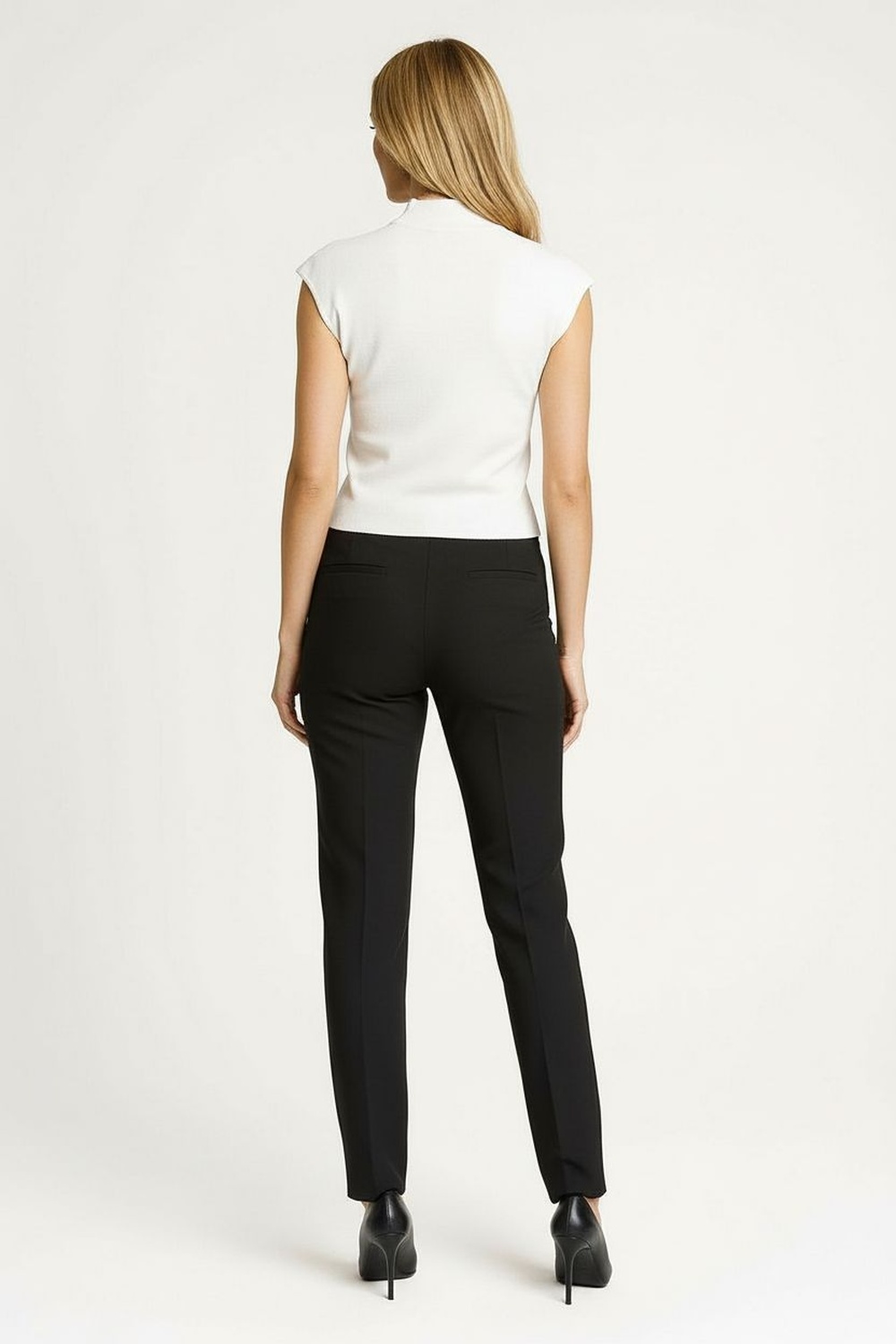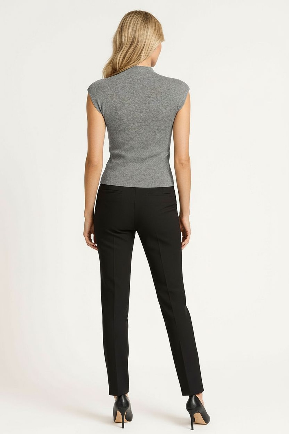 Suéter sin mangas con cuello alto, tejido de punto fino, acabado en bordes limpios, estructura ligera, ajuste al cuerpo