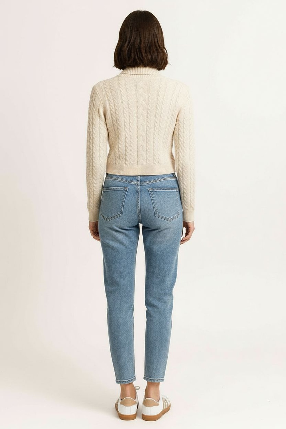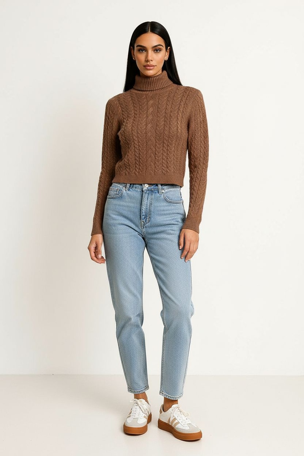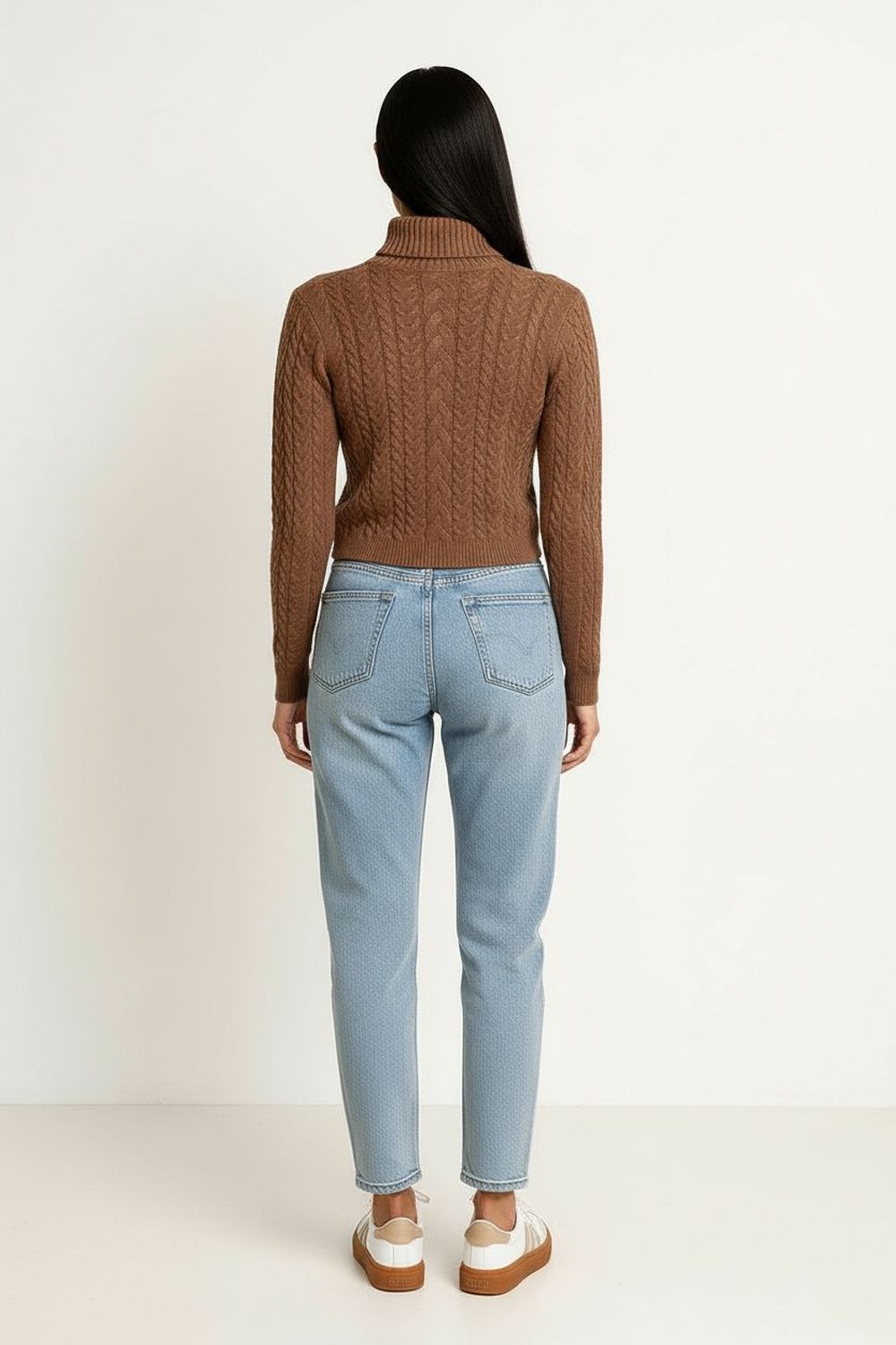 Suéter de cuello alto con diseño trenzado en relieve, manga larga y ajuste al cuerpo que estiliza la silueta, pretina y puños elásticos que aportan estructura, tejido de viscosa con acabado suave y flexible que proporciona confort y calidez